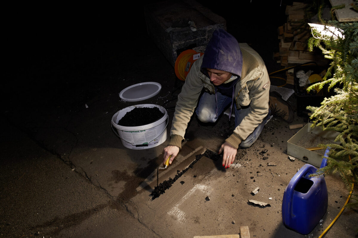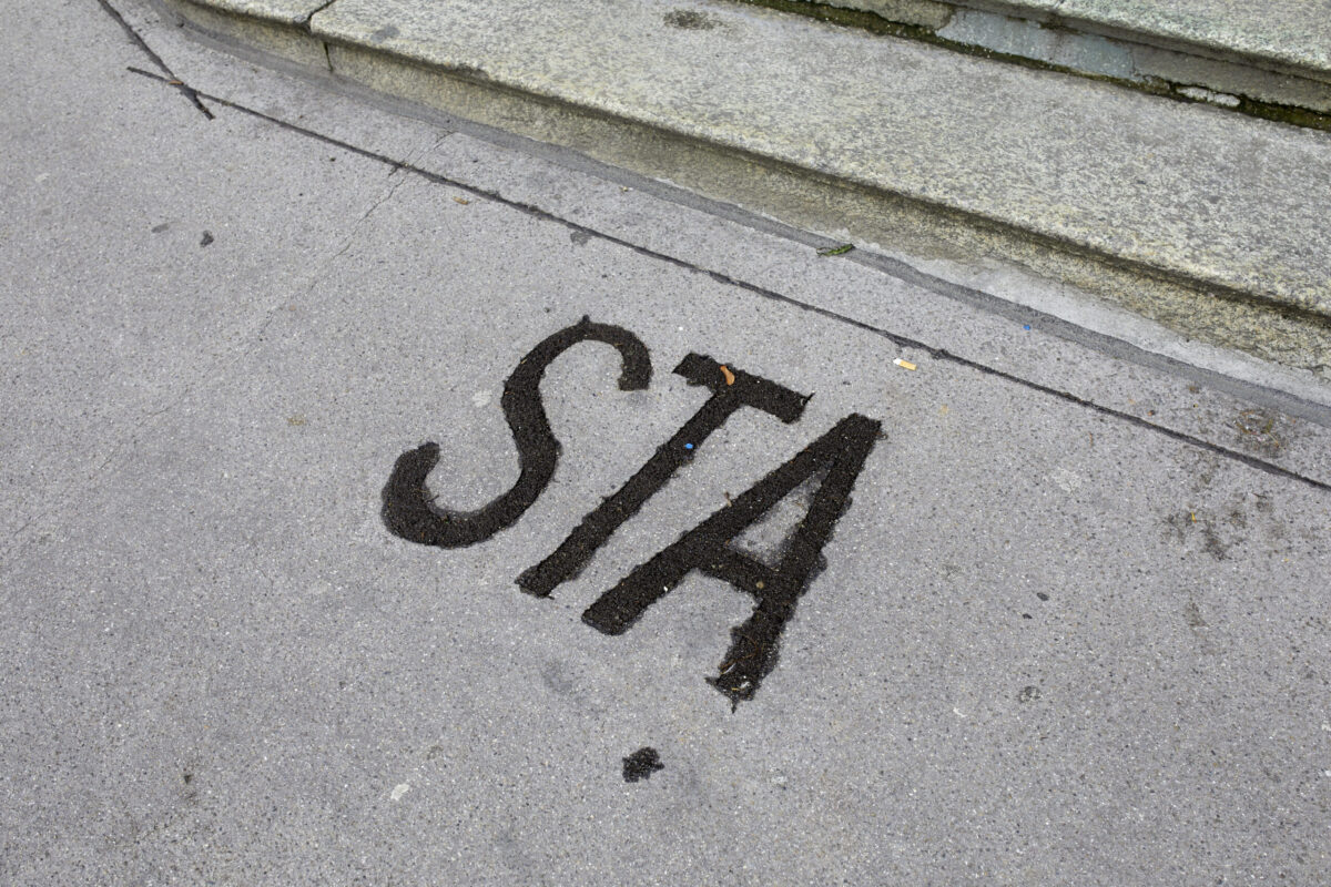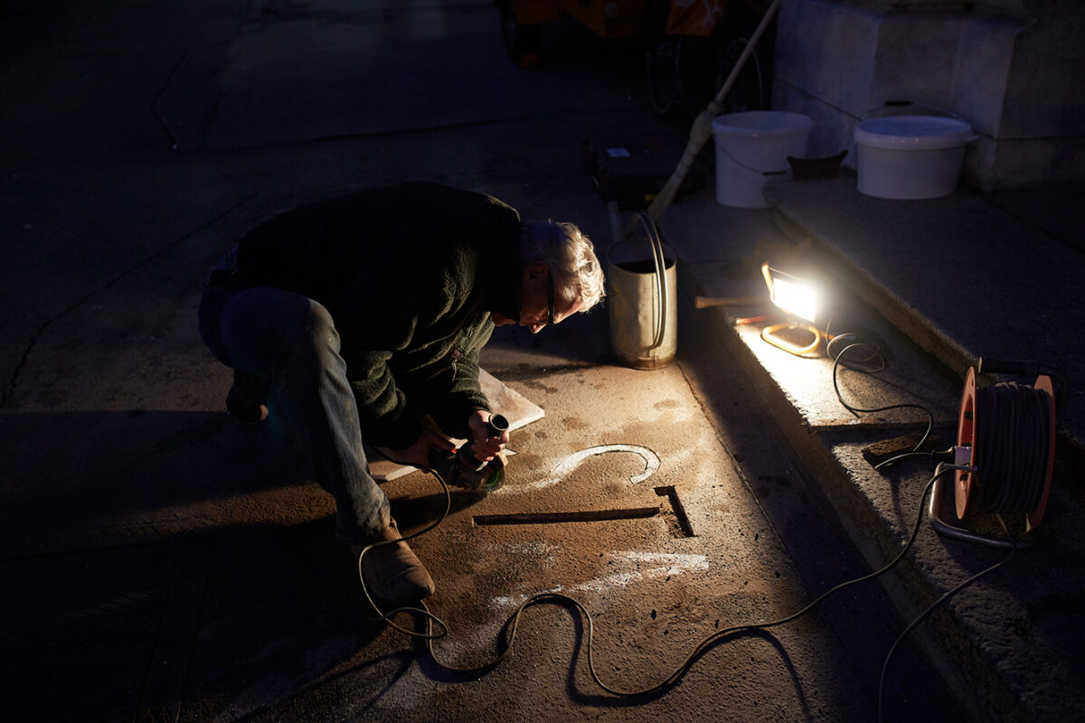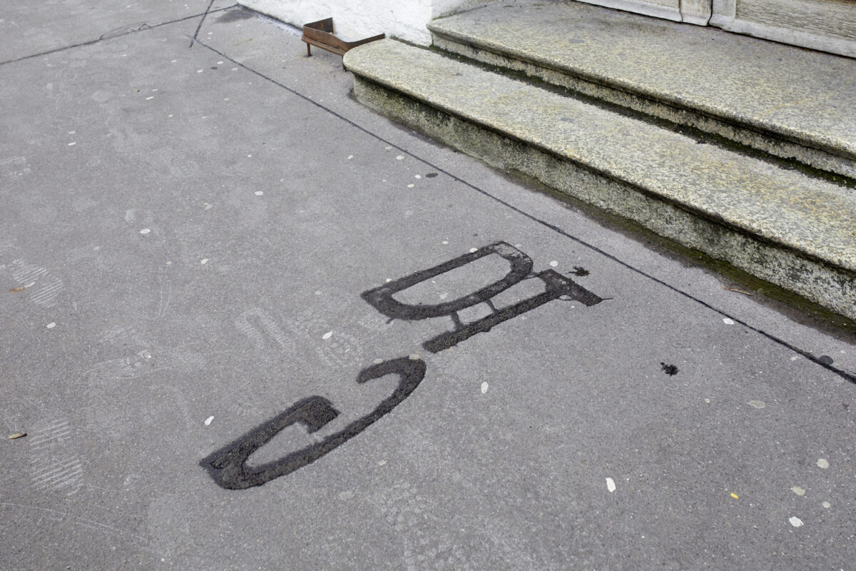 Während der Vernissage wird mit Exit Strategie der Schriftzug der Stadtgalerie an den vier möglichen Eingängen zur Stadtgalerie in den Boden gefräst. RONNY HARDLIZ (*1971 in Bern, lebt und arbeitet in Bern) hat dafür die Kunstschaffenden Miriam Sturzenegger, Niklaus Wenger und Bernhard Huwiler zur Mithilfe eingeladen. Der handwerkliche Vorgang ist der Bildhauerei nahe, der Eingriff an sich kann der Performance zugeordnet werden. Daraus resultiert eine bewegte Skulptur, die nach der Eröffnung wieder verschwinden wird. Das herausgeschnittene Logo wird wieder mit Asphalt aufgefüllt, nur die ausgefransten Ränder erinnern im Nachhinein noch an das Ereignis.