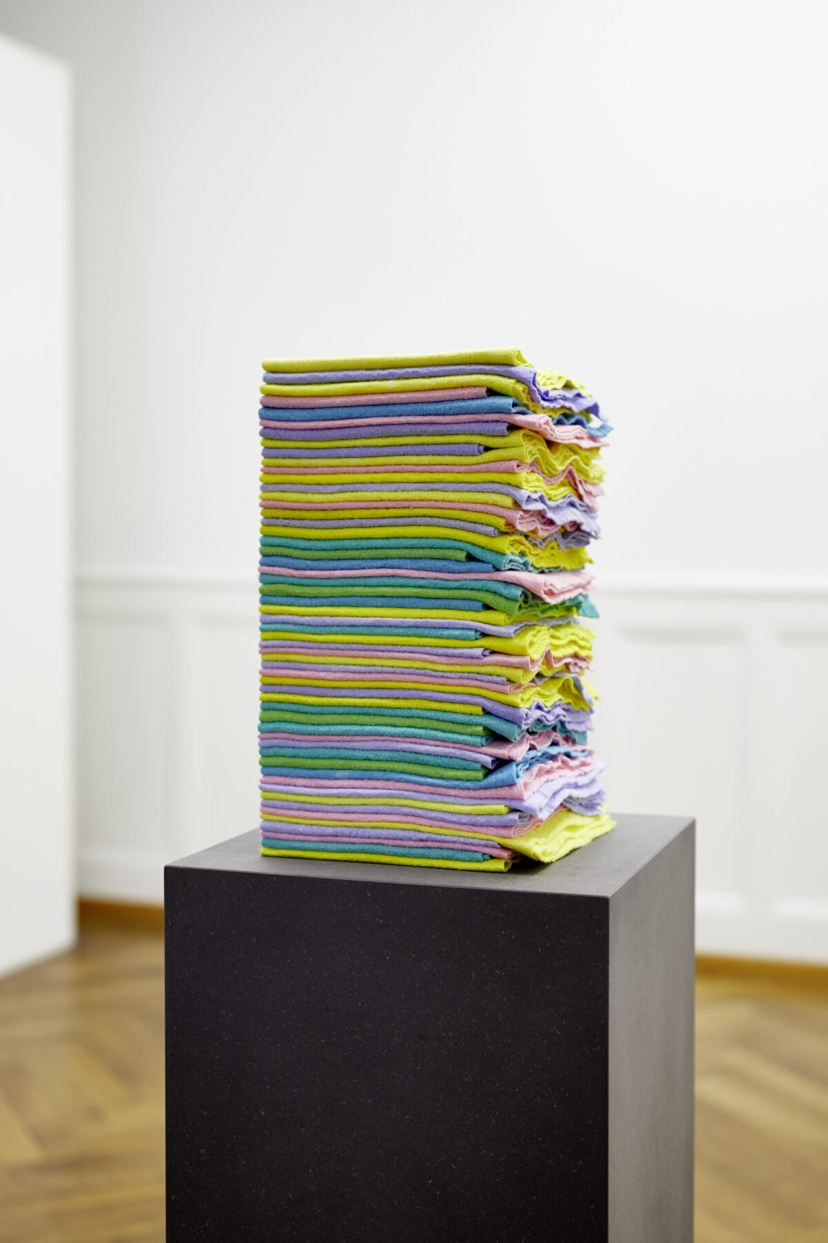 ALAIN JENZER (*1974 in Vancouver, lebt und arbeitet in Bern) bedient sich für seine Installationen und Performances oft bei Gegenständen aus dem häuslichen Umfeld – wie Geschirr, Esswaren, Blumenkisten, Textilien oder Möbel. Beim zweckentfremdeten Einsatz der verwendeten Materialien interessieren ihn dem Häuslichen zugeordnete Tätigkeiten, soziale Prozesse, gesellschaftliche Zuschreibungen, vorherrschende Geschlechterrollen aber auch tatsächliche oder vermeintliche Absurditäten. Modell No. 1.2 besteht aus einem Stapel gebrauchter, gewaschener, gefalteter und farblich geordneter Mikrofasertücher und einem Sockel. Es erzählt von des Künstlers Beschäftigung mit dem Ausbalancieren von Spannung und Bewegung, Reibung und Harmonie. Jenzer verwendet dabei die Repetition als gestalterisches Element.