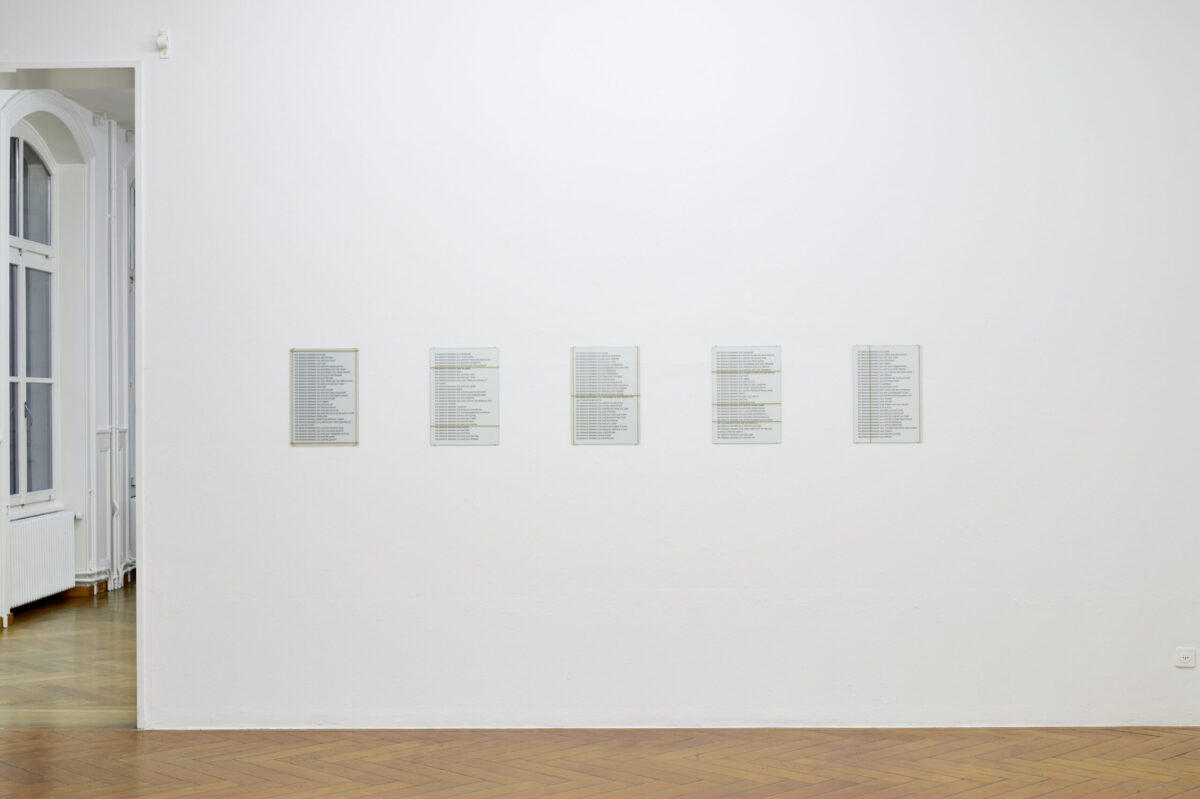 the distance between ist eine Serie von fünf Listen. Sie alle führen verschiedene Sätze auf, die stets mit «the distance between» beginnen und sich danach auf ein Objekt, Subjekt oder eine konzeptuelle Beziehung beziehen. JOHANNA KOTLARIS‘ (*1988 in Schaffhausen, lebt und arbeitet in Zürich) Arbeit interessiert sich für Begriffe wie Entfernung und Umgebung und wie sich Objekt- und Subjektbeziehungen im Fokus der Nähe verändern. Selbstverständliches wird durch die genaue Betrachtung intimer, während Fremdes näher rückt und Eigenes immer fremder wird.