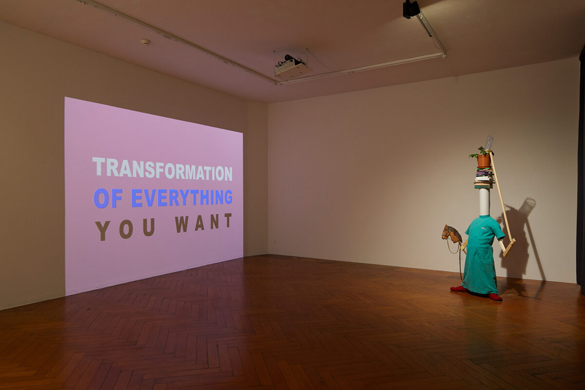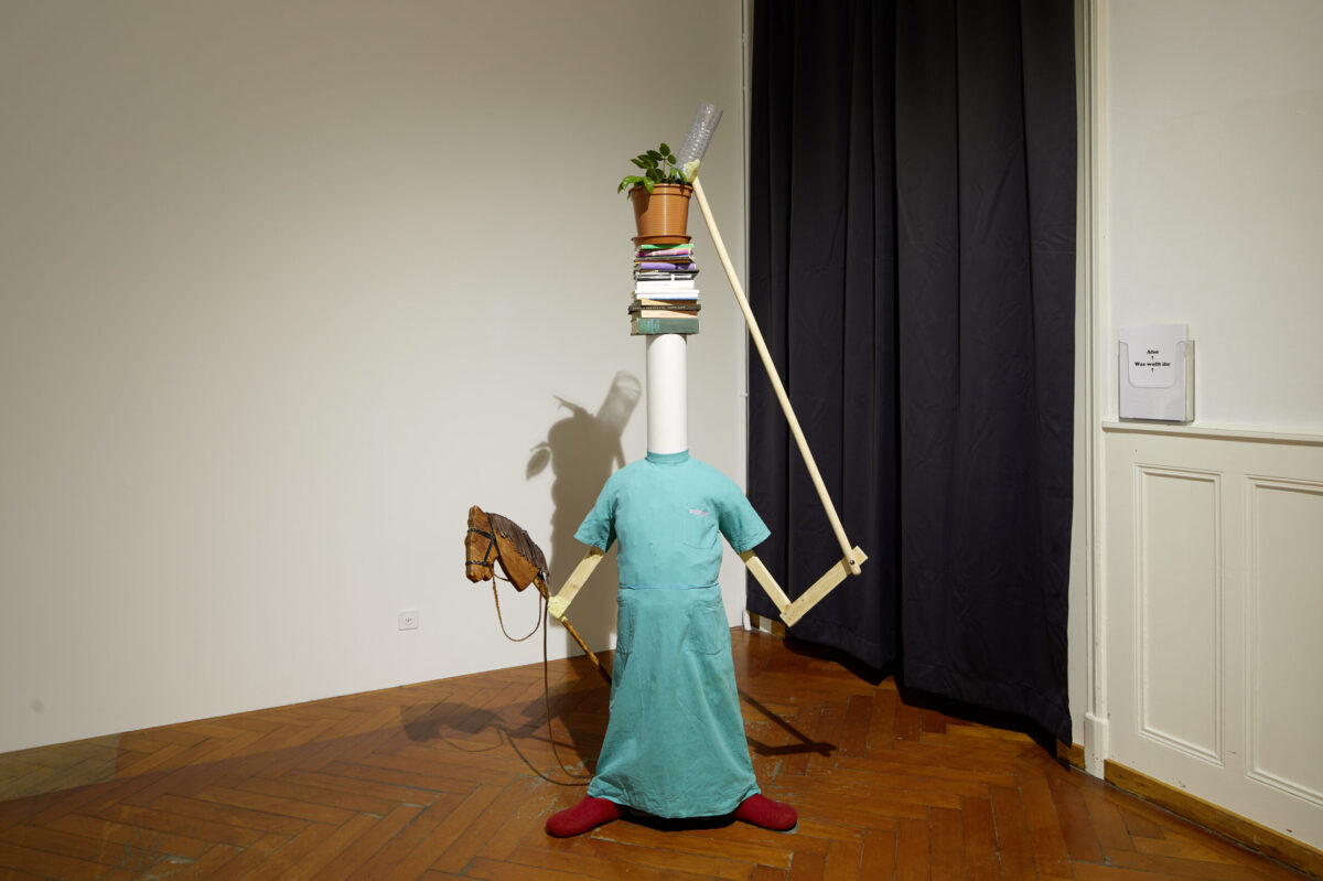 ELIA AUBRY (*1984 in Sevgein, lebt und arbeitet in Langenthal, Sevgein und Wien) beschreibt in seiner Arbeit Möglicher Lebensentwurf in einer Art methodischer Zusammenführung die Verbindung von Bewusstem und Unbewusstem. Humorvoll und absurd, aufbauend auf Recherchen rund um den Surrealismus, entstand diese skulpturale Collage aus Referenzen und Interpretationen. Auf dem langen Hals der Figur thronen 18 Bücher, die sich alle mit alternativen Lebenshaltungen beschäftigen. Aus jedem hat der Künstler einen Satz entnommen und daraus einen Text geformt, der neue Assoziations- und Wahrnehmungsräume eröffnen soll.