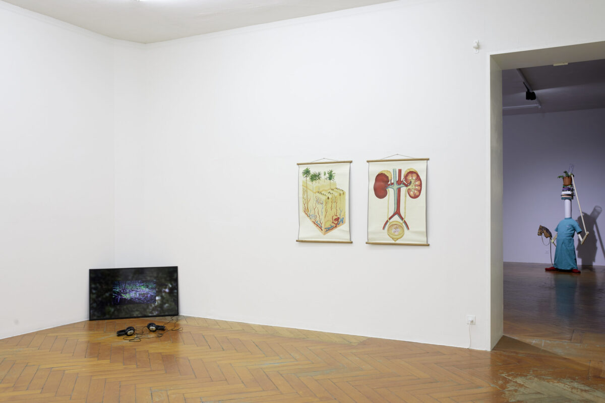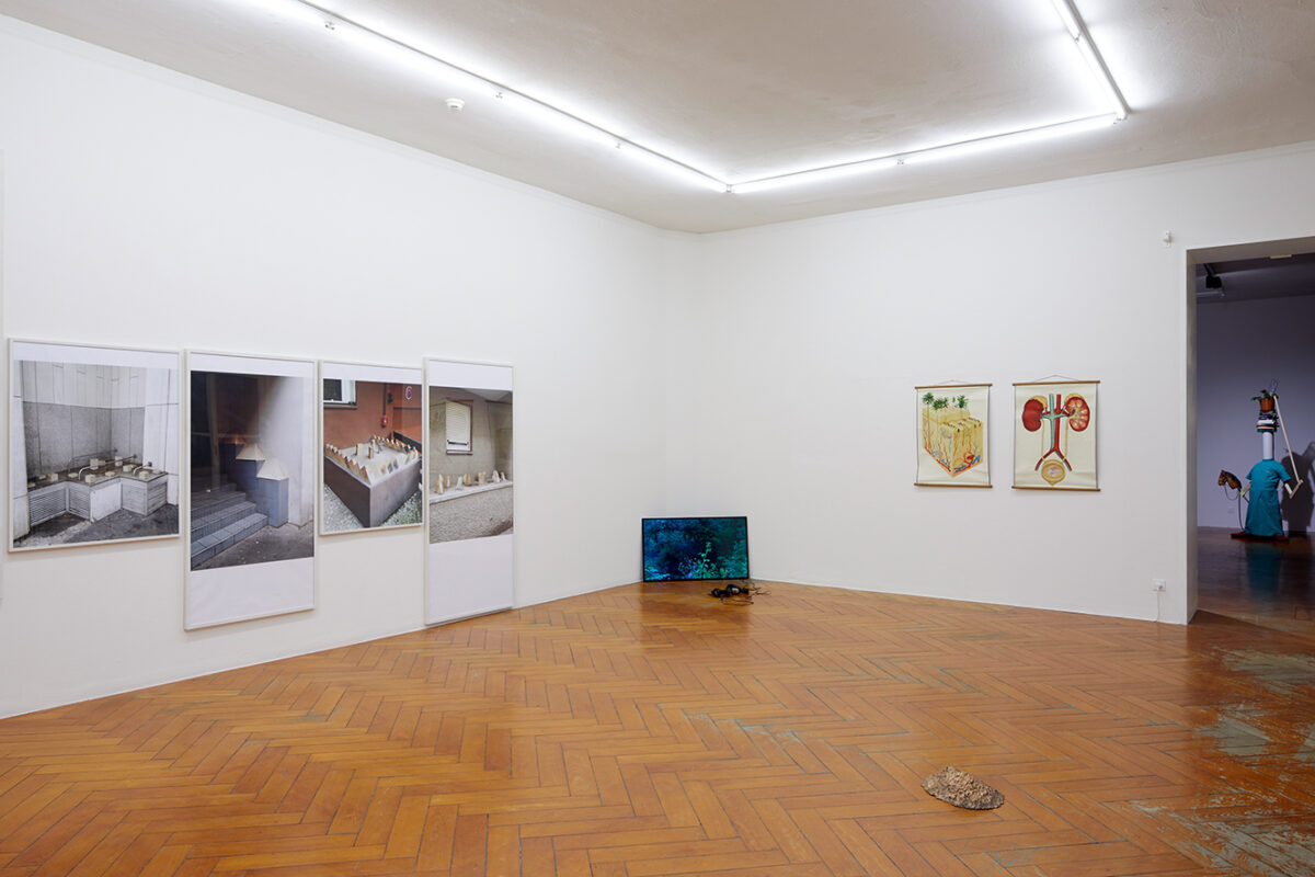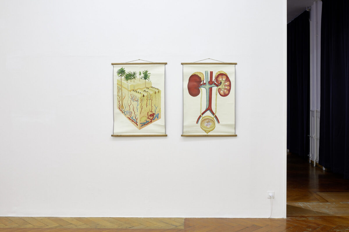 Der menschliche Körper dient RENÉE MAGAÑA (*1970 in Santa Monica, lebt und arbeitet in Bern und Potrero) in ihrem Schaffen immer wieder als Untersuchungsgegenstand. Seinen Strukturen und seinem Zerfall geht sie in ihren Bildern nach. Alte Schultafeln aus dem Biologieunterricht hat sie in anatomy (the skin) und anatomy (the glandular system) mit subtilen malerischen Eingriffen um ihre eigenen Interpretationen ergänzt. Dadurch entstehen Irritationen und neue Leseweisen unserer Anatomie: Der Querschnitt der Haut wird so zum Nährboden für Bäume und Pilze, während die Blase zum Fischteich wird.