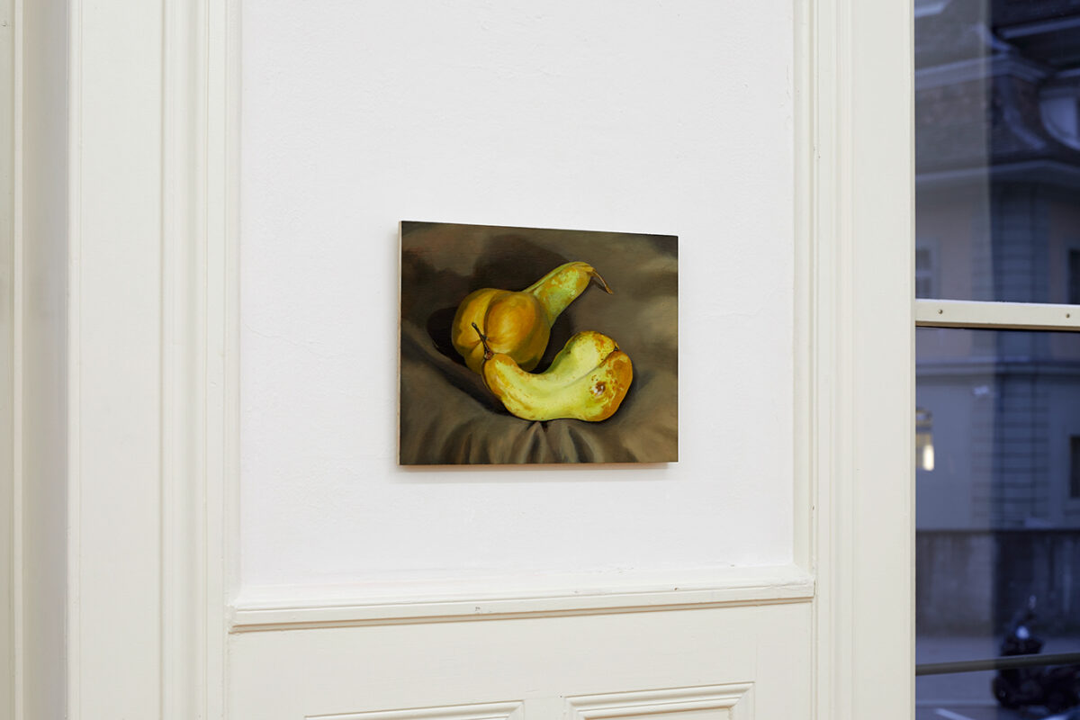 Ganz in der Tradition des Stilllebens sind die Birnen von INGA STEFFENS (*1984 in Lübeck, lebt und arbeitet in Bern) bezüglich Farbe, Textur sowie Licht- und Schattenspiel auf die Leinwand gebracht. Mit ihren üppigen Formen und in ihrer einander zugewandten, um 180° gedrehten Position erinnern die Früchte an zwei sich gegenüberliegende Körper in trauter Zweisamkeit.