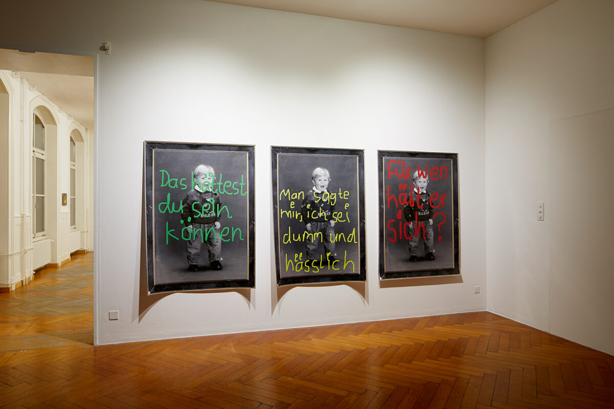 FABIO LUKS (*1982 in Biel, lebt und arbeitet in Basel) interessieren Veränderungen, die bei Wiederholungen passieren. Oft arbeitet er dabei mit Text, den er mal in raumfüllenden Buchstabenskulpturen, mal direkt an die Wände oder auf grossformatigen Leinwänden inszeniert. In vielen Arbeiten ist der Text gross und präsent und rhythmisiert raumgreifend die Ausstellungsräume. Die dreiteilige Poster-Serie Babarbub zeigt dreimal dieselbe Fotografie eines Jungen, der jeweils hinter einem anderen Satz hervorgrinst, und konfrontiert uns mit Fragen und Zuschreibungen an eine unbekannte Person. Hier wird Sprache direkt verwendet, sie springt uns unverhofft naiv entgegen und lässt uns zwischen Schadenfreude und Empathie mit dem Buben schwanken.