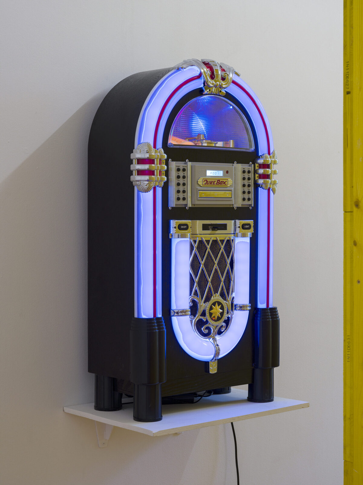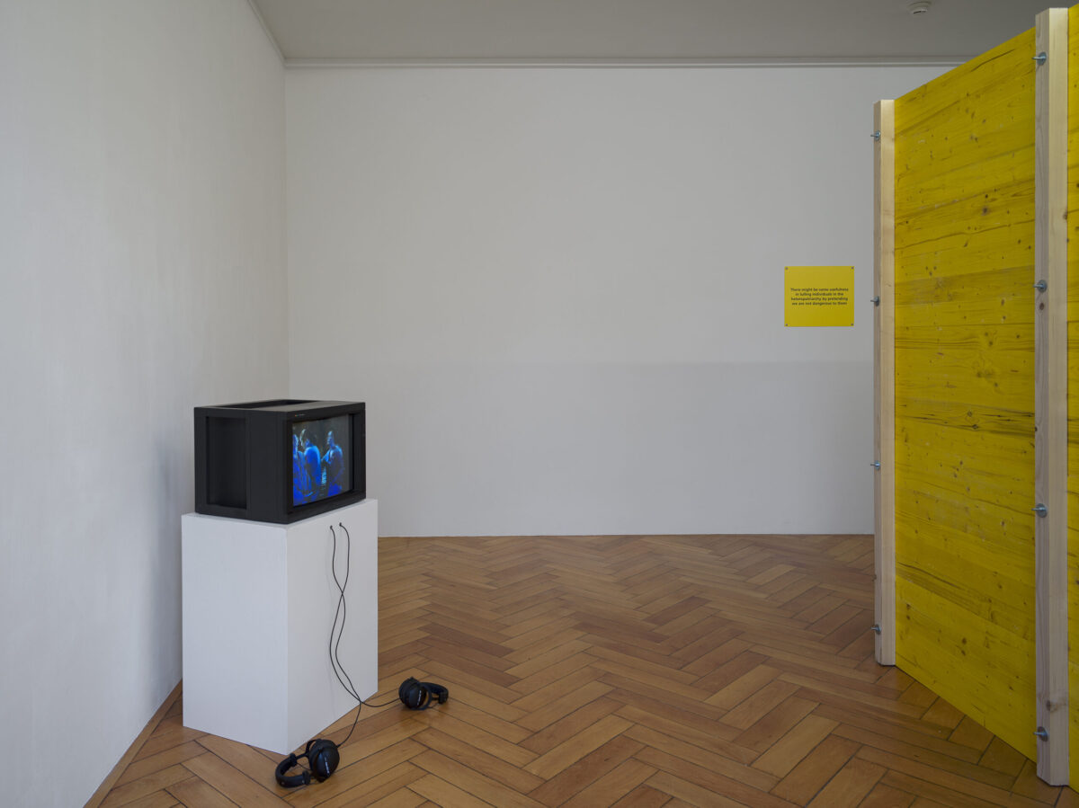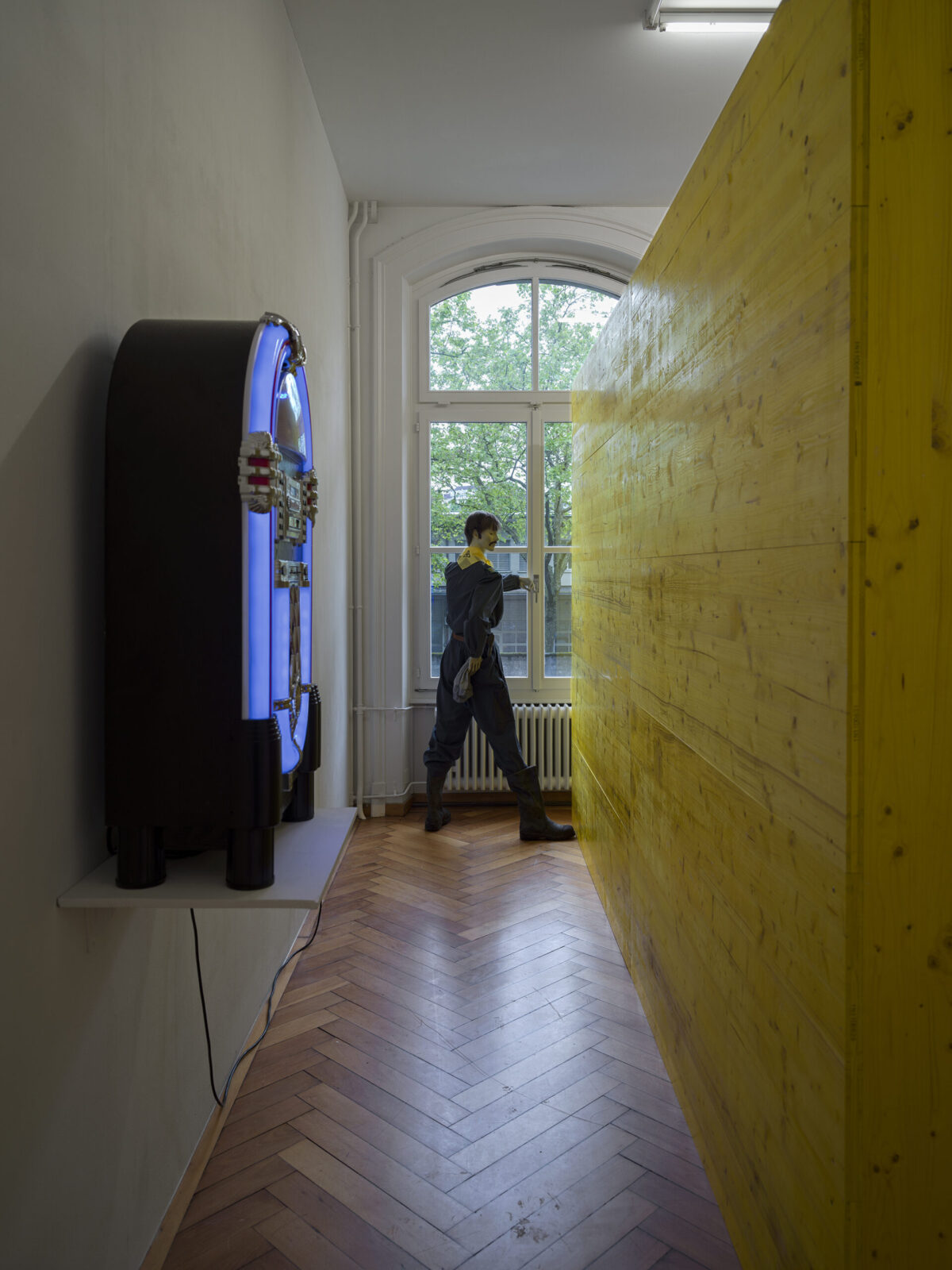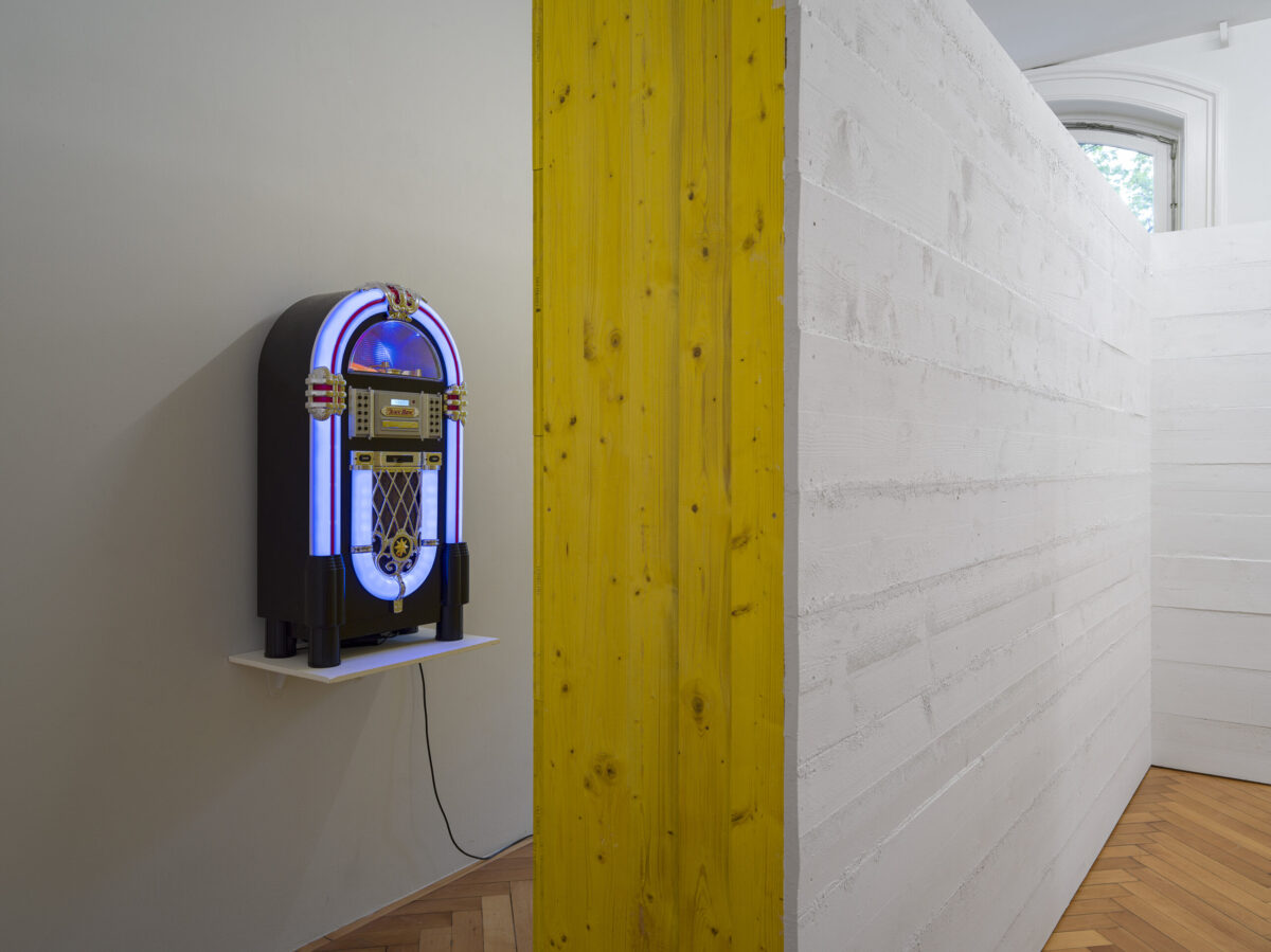 Daneben läuft der in Bern gedrehte, wegweisende Film Bar jeder Frau (1991) der Regisseurin Katrin Barben. Alle zwanzig Minuten hallt der Pfiff einer Trillerpfeife durch den Raum, die ein Berner Mann, spätestens seit dem Homosexuellen-Register, stets bei sich trug, um vor der Polizei zu alarmieren. Im hintersten Raum berichten zwei Frauen aus dem Greenham Common Women’s Peace Camp über ihre Erfahrungen in einer Schutzraumanlage in Genf. Aus der Jukebox nebenan dringt eine Stimme. Ingo Swann spricht zu dir. Wieder. Die Arbeit stammt von Gianmaria Andreetta und Public Universal Frxnd, die damit eine Verbindung schaffen zu einer vergangenen Ausstellung im Programm der Stadtgalerie, die sie zusammen mit Nina Wakeford und Luca Beeler realisiert haben: Being a faggot-spaceman I am awesome., über den Künstler, Autor, Hellseher und Spion Ingo Swann.
