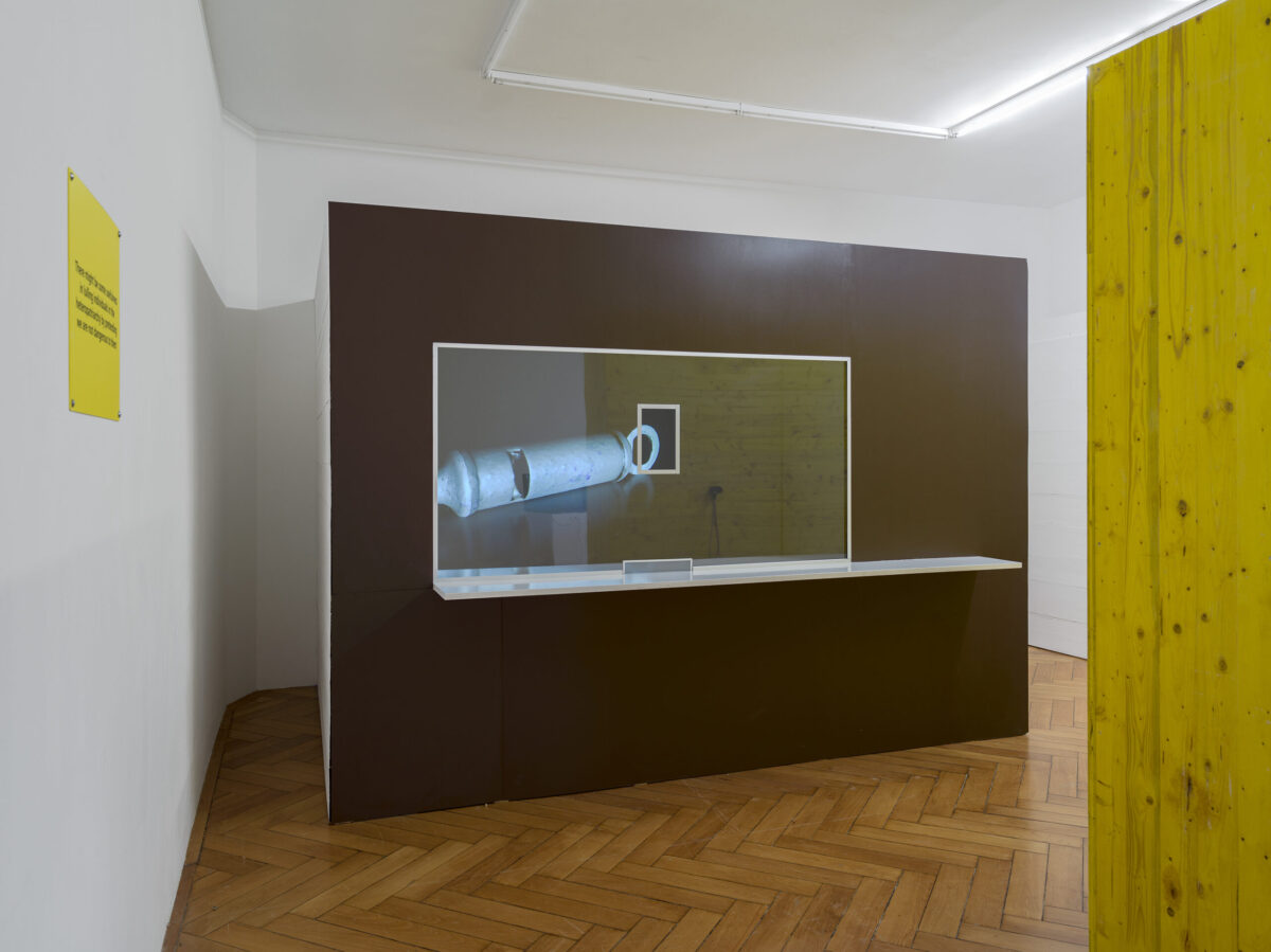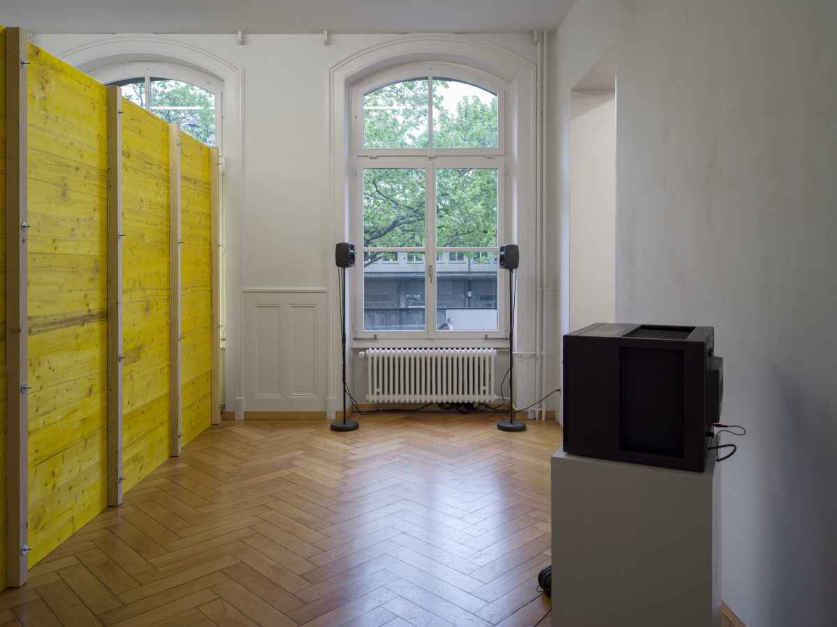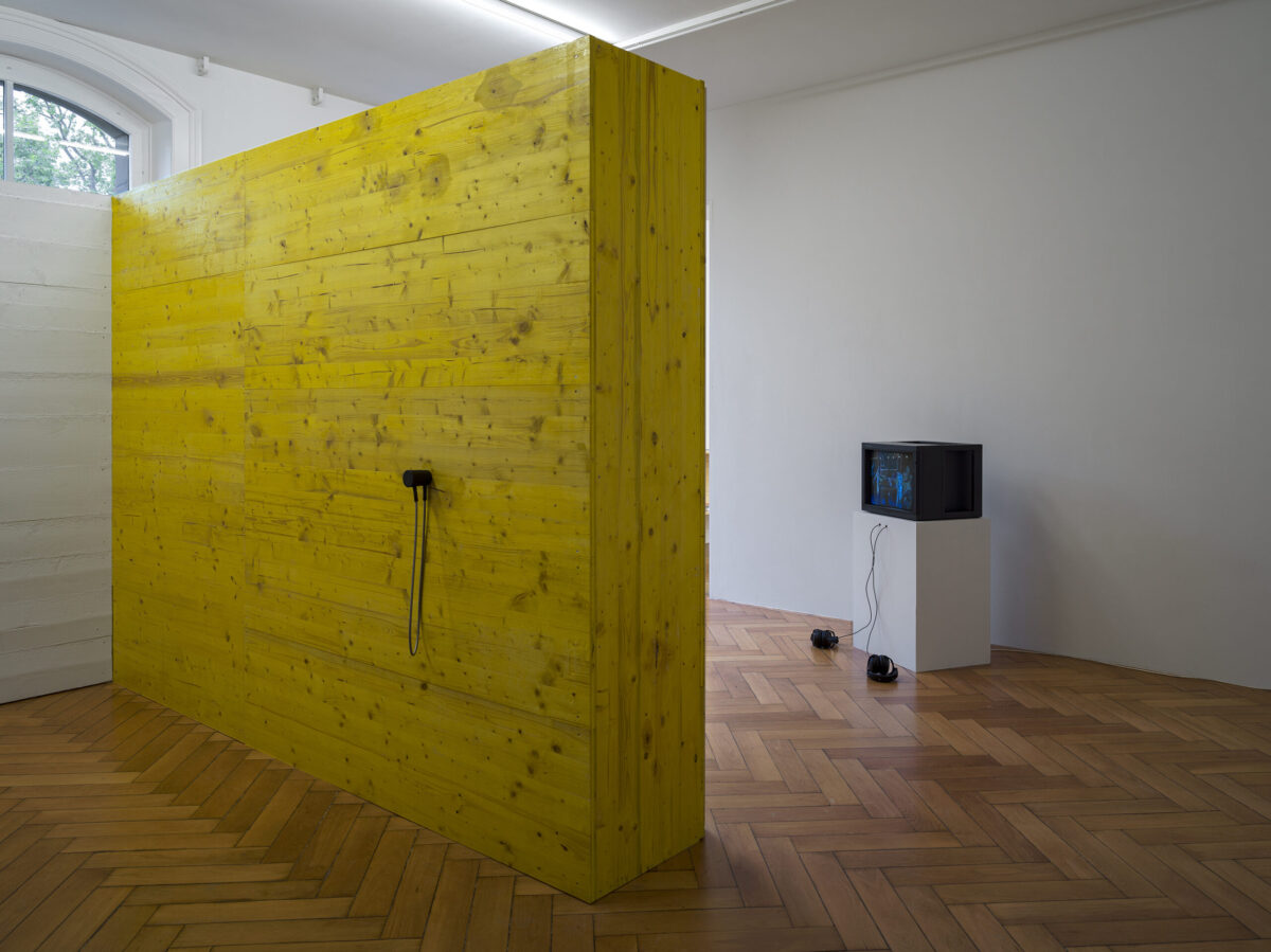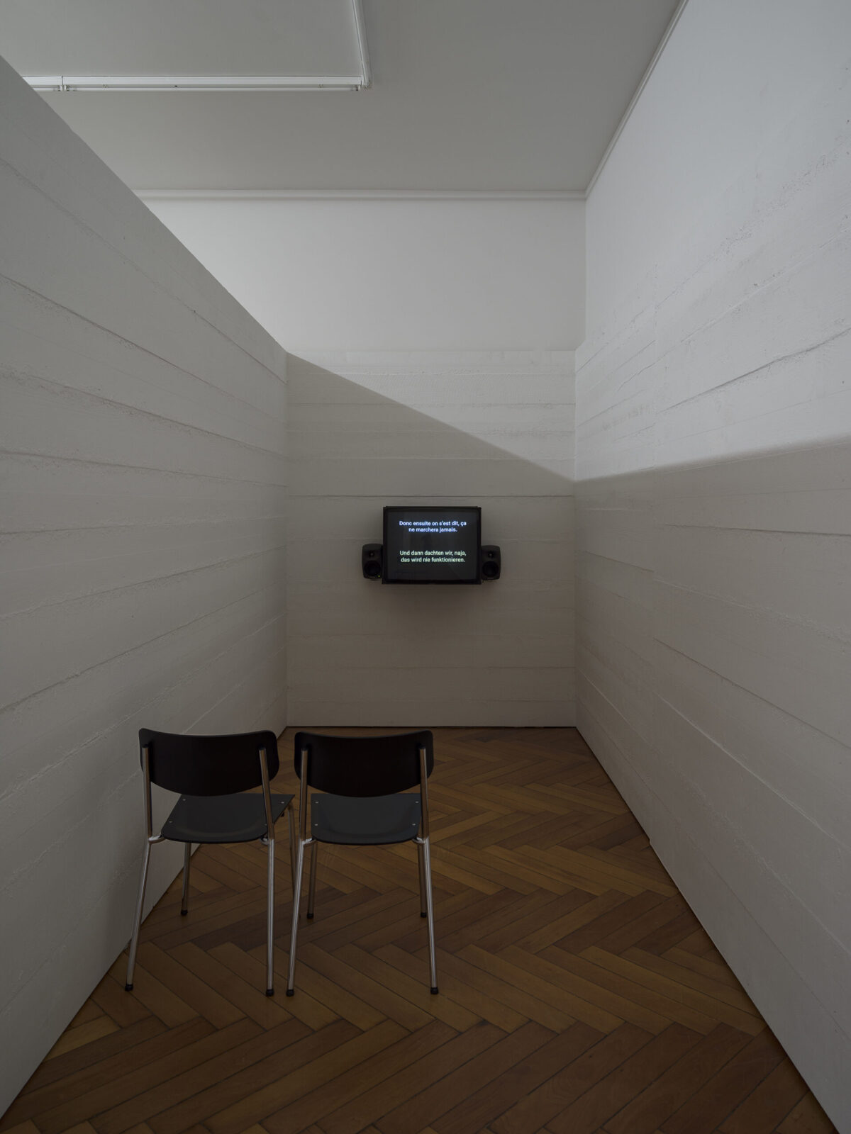 Daneben läuft der in Bern gedrehte, wegweisende Film Bar jeder Frau (1991) der Regisseurin Katrin Barben. Alle zwanzig Minuten hallt der Pfiff einer Trillerpfeife durch den Raum, die ein Berner Mann, spätestens seit dem Homosexuellen-Register, stets bei sich trug, um vor der Polizei zu alarmieren. Im hintersten Raum berichten zwei Frauen aus dem Greenham Common Women’s Peace Camp über ihre Erfahrungen in einer Schutzraumanlage in Genf. Aus der Jukebox nebenan dringt eine Stimme. Ingo Swann spricht zu dir. Wieder. Die Arbeit stammt von Gianmaria Andreetta und Public Universal Frxnd, die damit eine Verbindung schaffen zu einer vergangenen Ausstellung im Programm der Stadtgalerie, die sie zusammen mit Nina Wakeford und Luca Beeler realisiert haben: Being a faggot-spaceman I am awesome., über den Künstler, Autor, Hellseher und Spion Ingo Swann.