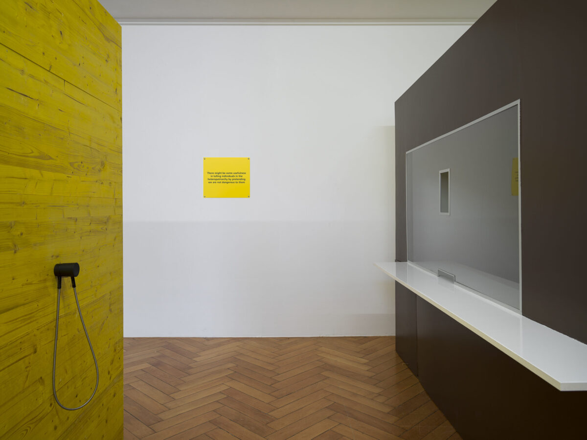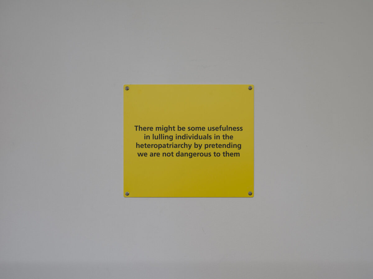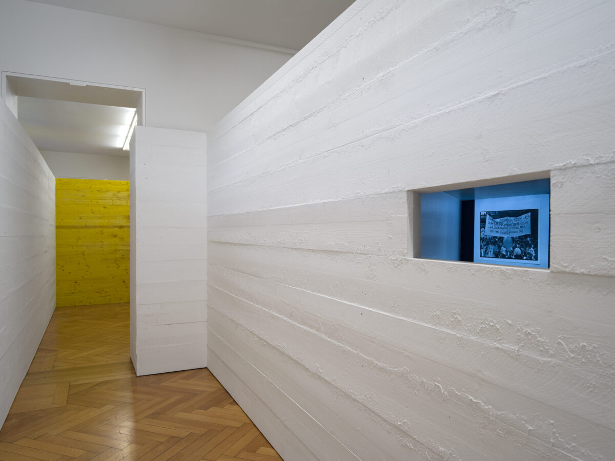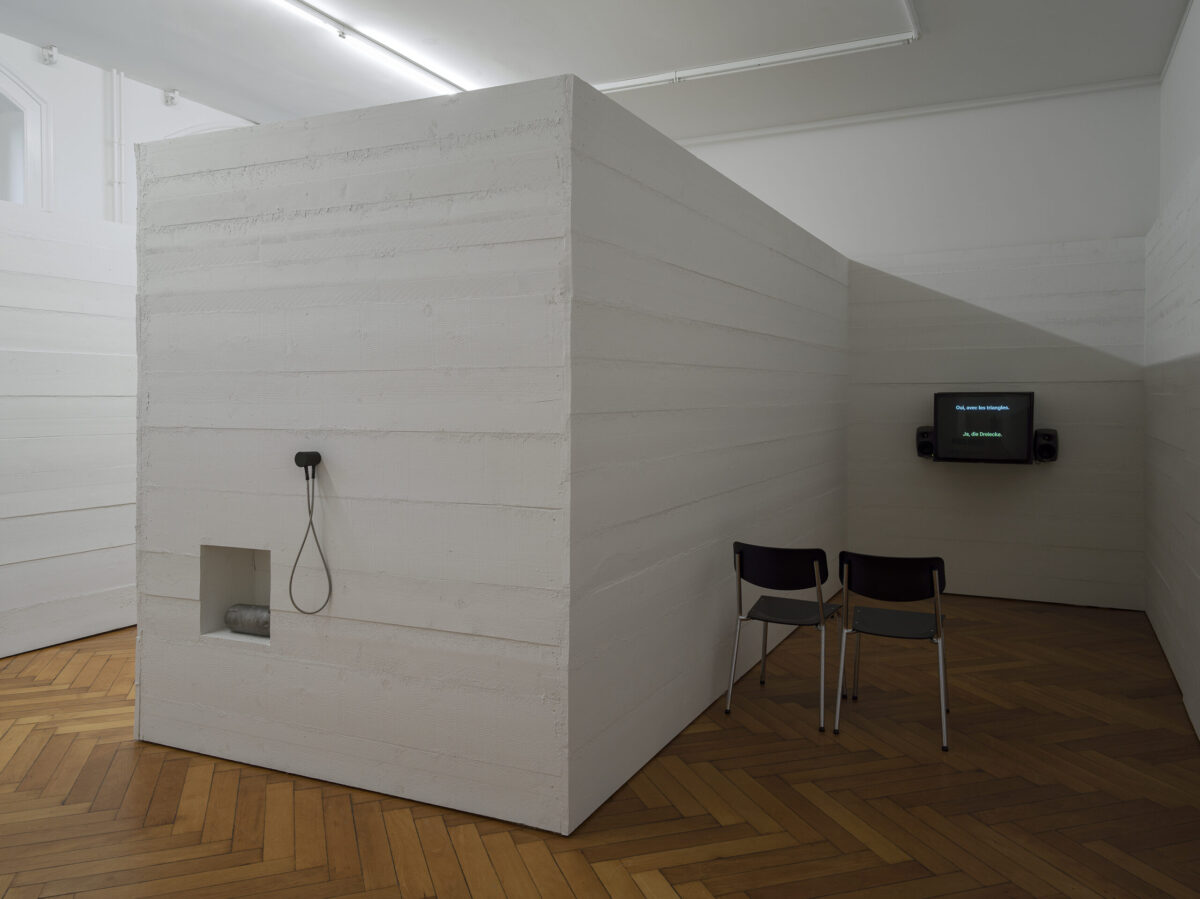 Das ist die Ausstellung. Ihre Architektur folgt einem idealtypischen Schutzraum. Dieser könnte aber auch durch eine Subkultur umfunktioniert worden sein. Die Szenographie erinnert an das Museum des Bletchley Parks oder an andere Formen der musealen Wissensvermittlung. Concrete Comeback ⚣⚢ Arms are for Linking erzählt unter anderem von Verdacht und Misstrauen, wie sie während des Kalten Kriegs verbreitet waren. Ein Misstrauen, welches sich auch auf die Faktizität der vermittelten Archivalien in der Ausstellung überträgt. Bevor du in die Struktur eintauchst, wirst du mit einer Reihe von Fragen konfrontiert. Verstehst du die codierte Sprache? Kennst du die Antworten?