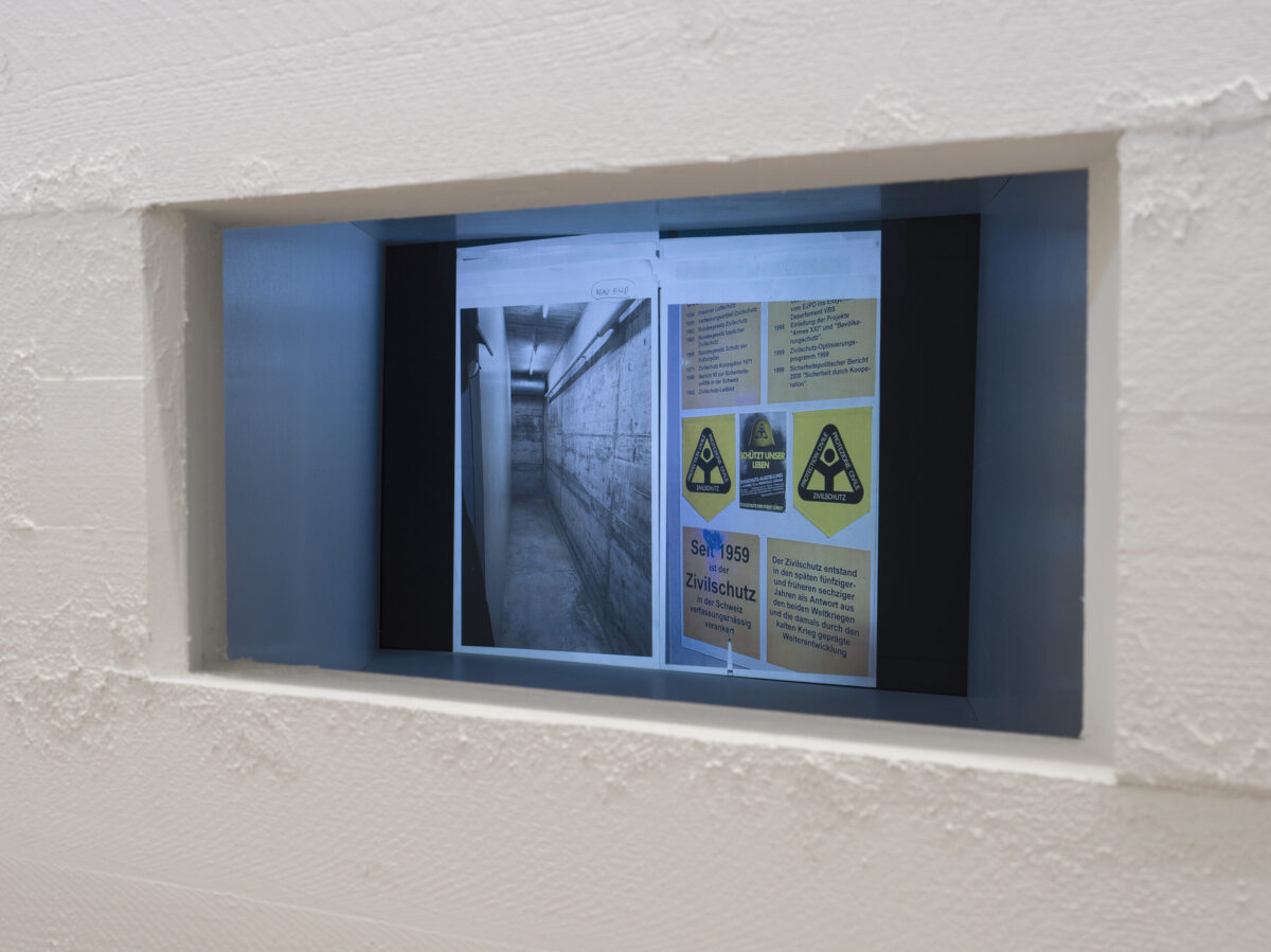 Eine metallene Tür in einer Mauer. Sobald du sie öffnest, leuchtet blaues Licht auf. Du gehst weiter durch eine schwere Panzertür aus Beton. Der darauffolgende Raum ist in vertrauten Farben gehalten, häuslich, aber nicht zu häuslich. Hinter einer Scheibe befindet sich die Réception. Hier meldest du dich an. Name? Alter? Geschlecht? usw. Laminierte Blätter informieren dich. Denken sie, dass du kontaminiert bist? Gehe links, wenn du eine Frau bist, oder rechts, wenn du ein Mann bist. Deine persönlichen Sachen entsorgst du in der dafür vorgesehenen Luke. Hinter den Duschen liegt die Umkleidekabine, wo du neue Kleider findest, entsprechend deiner Grösse und deinem Geschlecht. Jetzt bist du in der Schutzanlage. Du bist Schweizerin oder Schweizer.