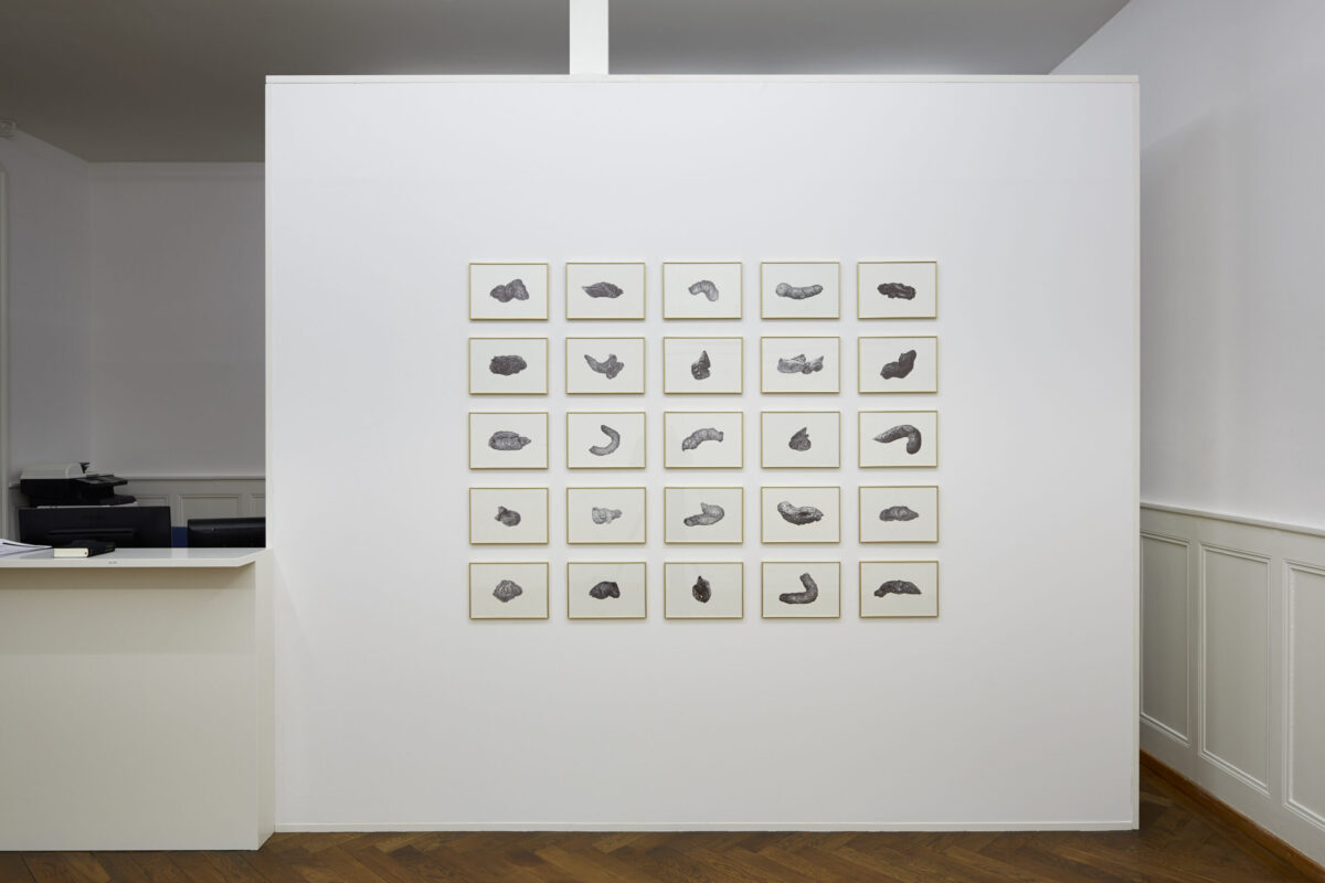 Schreiber bewegt sich in ihrer Bildwelt nicht selten am Rande des Unsittlichen und Unappetitlichen und greift Themen auf, die wir uns aus Ekel oder Anstand nicht gestatten zu diskutieren. So auch in ihrer Zeichnungsserie Decent Shit: Hier dokumentiert sie zeichnerisch ihre eigenen Exkremente. Schreiber behandelt diese Formen wie freistehende Skulpturen. In einem mimetischen, fast schon hyperrealistischen Ansatz hält sie ihre Kotstücke fest und verweist damit auf das zeichnerische Genre des Naturstudiums. Scheisse zu zeichnen bedeutet in dieser Arbeit möglicherweise ein Qualitätsurteil, bezeichnet aber vor allem das Motiv. Schreiber interessiert sich für das Funktionieren innerhalb eines Systems. Ebenso wie der biologische Automatismus der Verdauung mit der Produktion und Ausscheidung von Exkrementen hat sich das zeichnerische Festhalten ihres Kotes automatisiert. Die billigen Plastikrahmen vergolden die Künstlerscheisse und verweisen auf die Merda d’artista des italienischen Konzeptkünstlers Piero Manzoni. 1961 füllte Manzoni jeweils 30 g seiner eigenen Fäkalien in 90 Dosen ab.