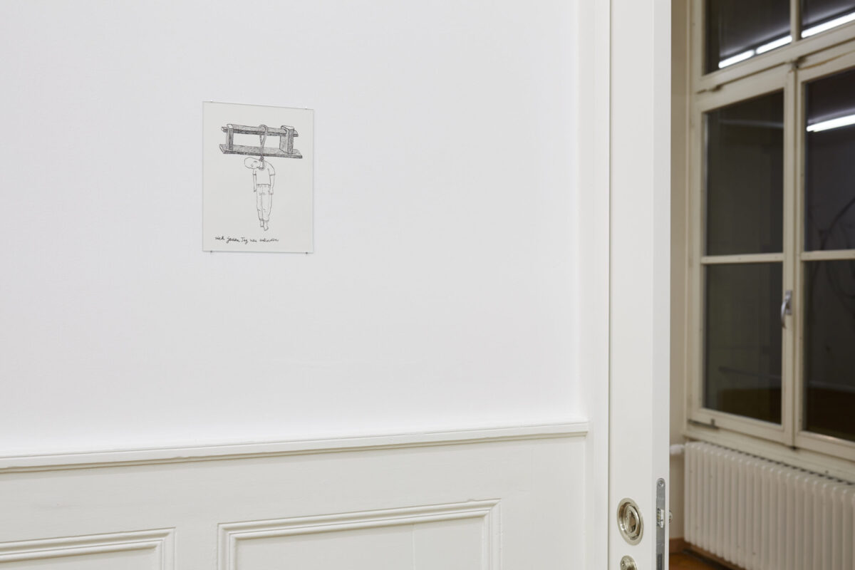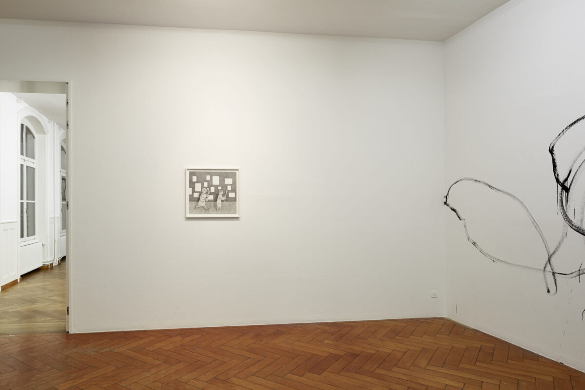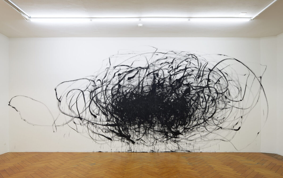 Quasi als Aufforderung des «Painters», etwas zu machen, schafft Schreiber während der Ausstellungseröffnung eine abstrakte Wandzeichnung. Sie bedient sich grosser Gesten und befreit sich vom konzeptionellen Ansatz und der Disziplin in Decent Shit. Die schwarzen, sich wiederholenden Linien wirken gleichzeitig unbeholfen und funktionieren als konzeptionelle Referenz an das Medium Zeichnung mit der Linie als Grundlage.