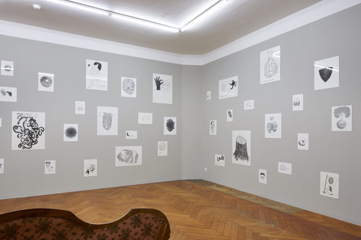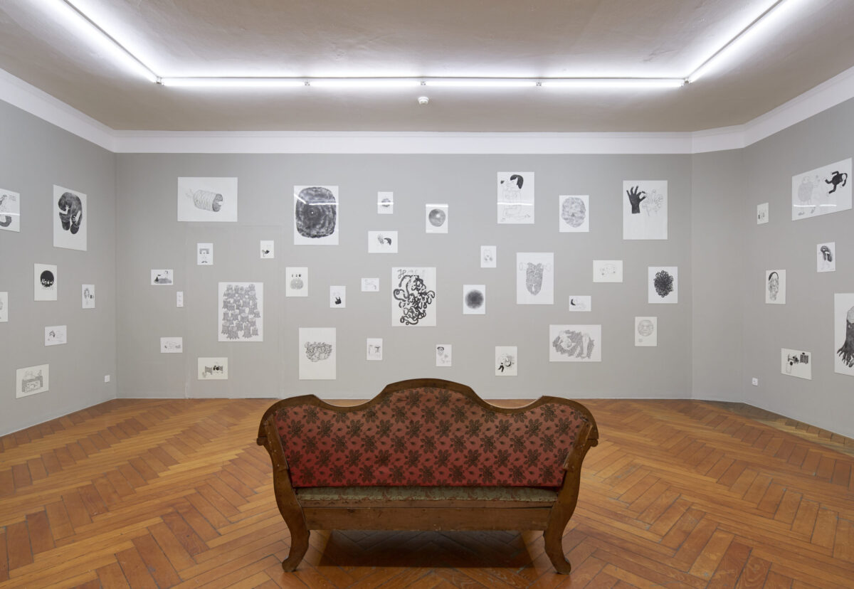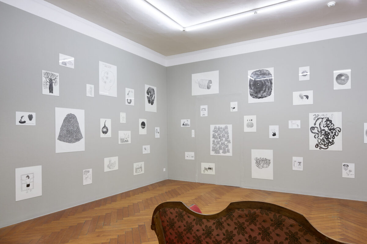 In der Stadtgalerie zeigt sie im hinteren Raum ausschliesslich solche automatischen Motive, die sie intuitiv ausgewählt und mit Pinsel und Tusche auf A-Formate vergrössert hat. Wir betreten eine Salonähnliche Situation. Ihre ersten Kunsterfahrungen sammelte Schreiber als Kind, auf dem Sofa liegend, inmitten der Kunstsammlung ihrer Tante.