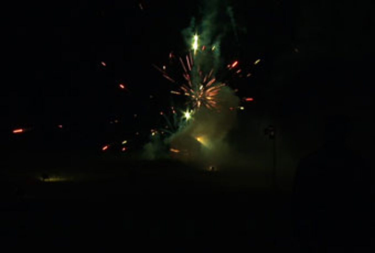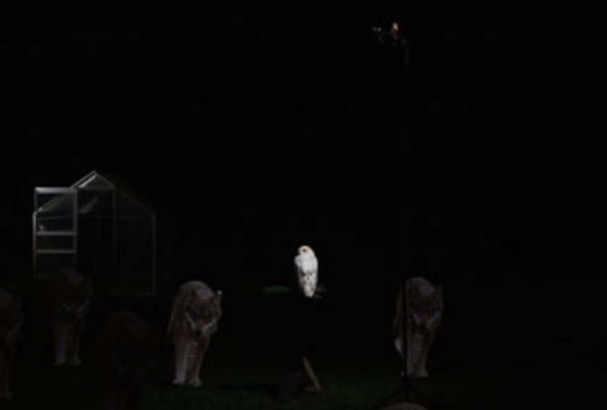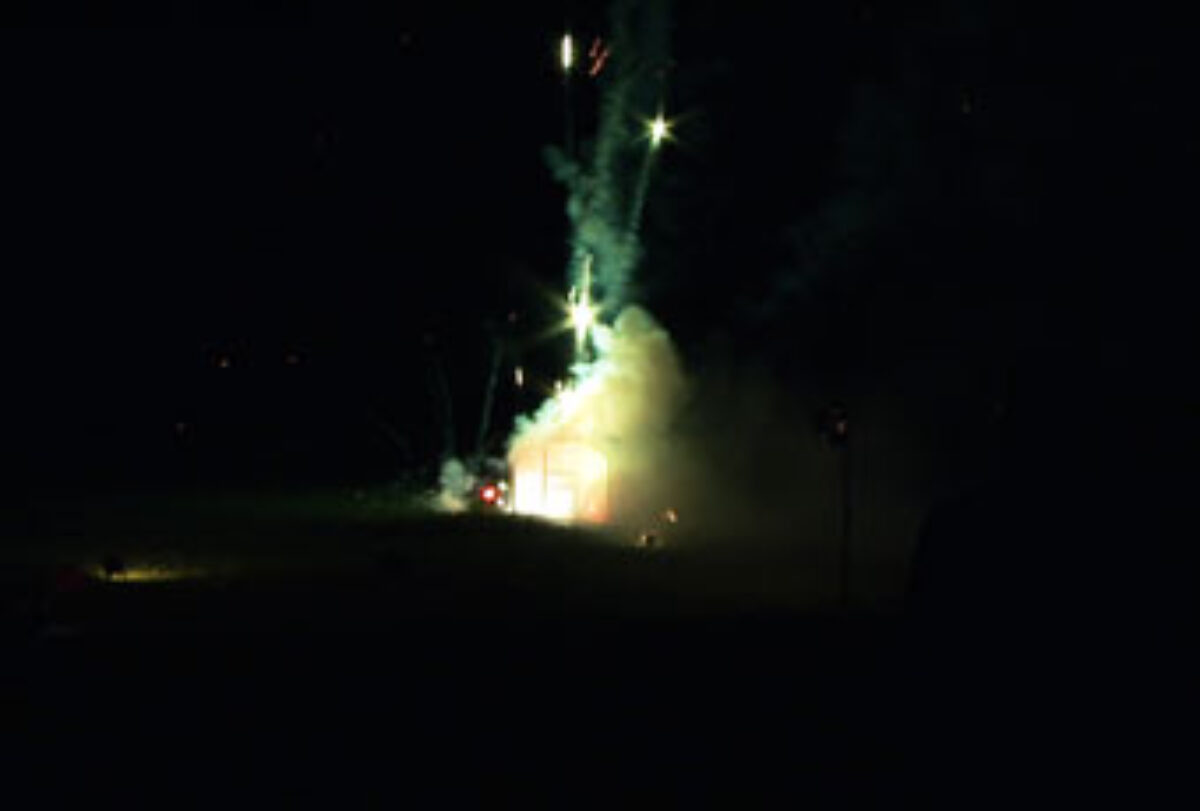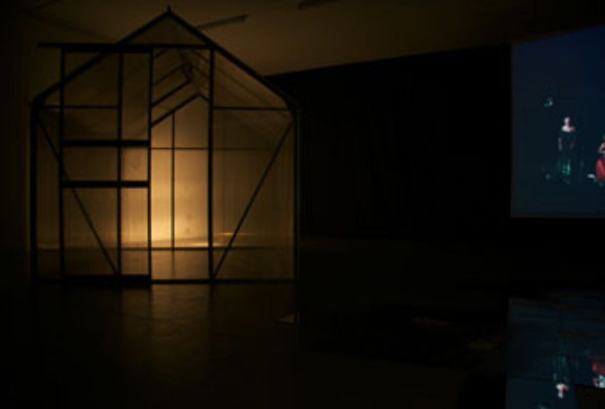 Im Mittelpunkt der Videoarbeit, die eggerschlatter für die Ausstellung Inmitten des Prinzips realisiert haben, liegt ein Feuerwerk, das in einem Gewächshaus gezündet wurde. Mischwesen und eine fabelhafte Schneeeule sind Akteure in einer Rahmengeschichte, die sich um das Entfachen dieses Feuerwerks dreht. Diese Situation wird zudem von einer Akkordeonspielerin und einem Sänger begleitet, die pausenlos spielen. Ein wiederkehrendes Element, ein Ritornell, spielt dabei eine wichtige Rolle. Wie Schlangenbeschwörer treten sie als Begleiter des Feuerwerks in Erscheinung. Die repetitive Art des Ritornells schafft so einen Raum, der dieses Ritual in einem geschlossenen, der Welt entrückten Rahmen zusammenhält. Unkontrolliert und willkürlich breitet sich das Feuerwerk aus nimmt den Raum in seinen Besitz und zerstört mit seiner gefährlichen Schönheit die räumliche Enge.