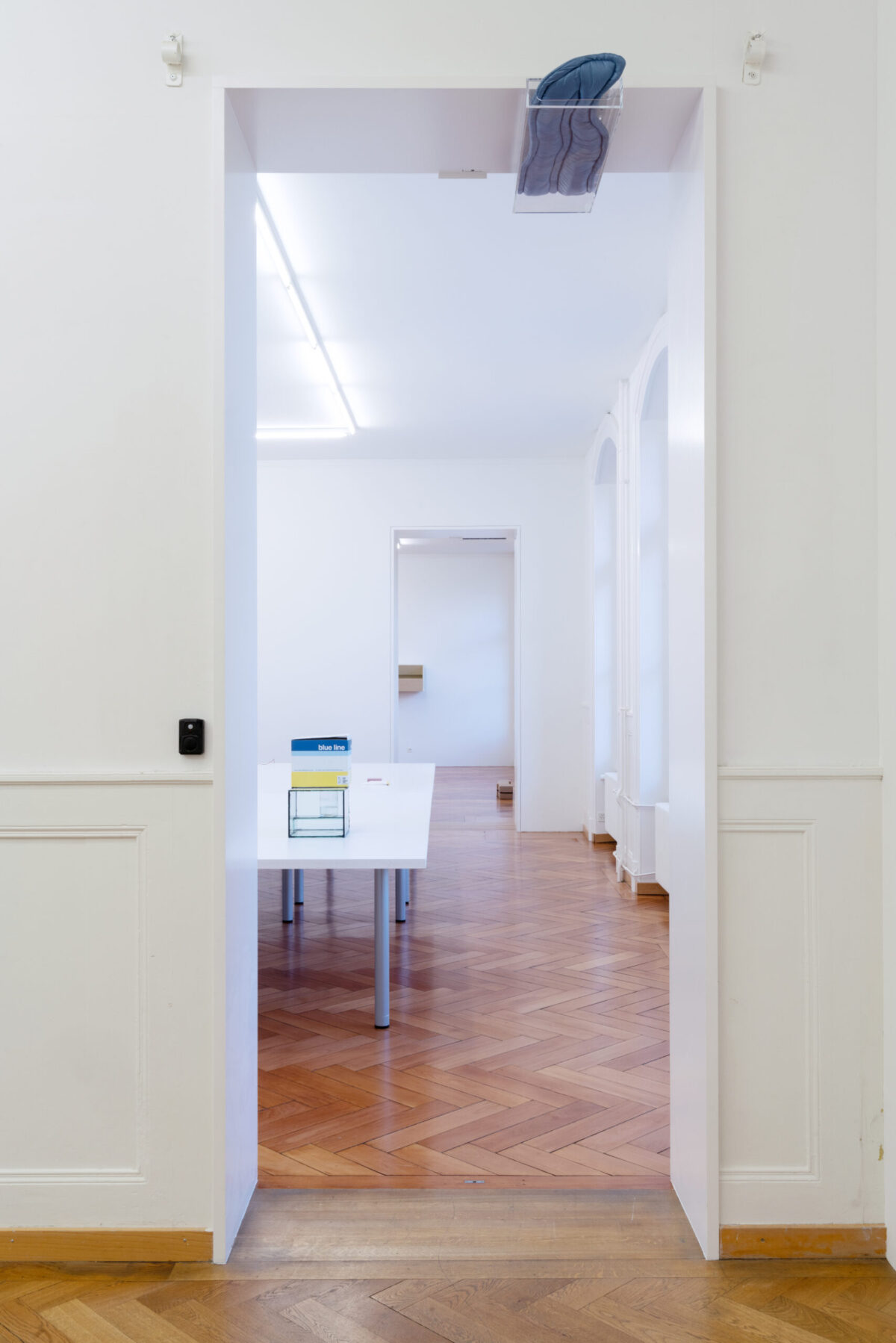 Das Volumen des unteren Glaskubus leitet sich von derjenigen der Versandpackung für Schleifpapier der Firma Sia Abrasives ab. Die Kartonbox ist so platziert, dass sie jeder Statik widerspricht und erst das Öffnen die tragende, gläserne Struktur frei gibt. Darin stehen eine Flasche mit selbst destillierten Gin und Gläser – eine Situation die von den Besucher*innen aktiviert werden kann.
