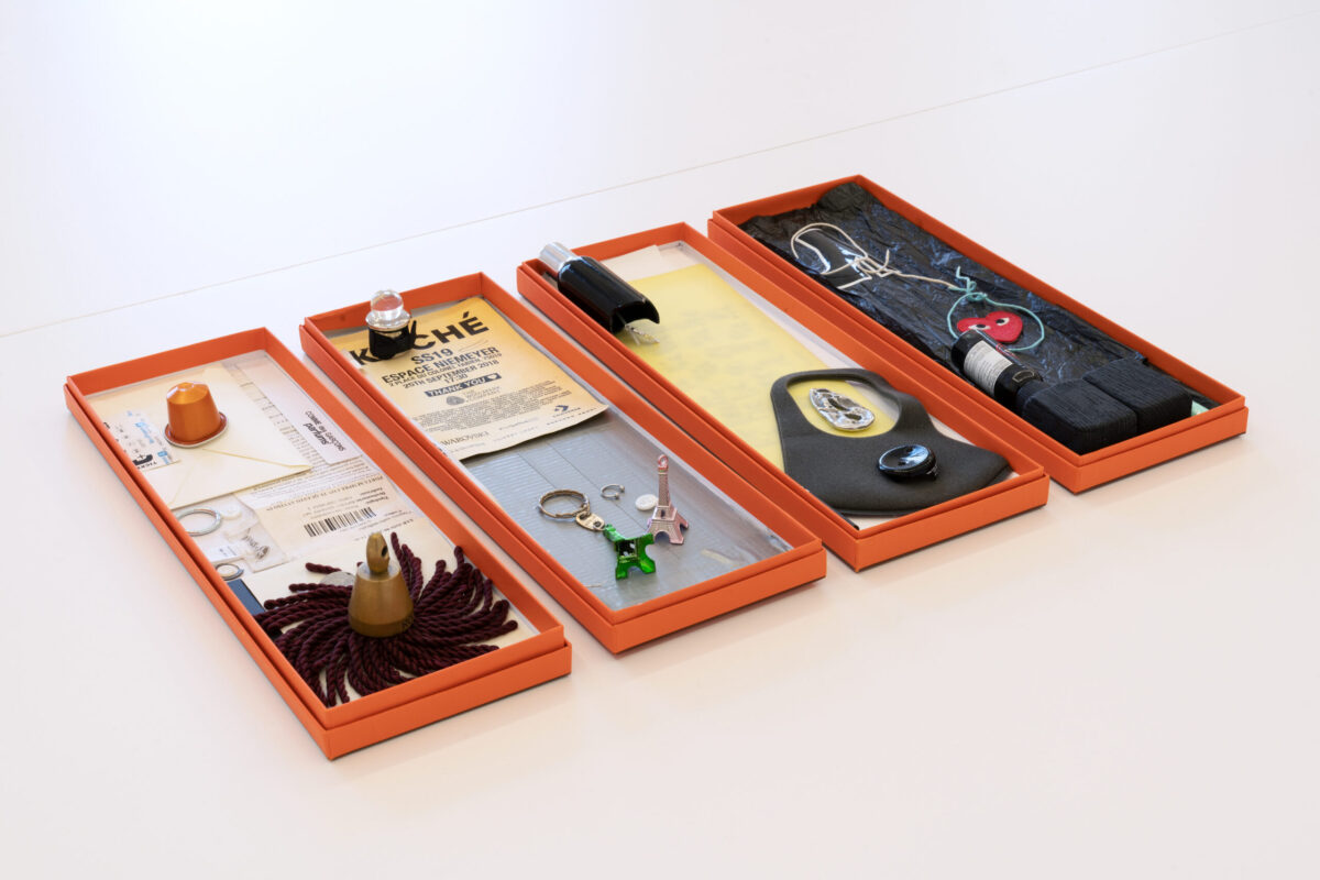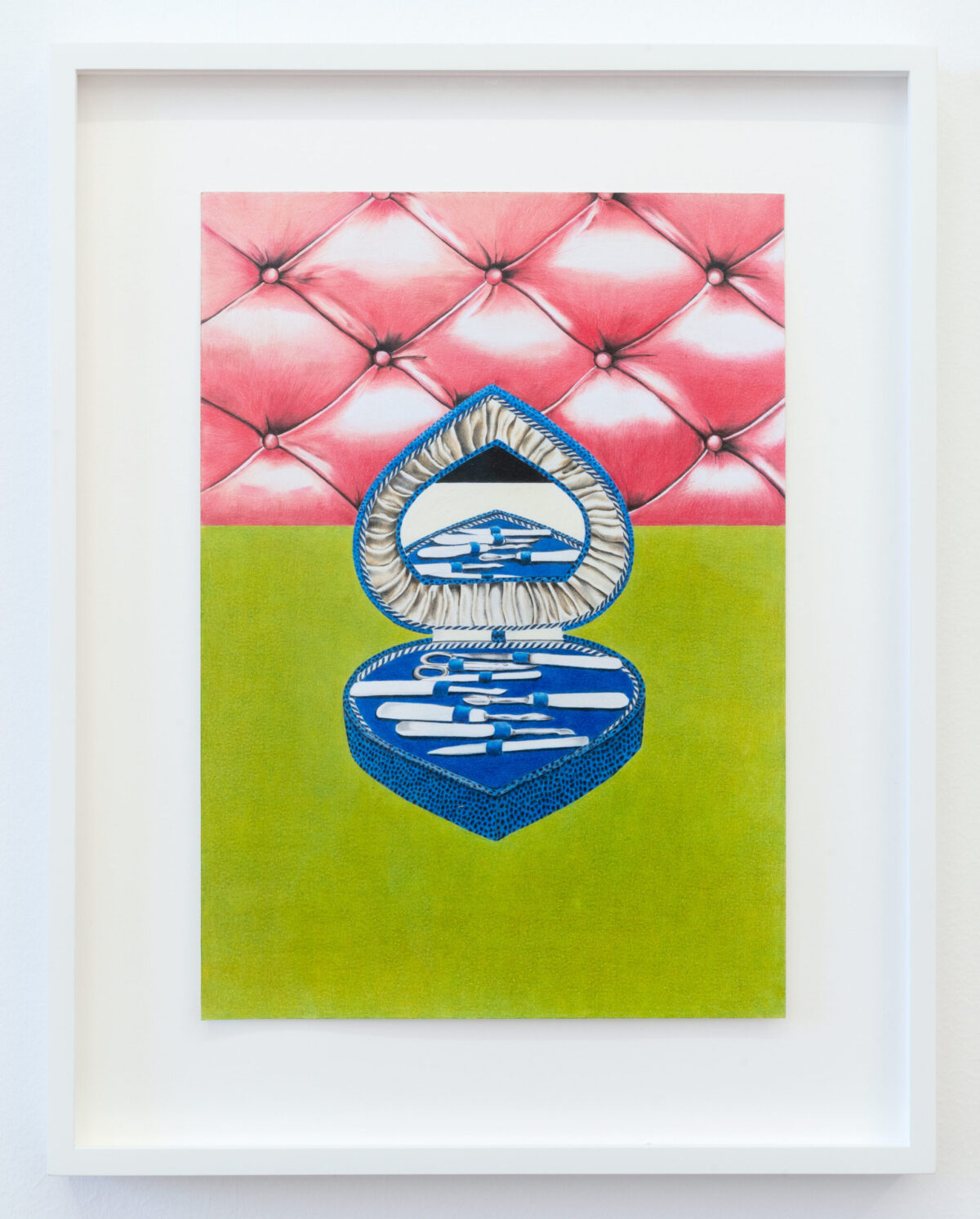 Die Schatullen aus der Serie von Zeichnungen der Künstlerin Marta Riniker-Radich handeln von dem privilegierten Moment der persönlichen Pflege, der es uns ermöglicht, uns zu isolieren, an uns selbst und nur an uns selbst und sonst niemanden zu denken. Die Schatullen komprimieren die häusliche Sphäre, mit ihrem Versprechen vom Schutz vor der Aussenwelt und erzeugen dabei einen konstant bedrohlichen Unterdruck. Die akribische Technik der Farbstiftzeichnungen bestärken dieses latente Gefühl der angespannten Stille. Der Raum der Box ist oft Ausgangspunkt für die Konstruktion der Zeichnungen der Künstlerin: Er ist sowohl geschossen als auch unendlich, wie eine Zauberkiste mit leerem Boden.