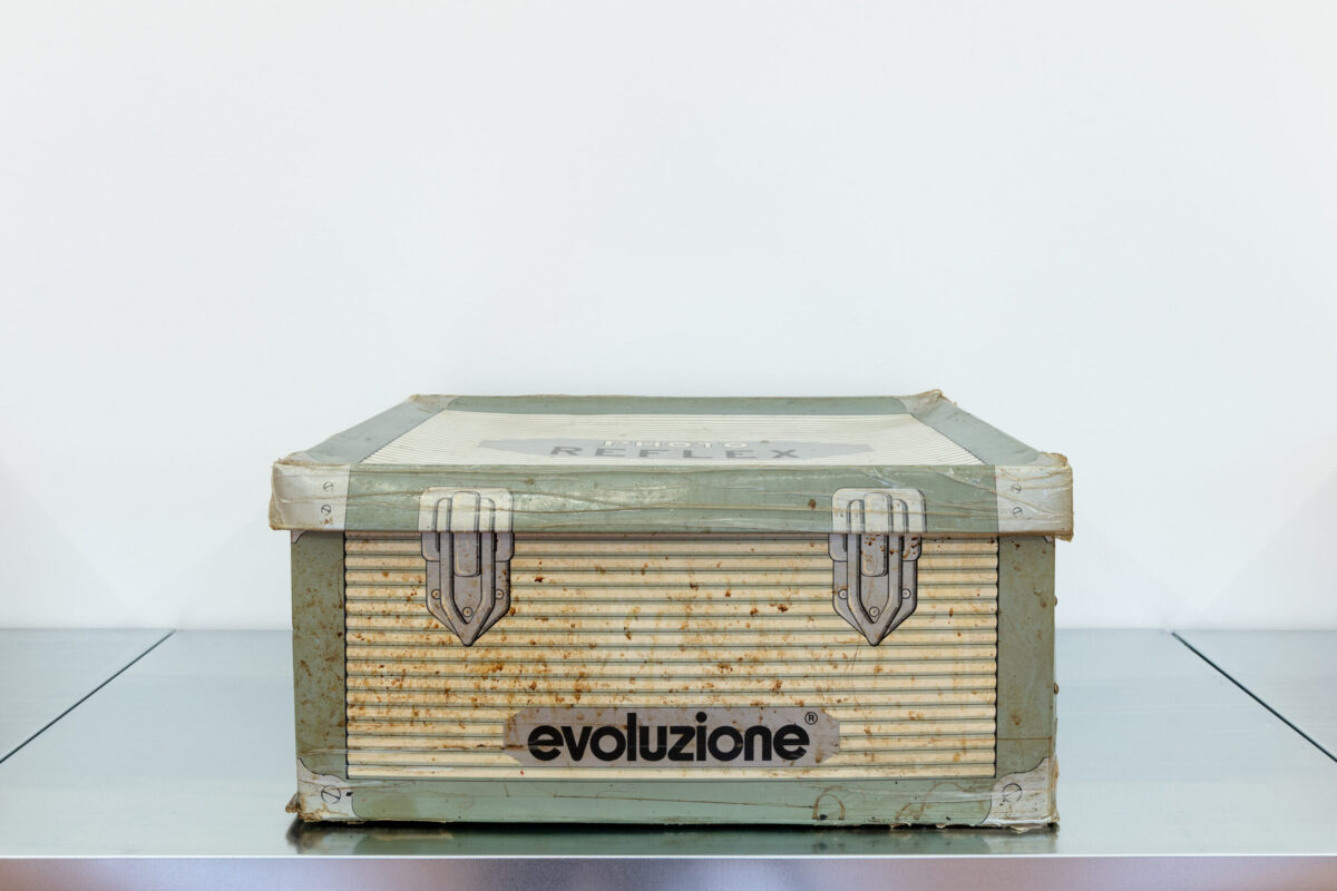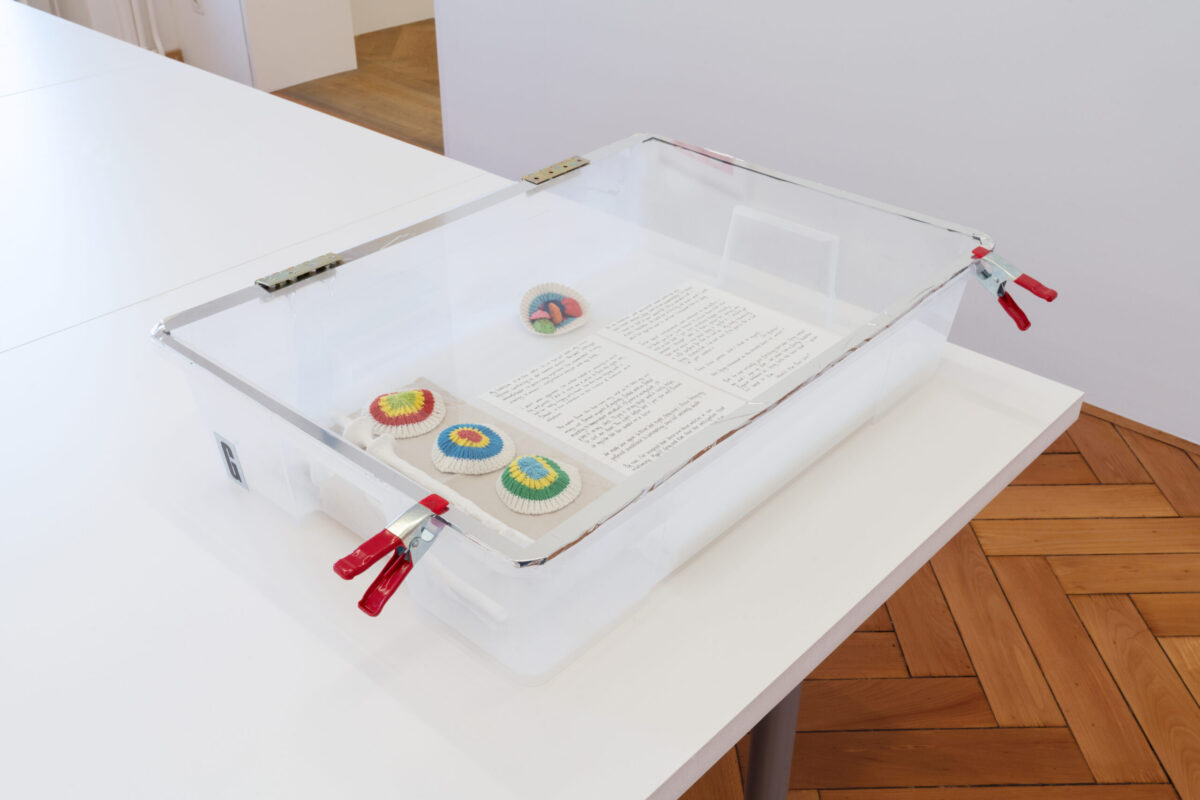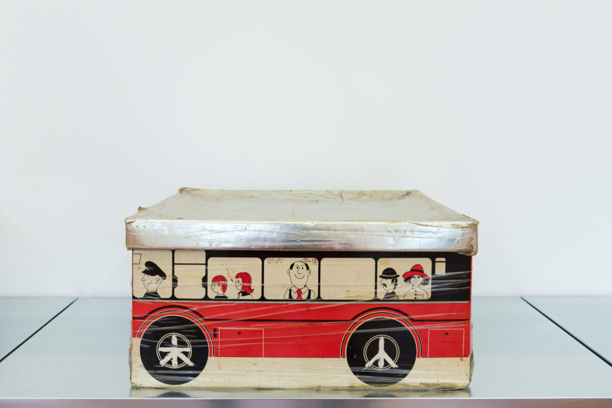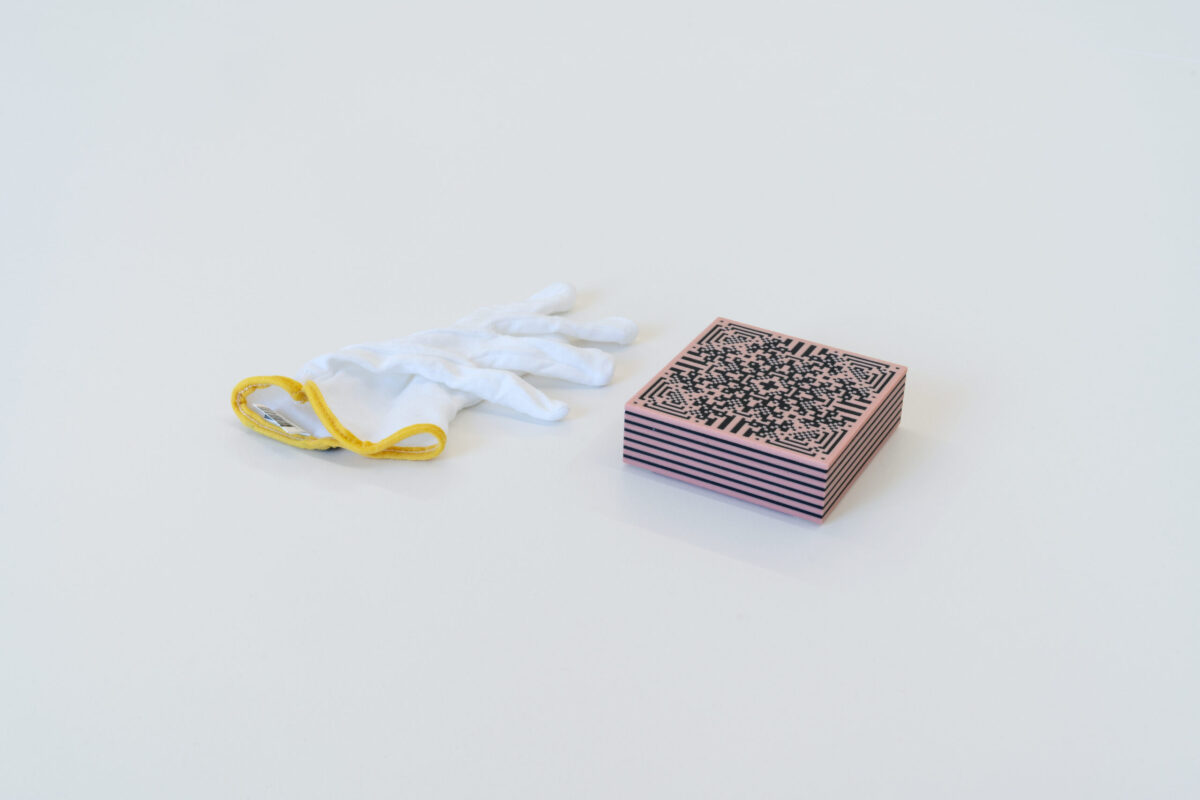 Die Box der Künstlerin Julia Scher ist ein Hybrid: Sie hat ihre Wurzeln in Kisten von heute, deutet jedoch auf die Hybridität zukünftiger Bedingungen hin. Sie könnte Unterstützung, Sicherheit und Nahrung liefern, für eine Reihe von Funktionen und Aktivitäten zukünftiger Entitäten. Ihre Konstruktion und Materialität bewegt sich zwischen dem häuslichen (Lagerung, Bewahrung, Schrank und Tisch) und dem terrestrischen: Sie ist gefertigt aus Mineralien, Cellulose, natürlichen Klebstoffen und Farbe. Die Box bewahrt einen weissen Baumwollhandschuh, könnte aber allem Platz geben, was als menschliches Bedürfnis angesehen wird. Das Design unterliegt einem Quellcode und kann mit jedem 3D-Drucker reproduziert werden. Der Code suggeriert bloss einen Anfangszustand von dem neue Funktionen und Bedeutungen abgeleitet werden können.