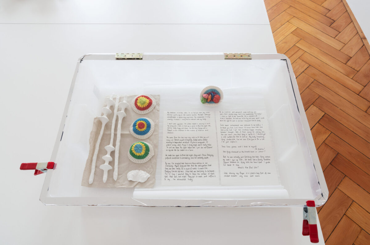 Angharad Williams Kunststoffboxen sind Mikroszenen. Sie bewegen sich zwischen behelfsmässiger Vitrine und Aufbewahrungsbox für Materialien die eine bestimmte Leseumgebung schaffen, für die Texte welcher den Boxen beigelegt sind. Geschichten die sich aus Verzweiflung, Vulgarität und Verführung speisen. Die Gegenstände zeichnen Collagen nicht anwesender Charakteren – Überreste die den Geschichten entnommen wurden. Die in der Stadtgalerie gezeigte Box ist Teil dieser fortlaufenden Serie.