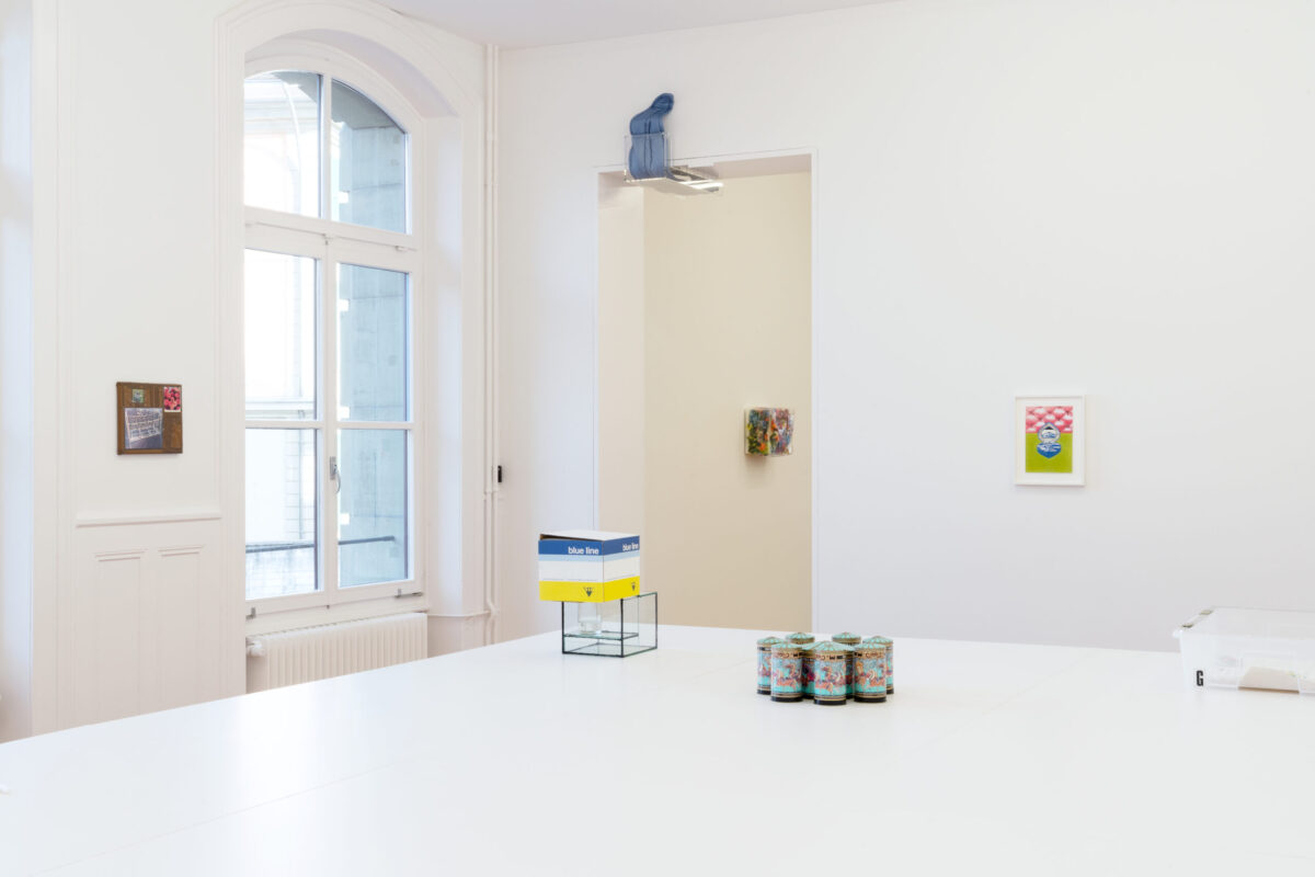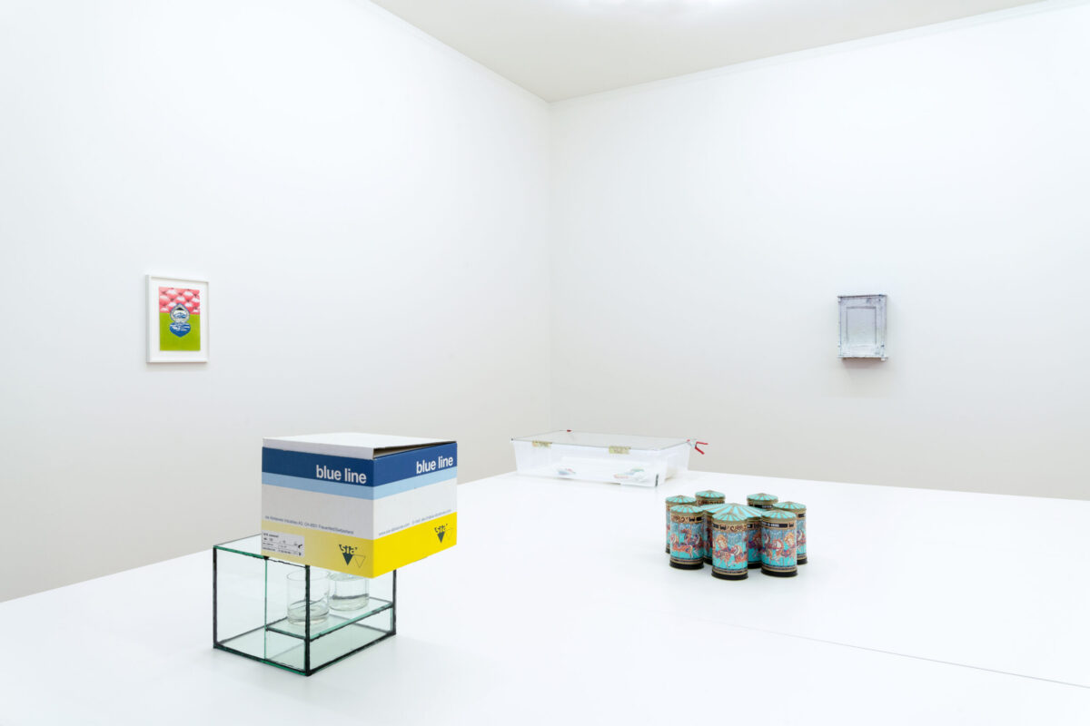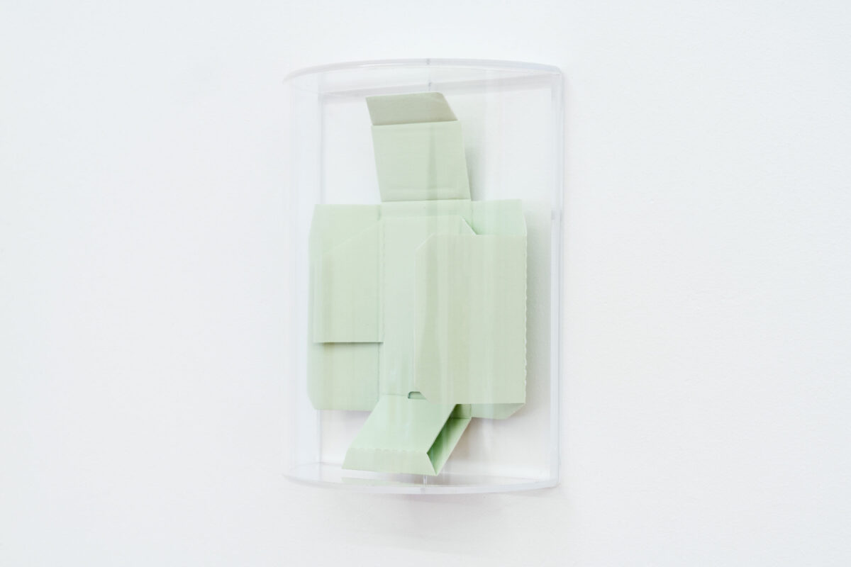 Geschnittene, erhitzte und dann gebogene PVC-Blätter formen die zwei Behälter, die Teil einer fortlaufenden Werkserie Samuel Jefferys sind. Jeder ist auf einem Sockel platziert. Die containerartigen Objekte sind mit unterschiedlichen Materialien behandelt und mit Baumarktfarbe bemalt. Sie scheinen nach genauen Standards gefertigt und unterscheiden sich dennoch in Details voneinander. Die äussere Oberfläche von Untitled (2019) wurde mit einem Motorenöl bearbeitet, das für Oldtimer-Motoren benutzt wird. Ähnlich wie das Auto könnte man sich die Objekte als Behälter zum Transport nicht identifizierter Übertragungen vorstellen. Das Motorenöl und seine Assoziation mit dem Mechanischen akzentuiert hier bloss den Zustand der Trägheit dieser Container und verleiht ihnen eine leicht militärisch-industrielle Nostalgie. Gleichzeitig sind sie Behälter für potenzielle, zukünftige Ereignisse. Dadurch schaut diese Arbeit in der Zeit zurück und nach vorne.