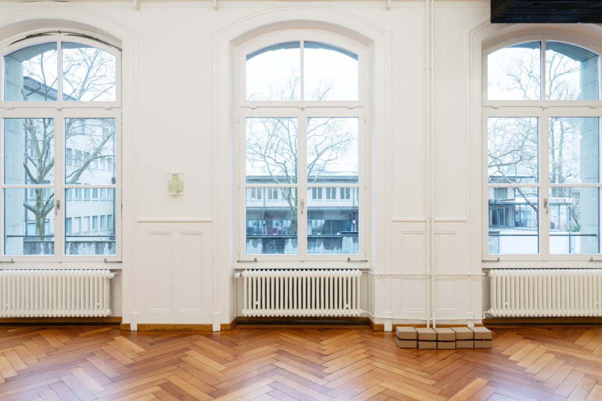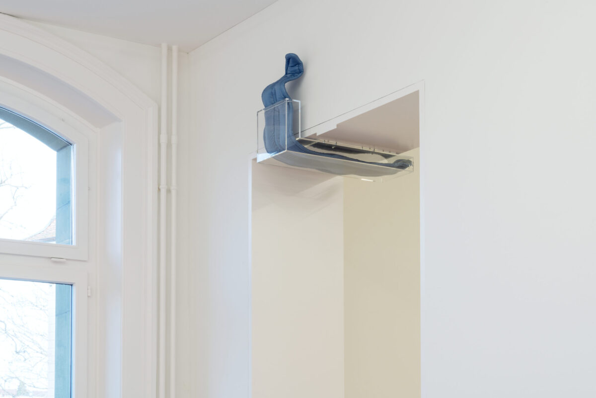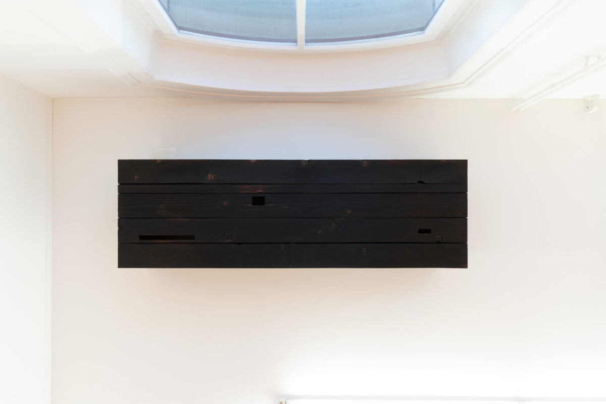 Die dunkle Oberfläche der an der Decke montierten Holzkiste ist karbonisiert, mit Feuer behandelt. Diese traditionelle Technik schützt gegen Insektenbefall. Im Boden und in den Seitenwänden der Kiste sind Schlitze eingelassen. Sie verbinden unterschiedliche Habitate. Die Arbeit von Karin Borer intendiert sich kreuzende Blicke: menschliche und nichtmenschliche. In ihrer Arbeit wird die Kiste zum Register für Sichtbarkeit und Nicht-Sichtbarkeit, dem Verlassenen oder dem Belebten.