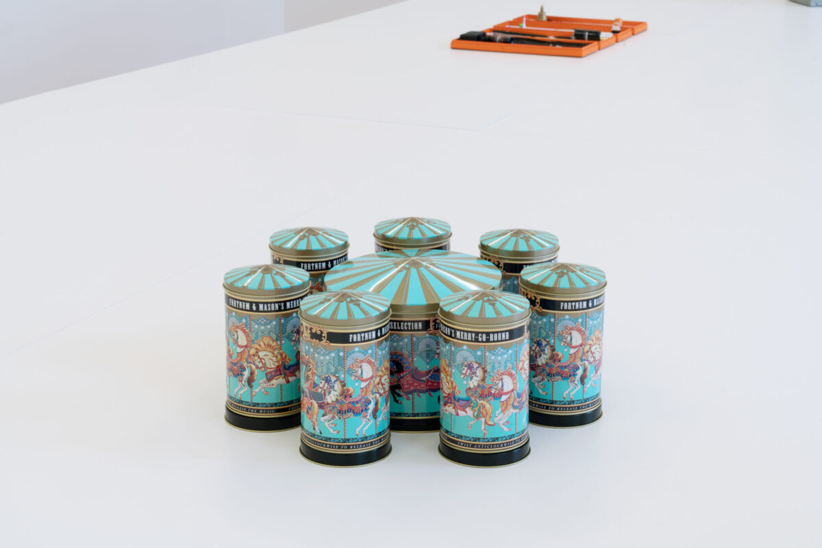 Fortnum and Mason besteht aus Musikboxen des gleichnamigen, britischen Luxus-Kaufhauses. Das nostalgiebeladene, mit einem Pferdekarussell bedruckte Produkt ist gleichzeitig Biskuitdose und Musikbox. Für die Arbeit von Camille Aleña wurden die originalen Melodien und Drehmotoren beibehalten, transformiert und neu arrangiert zu einer sich alle sechs Minuten wiederholenden, geisterhaften Choreographie.