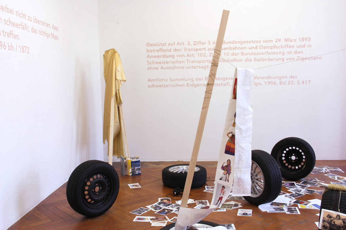 MO DIENER (*1961) bearbeitet schon seit Jahren unterschiedliche Aspekte der Geschichtsschreibung zu den ethnischen Minderheiten der Roma und Jenischen. Doch sie versteht sich weniger als Historikerin denn als Künstlerin, die mit Geschichte unverfänglich, engagiert, ja aktivistisch umgeht. Dabei funktioniert ihre Arbeitsweise über Interviews mit Historikern sowie Angehörigen der Minderheiten, der Recherche in meist privaten, inoffiziellen Archiven und dem Internet. Doch münzt sie dieses Material zu performativen und räumlichen Interventionen um, die Fragen der sozialen Ausgrenzung, gesellschaftlichen Stigmatisierung und medialen Repräsentation problematisieren. Ihr so vorgeführtes Archiv suggeriert nicht objektivierende Distanziertheit, sondern konzipiert sich als Ort einer physisch-sinnlichen Erfahrbarkeit. In der Ausstellung kommt dies vor allem zutragen bei den beiden in rosa an die Wand geschriebenen historischen Gesetzesartikel zu Transportbestimmungen und staatlicher Kontrolle sowie den am Boden wild verstreuten Bildern, die bei der Google Stichwortsuche «Zigeuner» gefunden wurden. Ersteres scheint in dieser Form weniger Härte als vielmehr eine flüchtige, grundlegend kontingente Verfasstheit nahezulegen. Zweiteres lässt die äusserst klischierten Darstellungen zu einer wertlosen, aber schier endlosen Ansammlung werden. Die vorhandenen Räder, zentraler Bestandteil von Mobilität, lesen sich in dieser Anordnung eher als vereinzelt, aus dem Zusammenhang gerissen. Sie kommentieren die Situation der Fahrenden, welche bis in die 1970er Jahre in der Schweiz durch verschiedene Verbote (bspw. dem Familienverbot) von ihrer nomadischen Existenzweise weitgehend abgehalten wurden, eine Existenzweise, die bis heute, in einer Zeit des globalen Jetsets, für staatliche Reglementierung im Rahmen von Stellplätzen sorgt. Weiters sind Interviews mit dem Rom Liviu Dinu, Soziologe aus Rumänien, und dem Schweizer Historiker Dr. Thomas Huonke-r sowie Videogespräche mit Jenischen der Fahrenden Gemeinschaft an der Feckerchilbi in der Intervention zu hören, bzw. sehen. Am 28. März wird Mo Diener zusammen mit eingeladenen Gästen eine performative Intervention im PROGR-Innenhof realisieren.