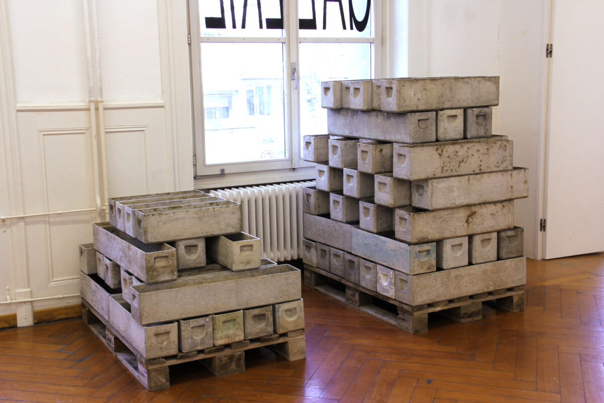 ALAIN JENZER (*1974) sammelt schon seit vielen Jahren graue Eternit-Blumenkisten in Brockenhäusern und auf Flohmärkten. In spielerischer Weise bringt er diesen Fundus immer wieder zu Gebilden, installativen Arrangements und räumlichen Anordnungen zusammen und testet das mit Spuren versehene, sehr sinnliche Material auf dessen narratives Potential. Für die aktuelle Ausstellung hat Jenzer die Kisten aber nicht in eine möglichst evokative, sprechende Form gebracht, sondern vergleichbar mit ihrer Lagerung im Atelier auf Paletten geordnet. Das ganze Ausmass seiner Sammlung vor Augen führend, folgt die Präsentation nicht ausschliesslich platzsparenden Prinzipien, sondern Jenzer expliziert vielmehr sein sonst implizit eingesetztes Wissen um die Beschaffenheit der Kisten. Seine bisherige Beschäftigung mit diesem Material führte dazu, dass er die Kisten nach sich ständig ändernden Kriterien, bspw. Eck- oder Griffformen, sortiert und je spezifisch installativ einsetzt um eine bestimmte visuelle Wirkung zu erzeugen. Für KunstArchivKunst macht er diese sonst im Arbeitsprozess getätigte Sortierung zum finalen Werk, gruppiert seinen «Bausatz» (Jenzer) nach Form- und Volumenkriterien und exemplifiziert dabei einen klassischen Mechanismus eines Archivs: das Ordnen nach Kriterien.
