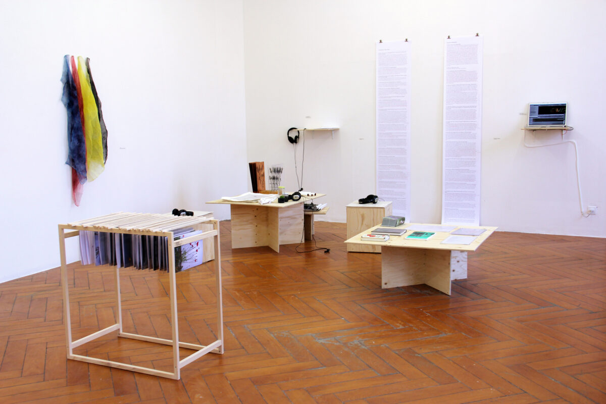 Die Befragung von eigenen Arbeitsprozessen findet sich auch bei JAQUELINE BAUMs (*1966) und URSULA JAKOBs (*1955) multimedialer Installation, die Materialien aus ihrem mehrjährigen künstlerischen Forschungsprojekt Connected in Isolation beinhaltet. Das Projekt, welches sich dem Überthema der Isolierung und Reproduktion von Natur widmete, wird hier in eine verräumlichte Form übertragen und als konsultierbare Archivstätte inszeniert. Ausgehend von dem anfänglichen Interesse an wilden, einheimischen Blumen, die Baum / Jakob auf Wanderungen entdeckten, vor weissem Brett fotografierten und in Heliogravuren reproduzierten, erschlossen sich die beiden im Laufe des Forschungsprojekts andere künstlerische und gesellschaftliche Bereiche rund um die Thematik der Isolierung und Reproduktion von Natur. Mittels Recherchen, Interviews und Videoaufnahmen wurden Aspekte der Botanik, der naturalistischen Malerei, der künstlichen In-Vitro-Reproduktion von Pflanzen im Labor sowie der monokulturellen Tulpenzüchterei in einer Industrie-Anlage behandelt. Ein nochmaliges Konsultieren des Materials nach einer ersten Formfindung des Projekts resultierte in der hier’tu sehenden Re-Interpretation. Die ersten finalen Erzeugnisse – Heliogravuren, Fotogramme und eine Videoinstallation – werden hierbei sekundär, eher rücken die Quellen, technischen und inhaltlichen Zwischenstationen in den Vordergrund: botanische Bestimmungsliteratur; Probedrucke, Druckplatten, Wischtücher; zusätzliche technische Erläuterungen; verschiedene editorische Zustände der Interviews sowie der Blick in das Video-Schnittprogramm sind zu sehen. Das ganze Setting wird von den Stimmen der Künstlerinnen als Audiokommentar begleitet.