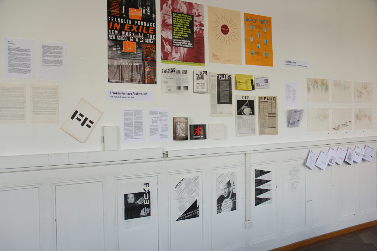 Bezüglich diesem archivtheoretischen Überbau masst sich KunstArchivKunst nicht an, Antworten zu geben, was die Ausstellung aber will, ist hinsichtlich nationalen und internationalen Archiven, Online-Datenbanken, Künstler-Dokumentationsstellen und Nachlassverwaltungen Informationen bereitzustellen. Dokumente zum Archiv Serge und Doris Stauffer, zum Ars Electronica Archiv, zur ART-Nachlassstiftung für Kunstschaffende Bern, zur Basis Wien, zum Bildwechsel-Bases Hamburg, zum DOCK Basel, zu fotoCH, zu Franklin Furnace New York, zum Medien Kunst Netz des Zentrum für Kunst und Medientechnologie Karlsruhe, zum Rheinisches Archiv für Künstlernachlässe, zur Schweizerischen Nationalbibliothek, zum SIK-ISEA, zur visarte sind vorhanden und können kopiert oder käuflich erworben werden. Als besonders reichhaltig ist dabei die Materialauswahl, welche das 1976 gegründete New Yorker Franklin Furnace Archive zur Verfügung stellt, unter anderem das von Künstlerinnen gestaltete Mitteilungsblatt The Flue, welches in der Erstausgabe vom September 1980 vorliegt.