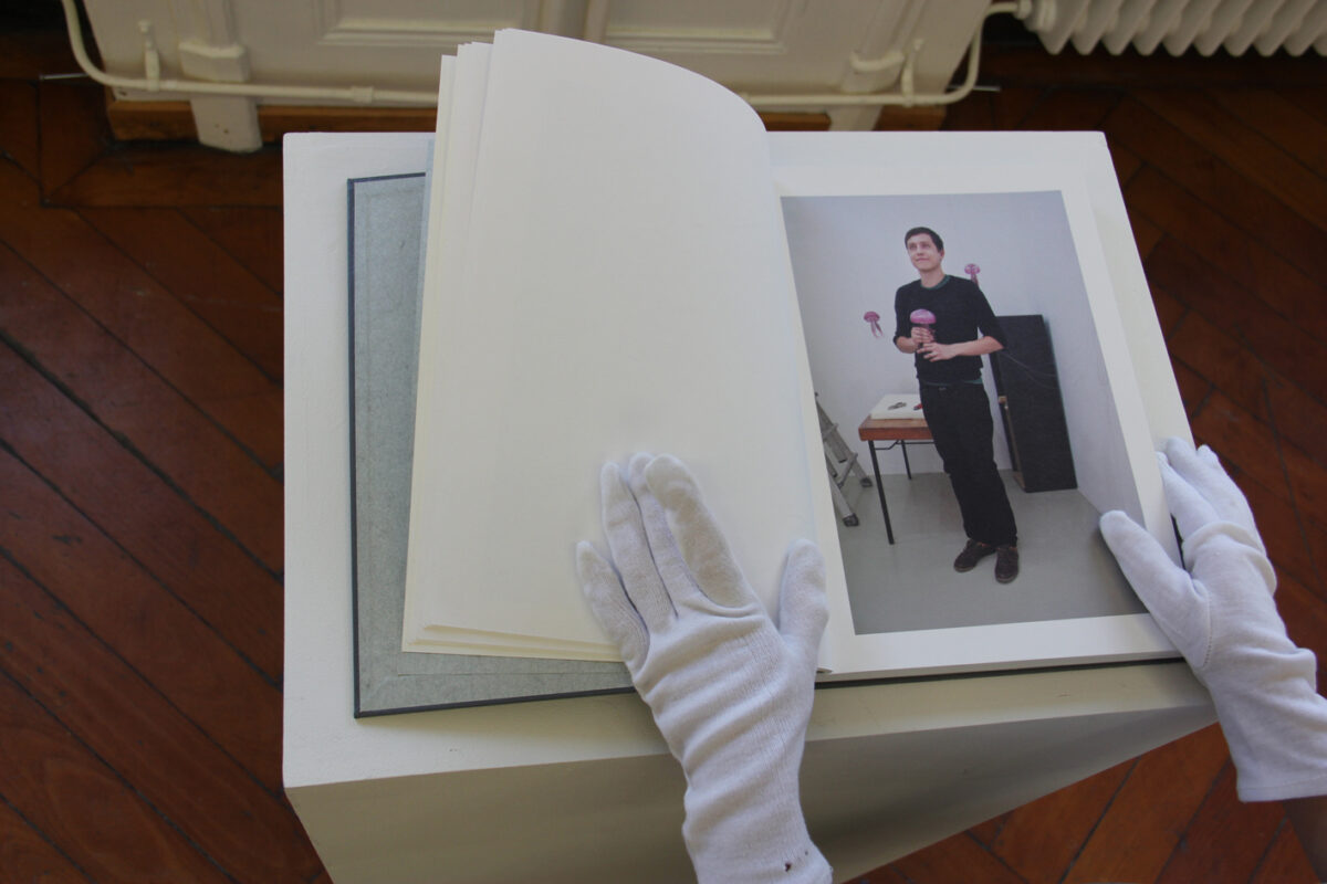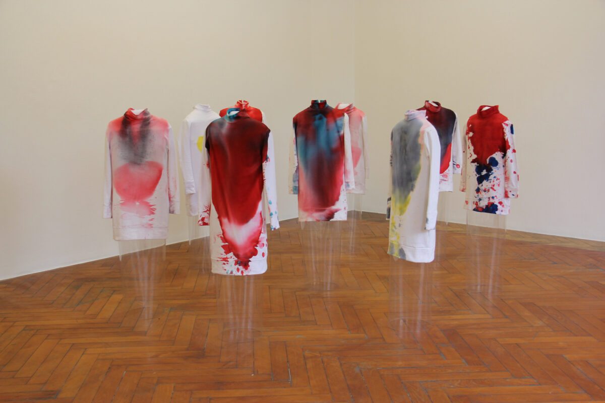 SASKIA EDENS Kleider sind als Relikte ihrer Performances ausgestellt. Sie sind begleitet von Fotografien, die die Künstlerin in unterschiedlichen Verfassungen zeigen. Auch hier spielt Zeit eine Rolle, sie erlaubt die Übersetzung vom Gemütszustand ins Visuelle. Ein Abgesang auf eine Generation von sich still schweigend Ergebenden findet sich zur Zeit in der Stadt Bern und im Internet.