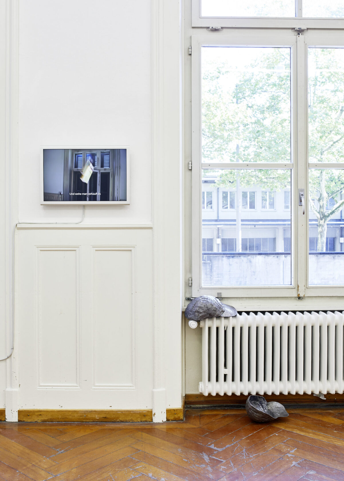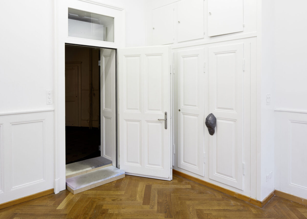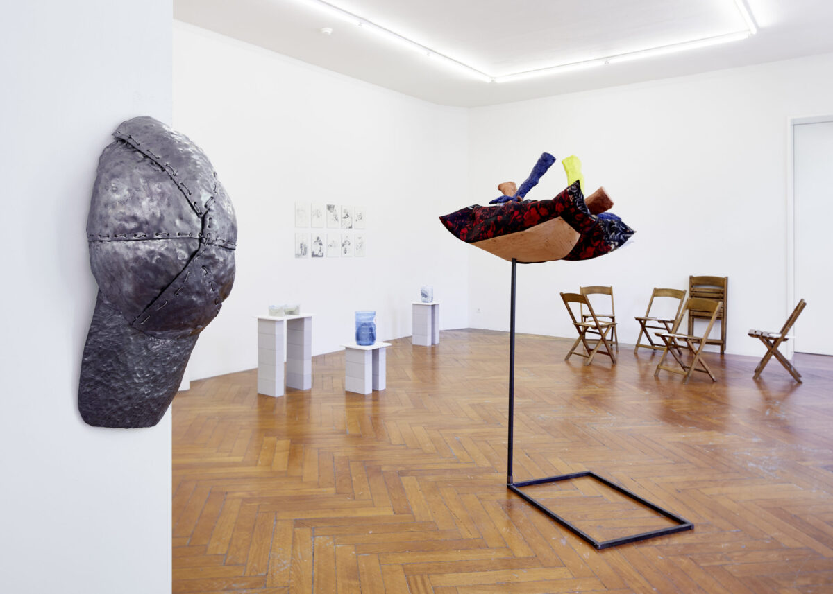 In den Räumen verteilt, wie liegengeblieben oder vergessen, verteilt sich Selina Lutzs Arbeit I’m afraid of measured time / I’m afraid of failing / I’m afraid of balance I’m afraid I’m not dealing with conventions as freely as I think I am / I’m afraid of the fear. An ein lässiges und in der Kunstszene häufig getragenes Mode-Accessoire erinnernd, wirken die Hüte durch ihre Materialität gleichzeitig schwerfällig. Als Titel formuliert die Künstlerin Ängste, die sie als mögliche applizierte Schriftzüge für die Caps versteht, und die sich aus dem Kunstmachen ableiten lassen.
