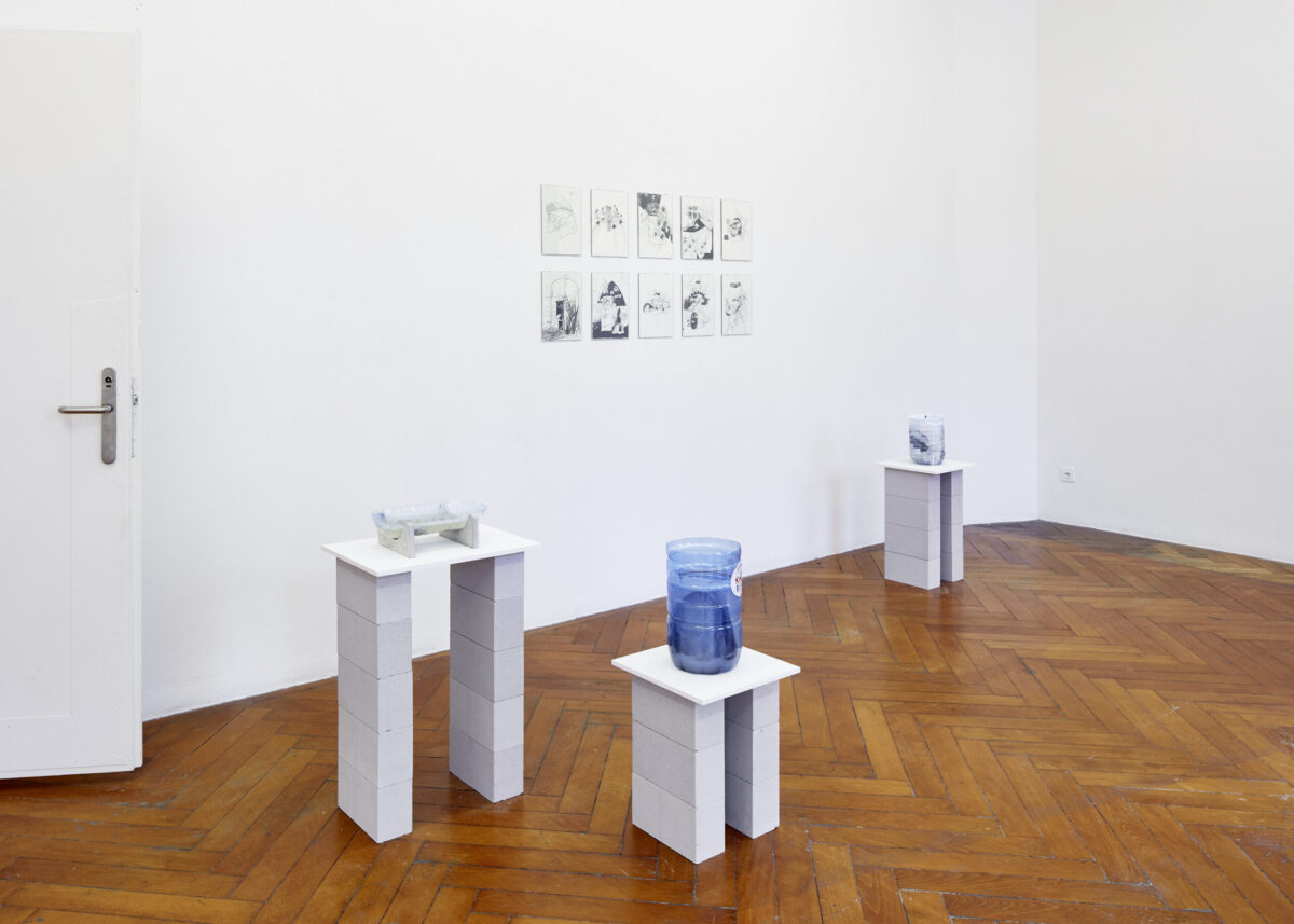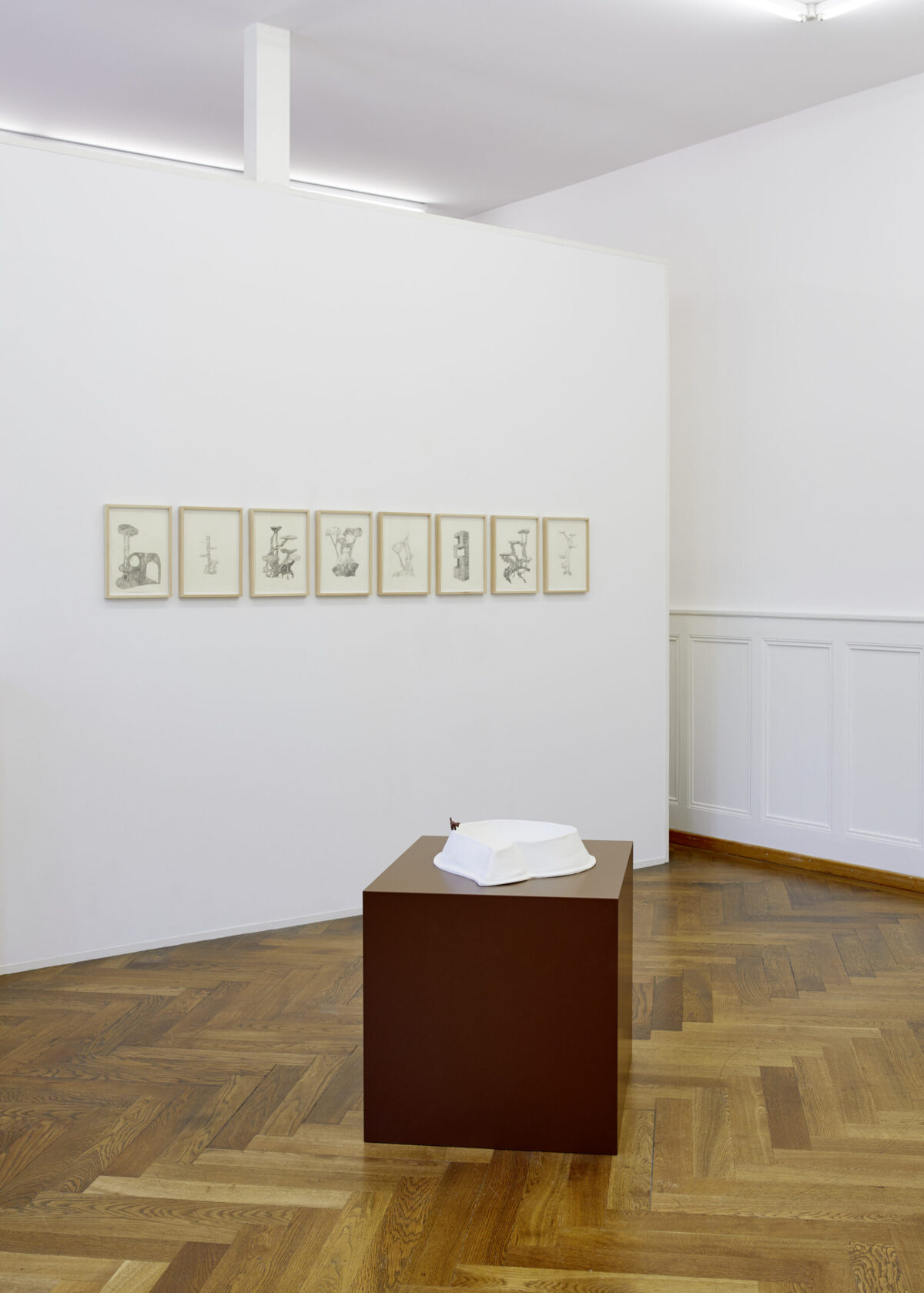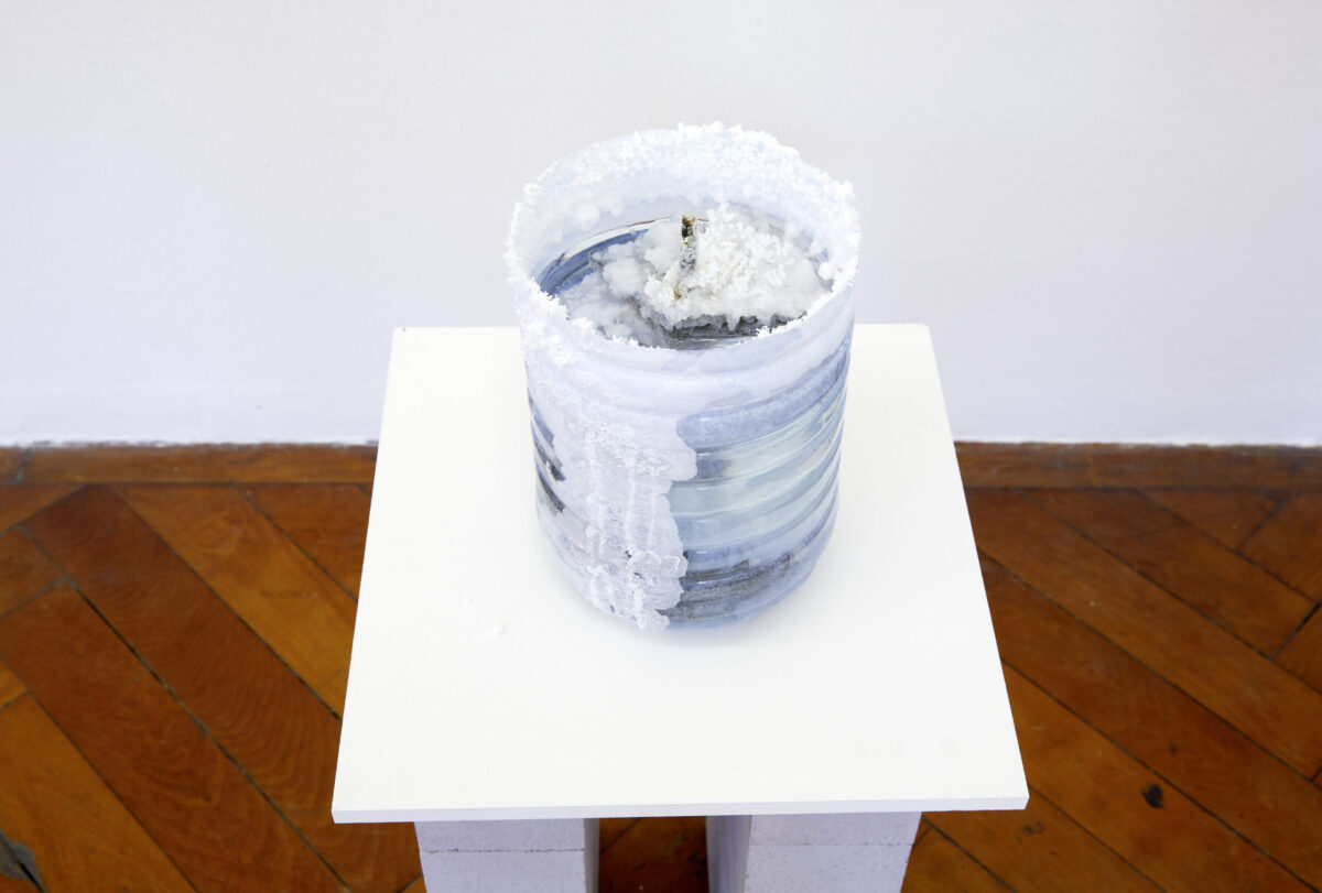 TANIA LAERI arbeitet an einem Langzeitprojekt in Albanien, in dem sie kommunistische Einmann-Bunker ausgräbt und die Betongehäuse im Meer als künstliche Riffs ansiedelt. Kommunitäten und Grundstein I, II und III sind freie Interpretationen davon, wie das Zusammenleben in den neu entstandenen Ökosystemen aussehen könnte. In den PET-Behältern kristallisiert das Salzwasser mit der Zeit und setzt sich an den Objekten fest, die Laeri aus architektonischen Details des Schwob-Hauses abgeleitet hat.