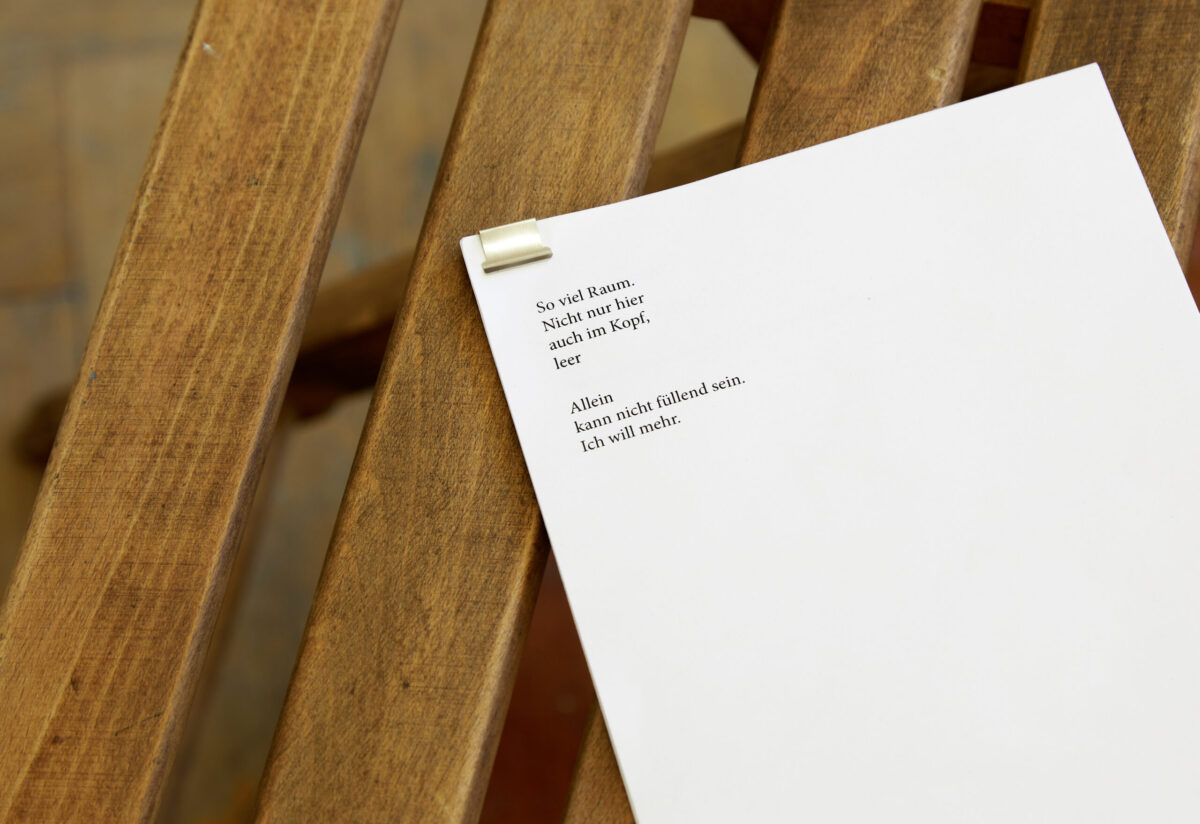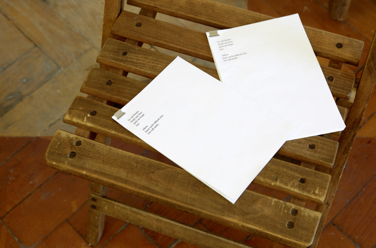 Die Arbeit Nimm Platz von NICOLE BUSSIEN (*1991 in Olten, lebt und arbeitet in Bern) und GIORGA PIFFARETTI (*1989 in Mendrisio, lebt und arbeitet in Bern) besteht aus einem Text und sieben Klappstühlen. Über mehrere Seiten münden fragmentarische Dialoge und Gespräche in eine Gruppendiskussion. Die Anordnung der Stühle geschieht zufällig – die Besucherinnen können sich setzen um den Text zu lesen oder um sich in einer Gruppe ebenfalls zu einer Diskussion zusammenzufinden.