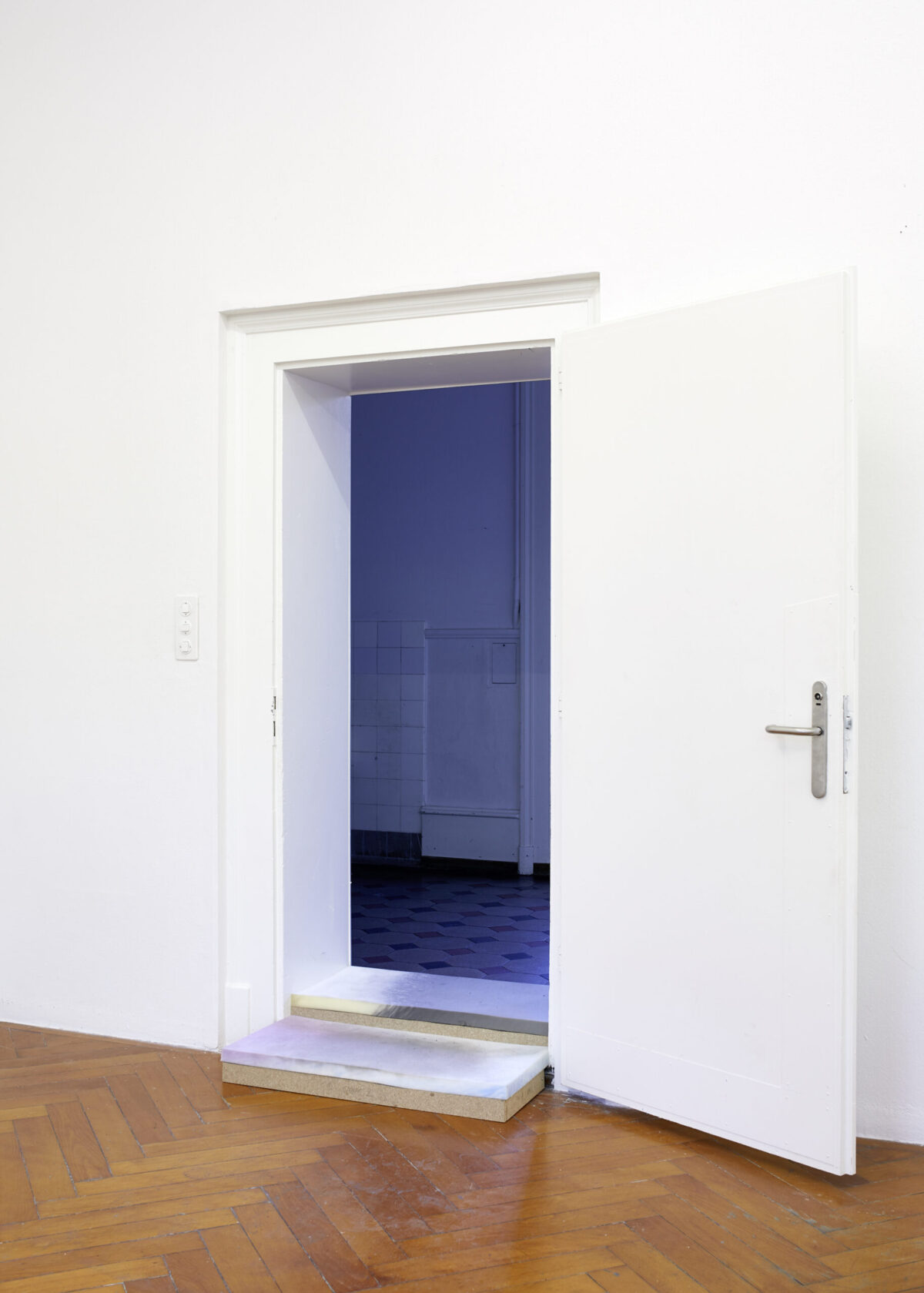 MARTA MARGNETTI (*1989 in Mendrisio, lebt und arbeitet in Bern und Lugano) besetzt mit ihrer Arbeit Mind the gap die beiden Räume zwischen den Glastüren und den eigentlichen Zimmertüren und markiert damit die Stelle zwischen Aussen und Innen. Die Fussabtreter-ähnlichen Objekte aus Schaumstoff legen sich in den Weg der Besucherinnen und werden vom dadurch hereingetragenen Schmutz in ihrer Farbigkeit während der Ausstellungsdauer verändert.