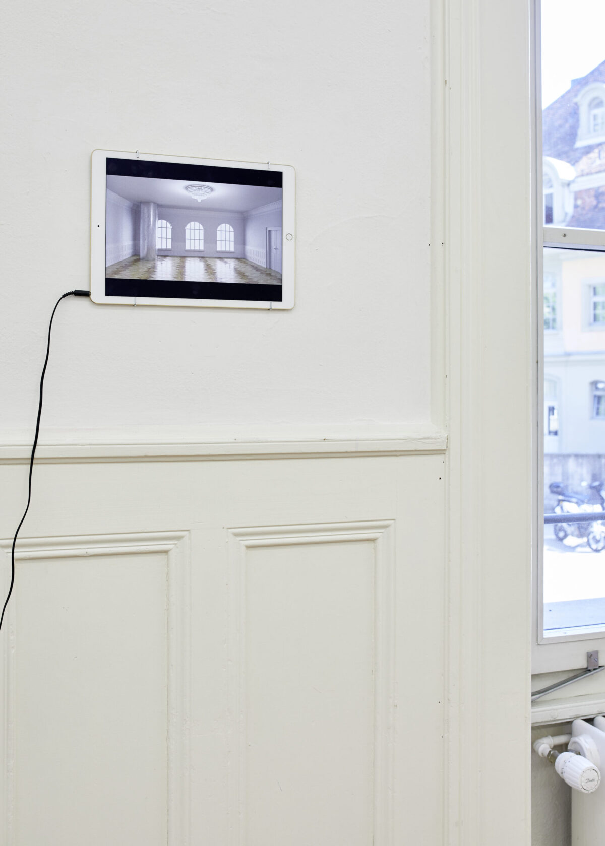 Die Arbeit When you turn right, you see a door von FIONA RAFFERTY (1990 in Wettingen, lebt und arbeitet in Bern und Stockholm) nimmt uns mit auf einen Rundgang durch eine Wohnung. Das Audiomaterial stammt von einem Skype-Gespräch, das Rafferty mit dem 3D-Gestalter Nils Ekman geführt hat. Aus der Erinnerung versucht sie Ekman eine genaue Beschreibung des Schwob-Hauses zu geben. Anschliessend rekonstruierte er anhand seiner Vorstellung ausgewählte Räume digital.