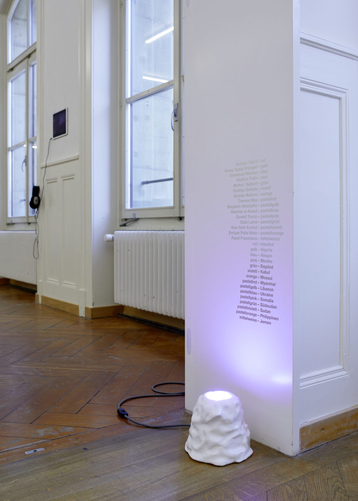 Die Skulptur A word‘s light von PHILIP ORTELLI (*1991 in Bern, lebt und arbeitet in Bern und Amsterdam) besteht aus einem klumpigen Gefäss und einer Glühbirne, die mit dem Internet verbunden ist – als Lampe beleuchtet sie bunt einen Schriftzug an der Wand. Dieser nennt ein Spektrum an Farben, die jeweils einem bekannten Namen und einer politischen Krisenregion zugeordnet sind. Diejenige der definierten Personen, die als letztes getwittert hat, generiert die konstante Farbe des Lichtes, während ein kurz aufblitzender Farbton mit einer beliebigen Person in der Region verknüpft ist.