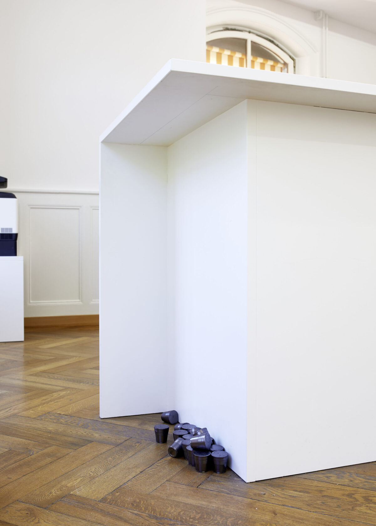 Ebenfalls beim Empfangspult stehen die Kaffeebecher Gaffeesatz für‘z Schwobhuus von TANJA LAERI (*1984 in Bern, lebt und arbeitet in Bern). Sind es Überbleibsel eines Gesprächs, das die Künstlerin mit den anderen Kunstschaffenden geführt hat?