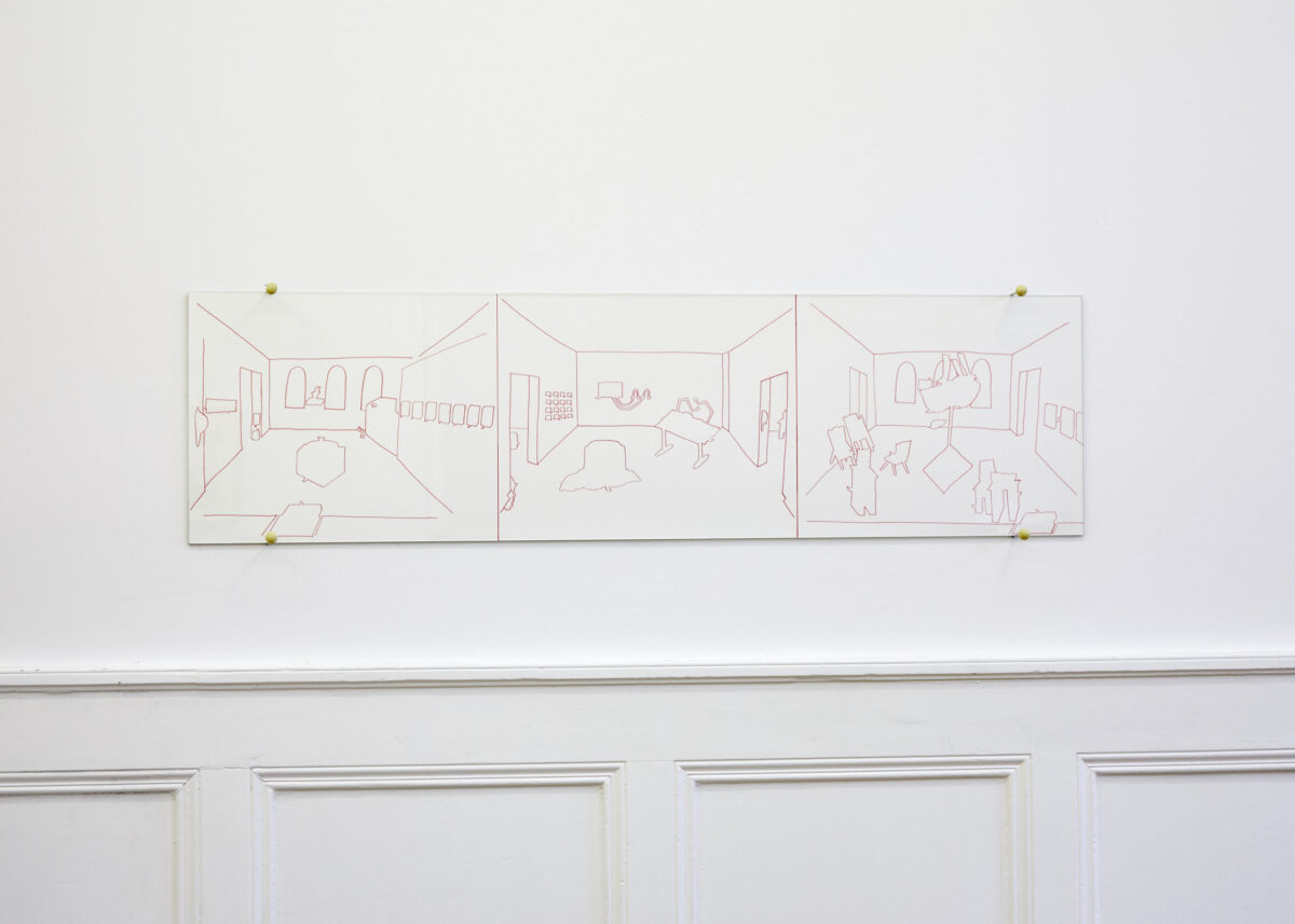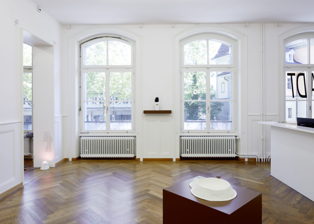 Auf dem Empfangstresen positioniert sich die Arbeit von DAMIANO CURSCHELLAS (*1990 in Ilanz, lebt und arbeitet in Bern und dem Fürstentum Liechtenstein). Extended Position erweitert die Fläche des Saalplans um eine weitere Legende. Ausgehend von der Beziehung zwischen Gast und Gastgeber betont die Arbeit den Moment, in dem die Anwesenheit eines Besuchs dessen gleichzeitige Abwesenheit an einem anderen Ort bedeutet.