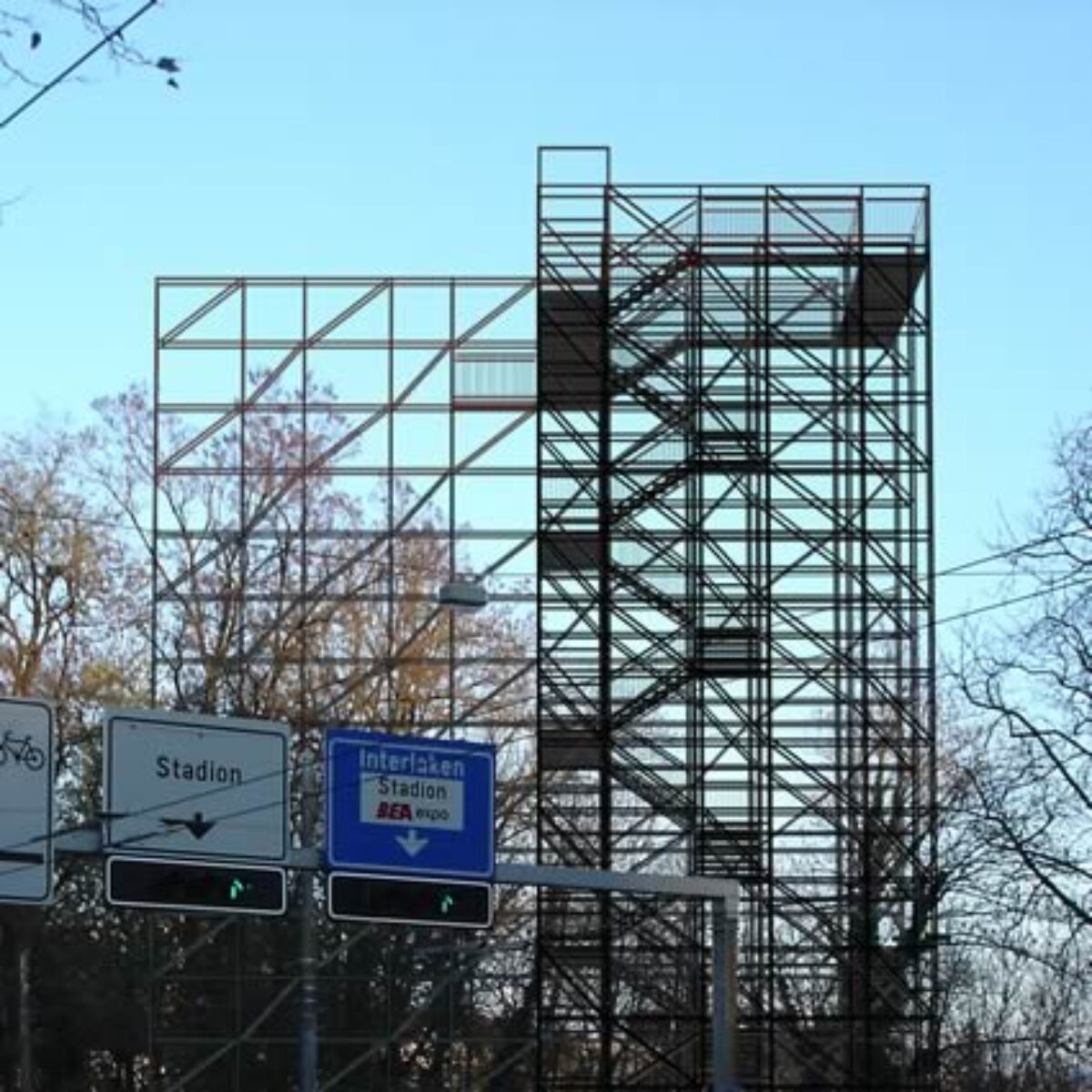 Ein veritabler Höhepunkt unserer Reihe Urbane Gerüchte ist die Intervention Poetry makes nothing happen des Künstlers und Architekten RONNY HARDLIZ (Bern/ Rom). Dieses Projekt wird die letzte Ausstellung am jetzigen Standort des Stage Pavillons sein. Indem Hardliz einen 24 Meter hohen besteigbaren Turm aus Gerüstelementen über den Pavillon bei der Lorrainebrücke platziert, ermöglicht er den Besuchern einen ganz neuen Blick auf die komplexe Umgebung der Stadtgalerie. Der Turm macht die Qualitäten dieses zentralen Ortes am Brückenkopf sichtbar und zeigt seine Funktion als Scharnier zwischen verschiedenen Stadtteilen, bzw. unterschiedlichen sozialen Schichten.
