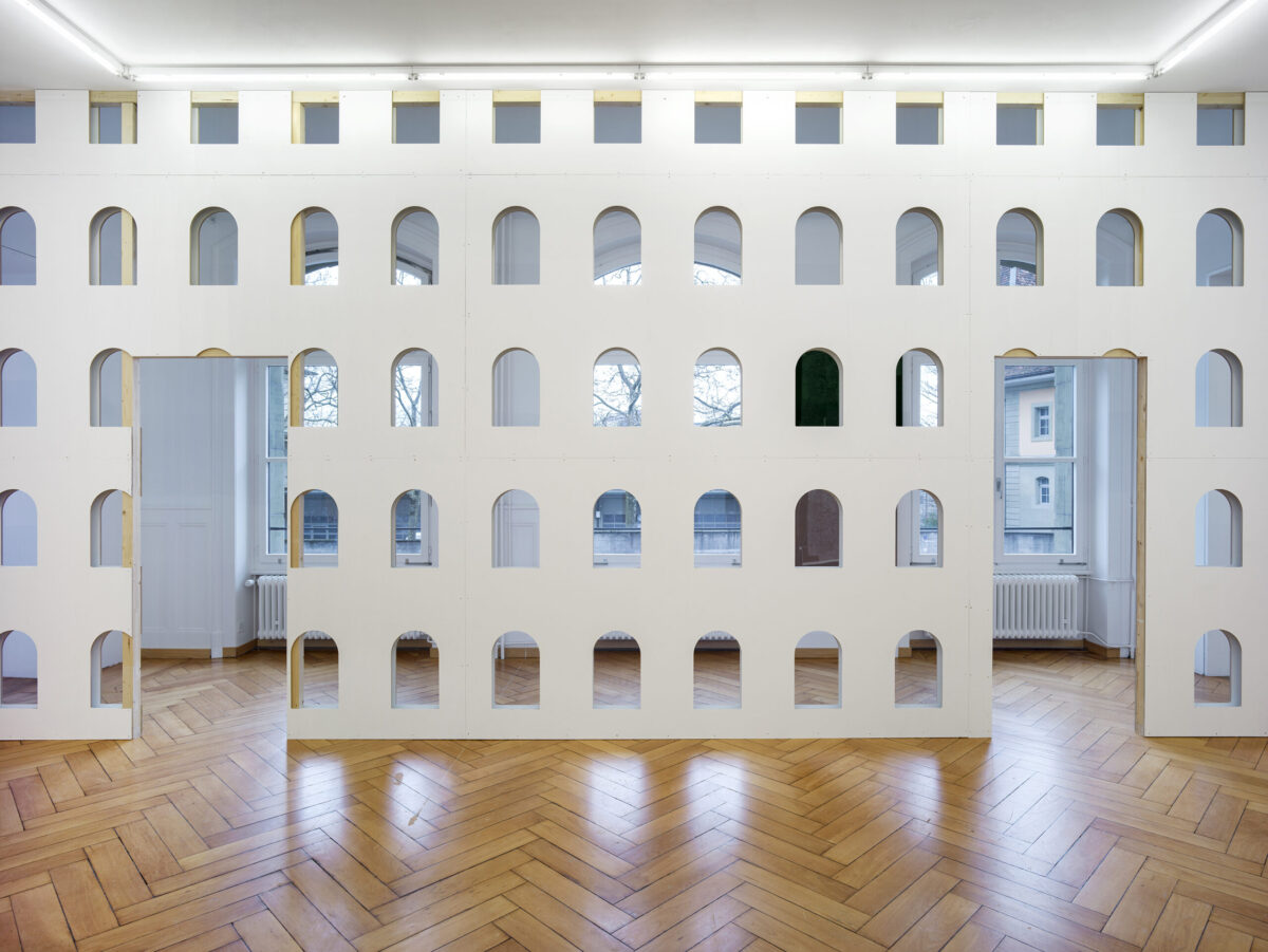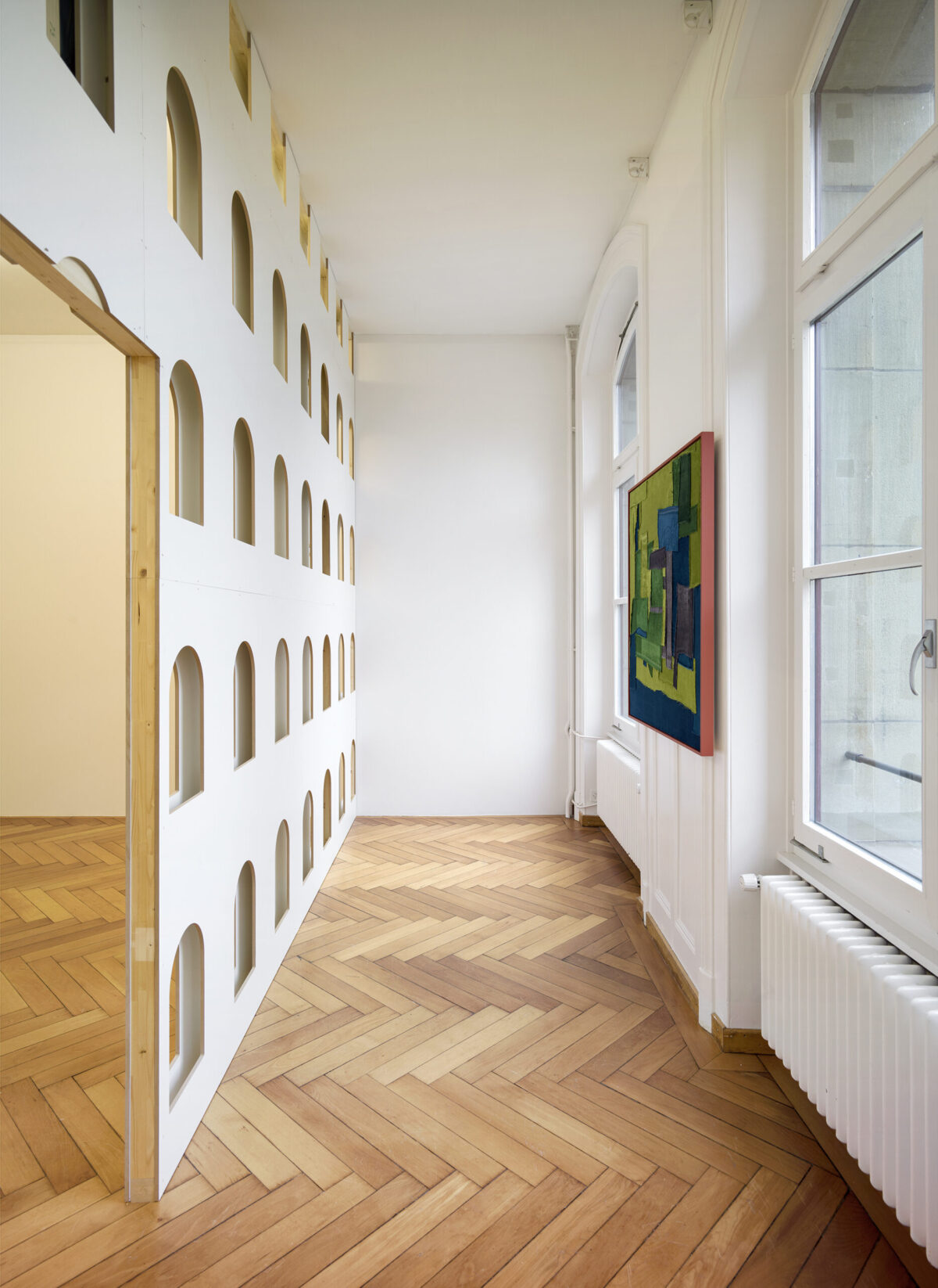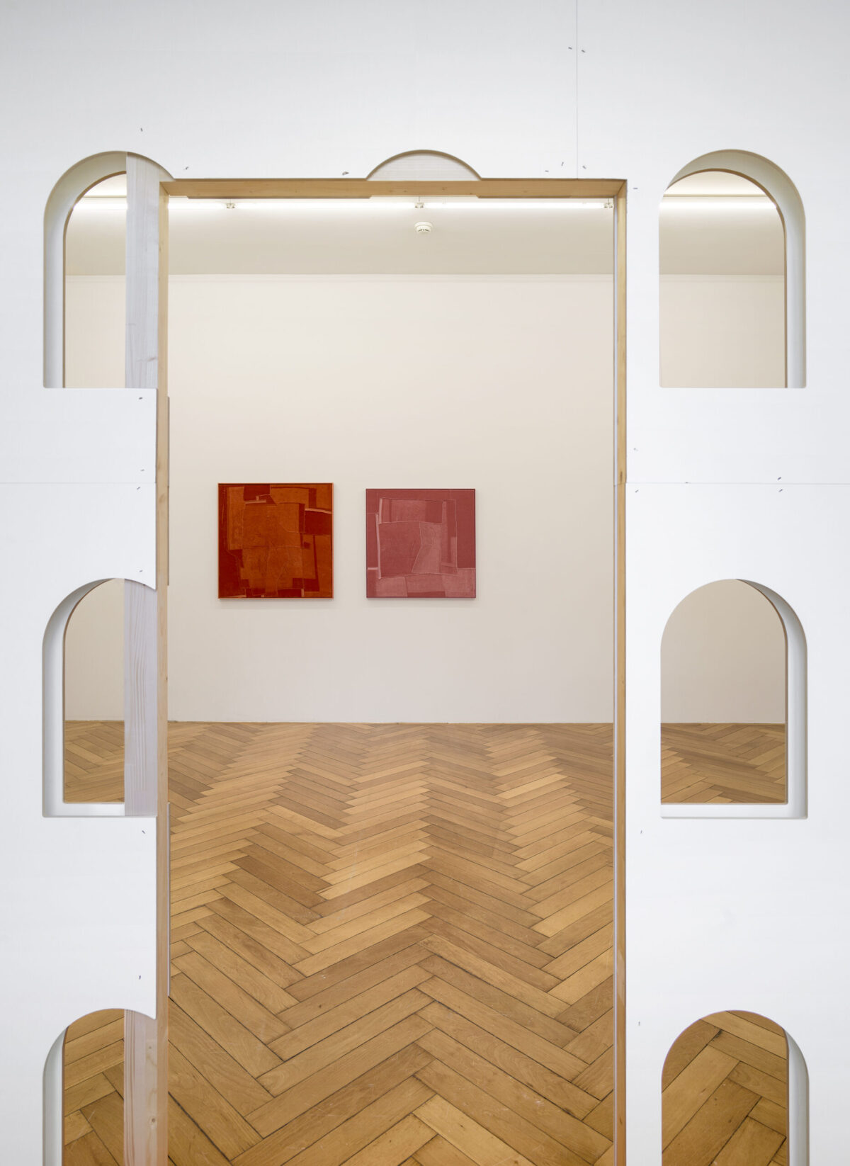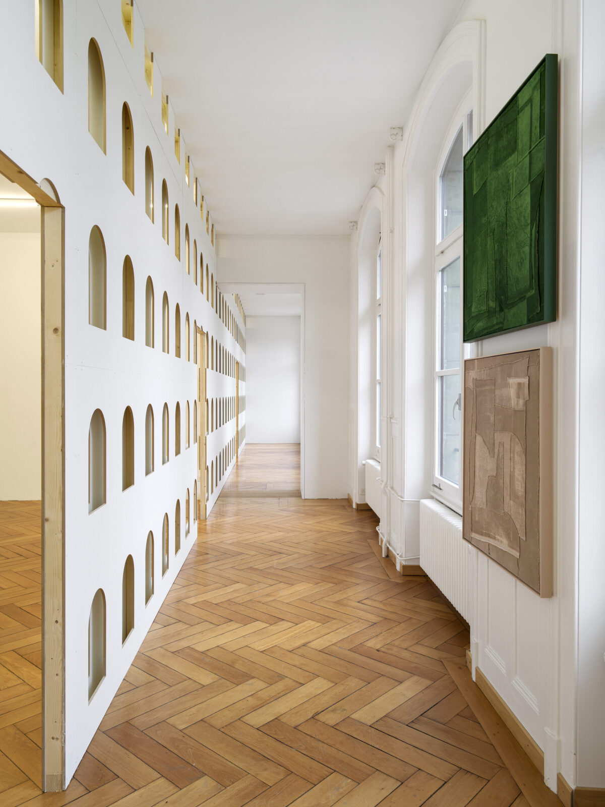 beschäftigt, die sie mit ihrer Sammlung realisiert haben. In der Stadtgalerie spitzt Cédric Eisenring diese Frage architektonisch zu. Eine Institution, ein Haus oder eine Villa auf Kindergrösse zu verkleinern, ist räumliche wie auch zeitliche Projektion – ein unbehagliches Bestehen auf Kontinuität. Dennoch bieten sie die Möglichkeit einer gewissen Autonomie. Es sind Räume, welche die meisten Erwachsenen nur geduckt betreten können. In PUDER müssen Massstäblichkeiten und Relationen ständig neu ausgehandelt werden. Eine Wand, die durch im Raster angeordnete Öffnungen perforiert ist, – wie eine hochskalierte Käseraffel, oder ein herunterskalierter Palazzo – erstreckt sich über die Länge der weiterführenden Räume der Stadtgalerie und bildet einen langen Korridor. Die so entstandenen Räume beherbergen eine angedeutete Gemäldegalerie von Bildern, deren Materialität sich zwischen repräsentativem Samt und geflickten Kinderhosen bewegt.