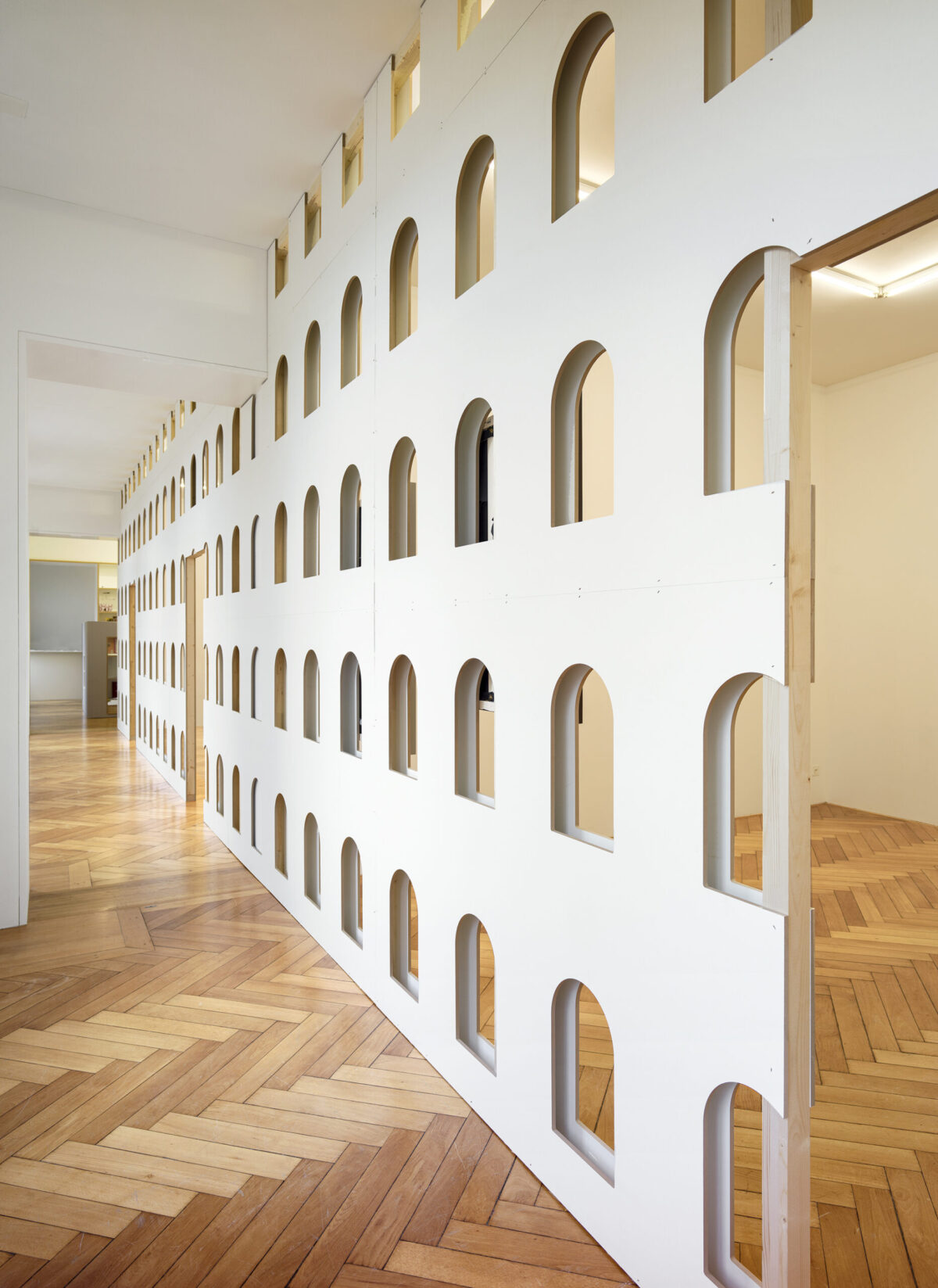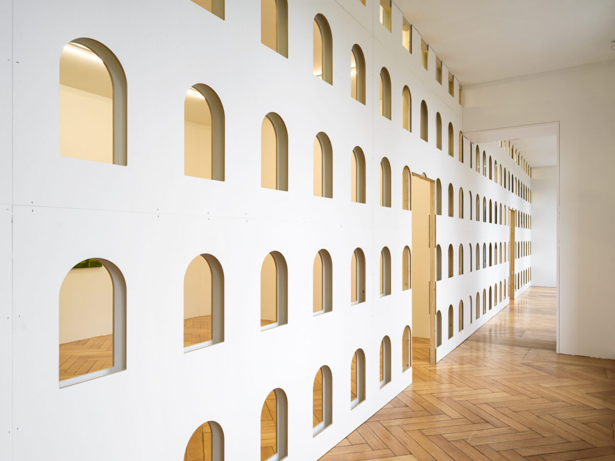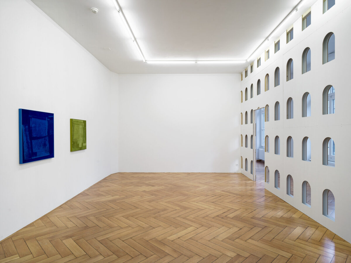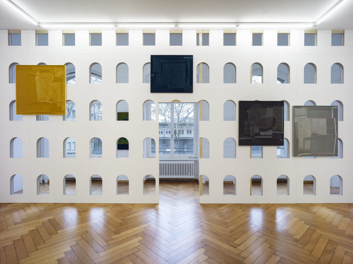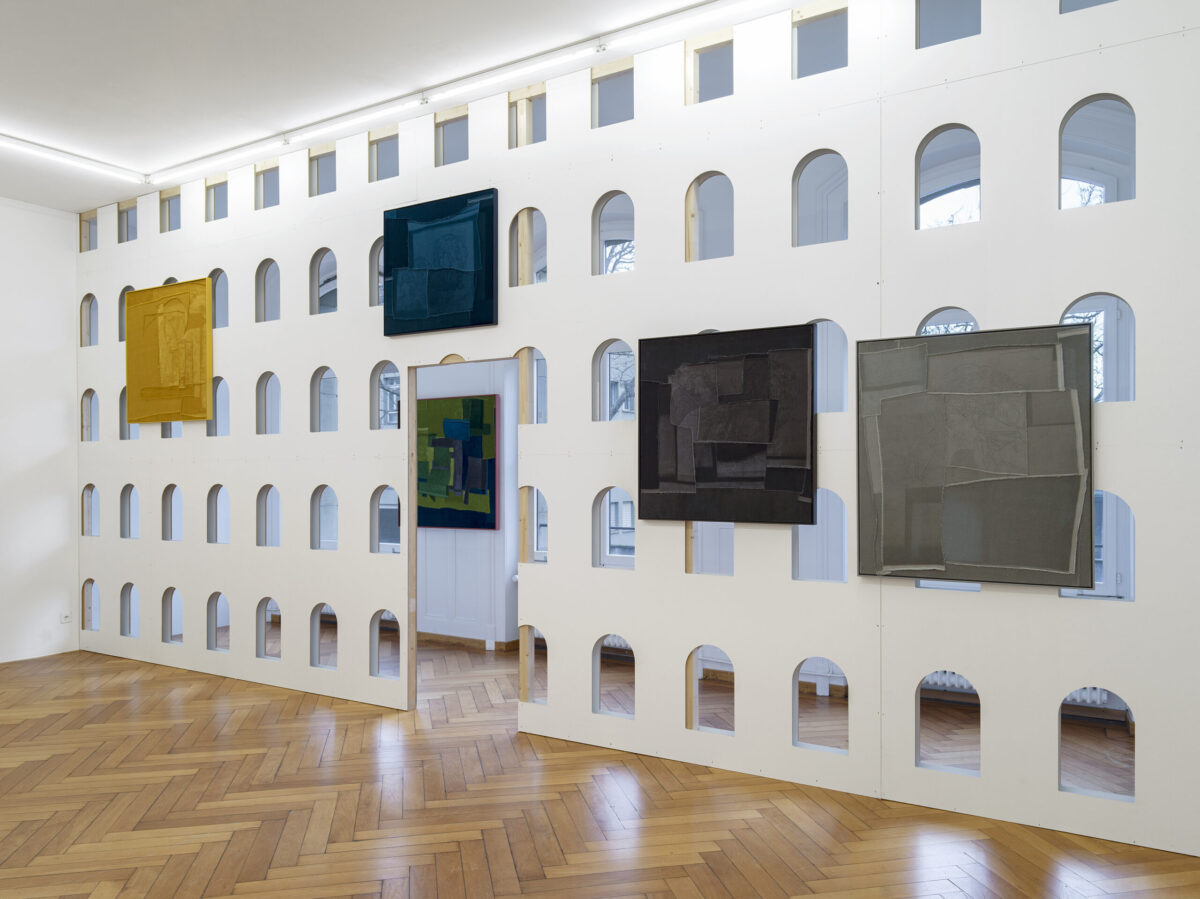 beschäftigt, die sie mit ihrer Sammlung realisiert haben. In der Stadtgalerie spitzt Cédric Eisenring diese Frage architektonisch zu. Eine Institution, ein Haus oder eine Villa auf Kindergrösse zu verkleinern, ist räumliche wie auch zeitliche Projektion – ein unbehagliches Bestehen auf Kontinuität. Dennoch bieten sie die Möglichkeit einer gewissen Autonomie. Es sind Räume, welche die meisten Erwachsenen nur geduckt betreten können. In PUDER müssen Massstäblichkeiten und Relationen ständig neu ausgehandelt werden. Eine Wand, die durch im Raster angeordnete Öffnungen perforiert ist, – wie eine hochskalierte Käseraffel, oder ein herunterskalierter Palazzo – erstreckt sich über die Länge der weiterführenden Räume der Stadtgalerie und bildet einen langen Korridor. Die so entstandenen Räume beherbergen eine angedeutete Gemäldegalerie von Bildern, deren Materialität sich zwischen repräsentativem Samt und geflickten Kinderhosen bewegt.