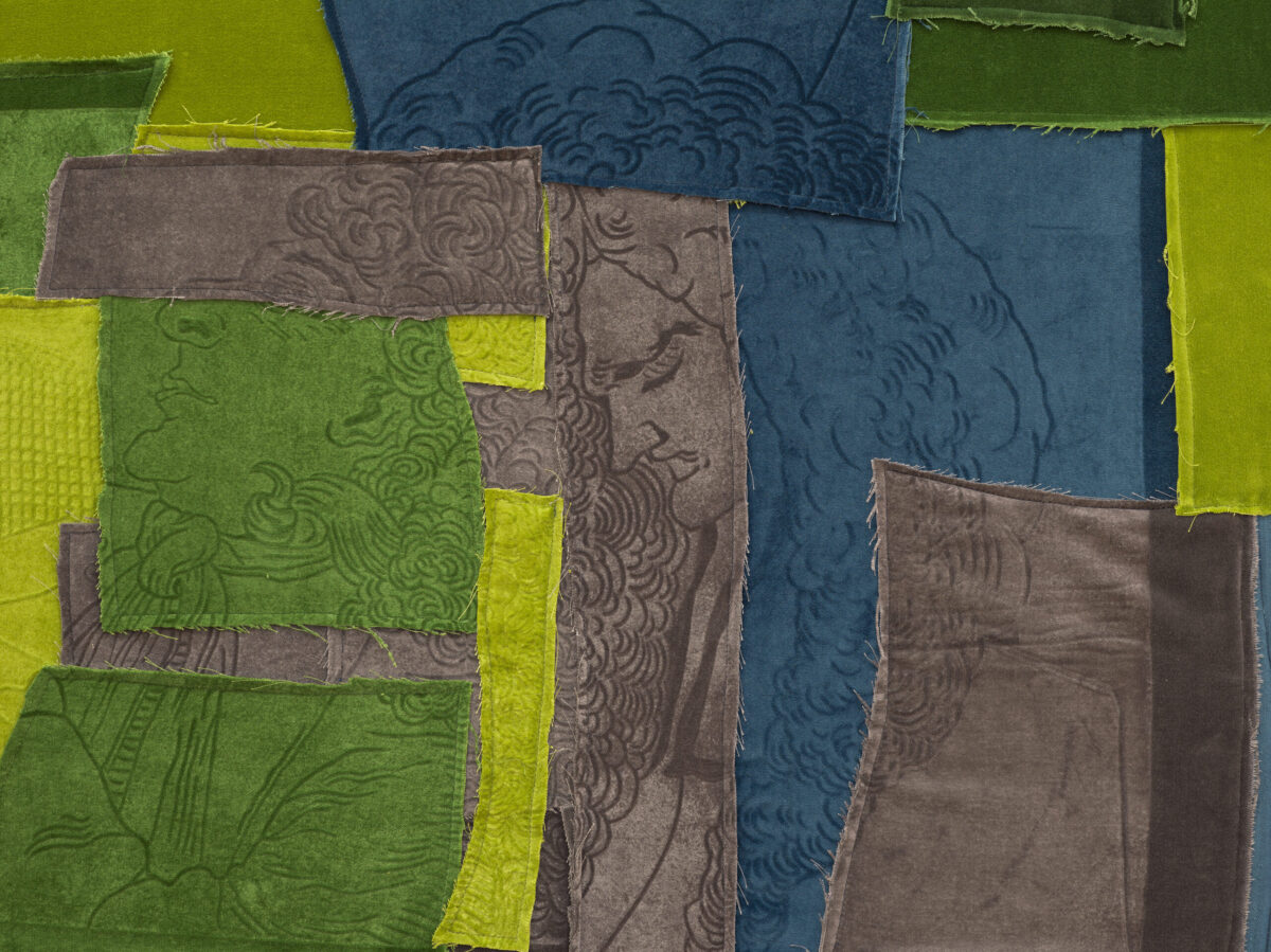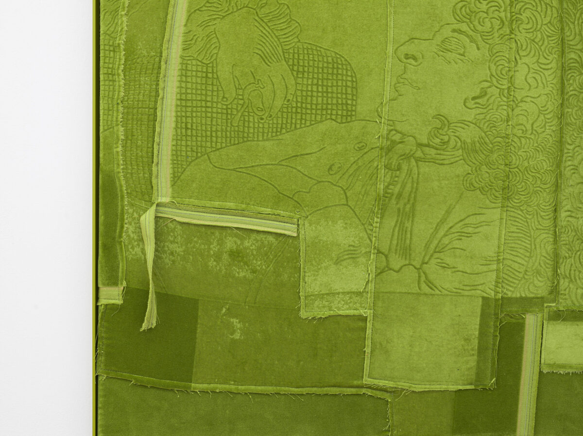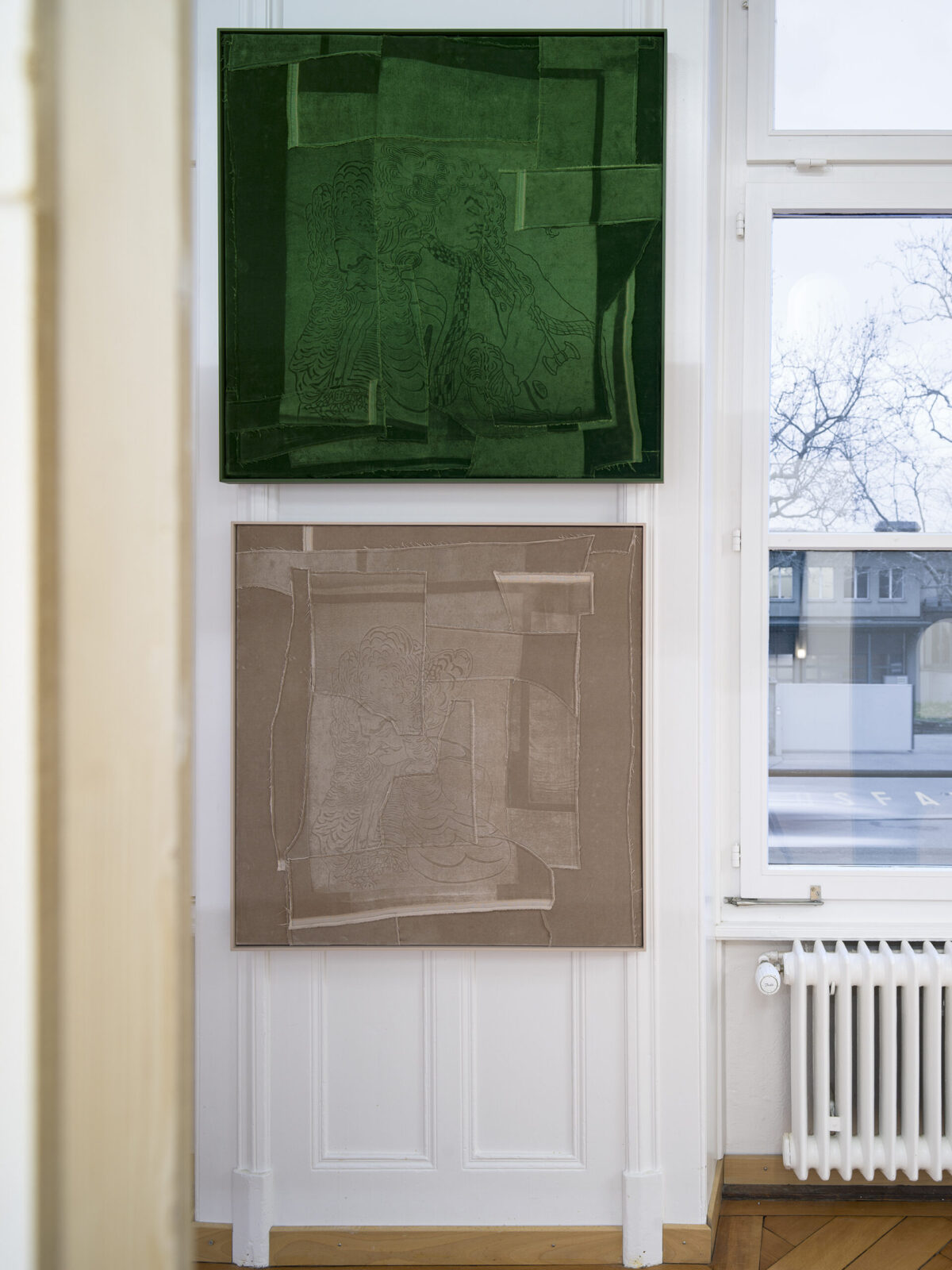 Die Drucke in PUDER entstanden ohne die Verwendung von Farbe. Unter Last pressen sich die Druckplatten in die Fasern des voluminösen und geräuschschluckenden Samts. In den Aushebungen des Holzschnitts bleiben die Fasern stehen, während sie flachgedrückt werden, wo die Platte auf dem Stoff aufliegt. Die Zeichnung, die durch diese Prägung entsteht, hebt sich mal schärfer und mal weniger scharf ab und ändert sich je nach Lichteinfall. Die durch Flicken fragmentierten Figuren in den Bildern schlafen. Ihre machtvolle Repräsentation ist nunmehr barocke Kulisse und ihre lockigen Perücken zeichnerisches Ornament. In den schlummernden Figuren hallen die politischen Karikaturen des 18. Jahrhunderts nach und ihre Kritik der aufkommenden Bourgeoisie an der Aristokratie. Die schlafenden Autoritäten haben – wie Gullivers Reisen – ihren Weg ins Kinderbuch gefunden und tauchen in Cédric Eisenrings Drucken als psychedelische Teppich-Projektionen auf. Cédric Eisenring interessiert sich in seiner Praxis für den Transfer und die Übersetzung von einem Medium zum anderen. Er bringt disparate Techniken und Motive zusammen. In früheren Arbeiten verwendete er beispielsweise Industrieabfall als Druckplatten für Kaltnadelradierungen, auf die er Motive kratzt, die der Geschichte des Drucks zu entstammen scheinen. Das eigentliche, gestanzte Industrieprodukt prägt sich als Leerstelle ins Papier. Seine Arbeiten beschwören ein kollektives Gedächtnis, während sie gleichzeitig ein ständiges Überschreiben und Verschwinden suggerieren. Zeitlich verweisen sie in alle Richtungen. Das Vergangene dringt geisterhaft durch.