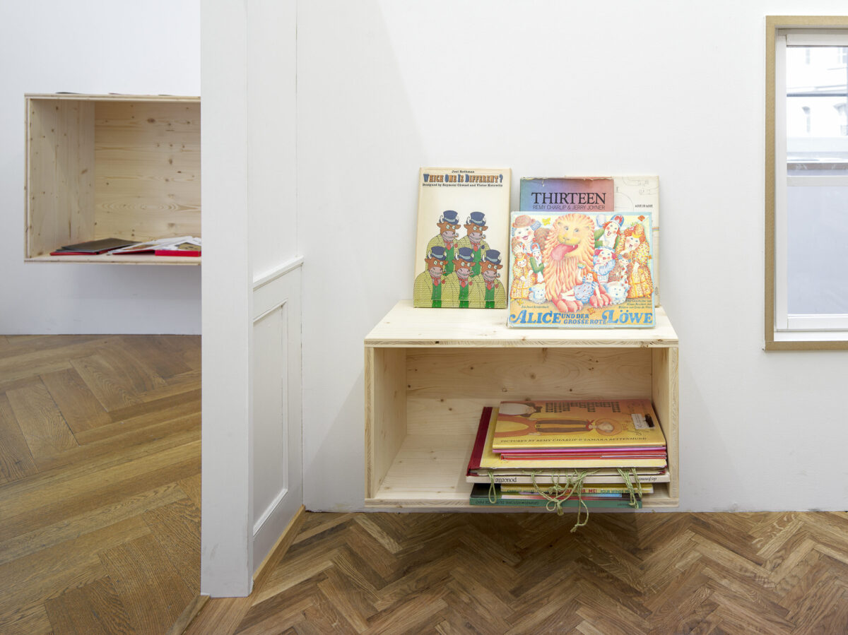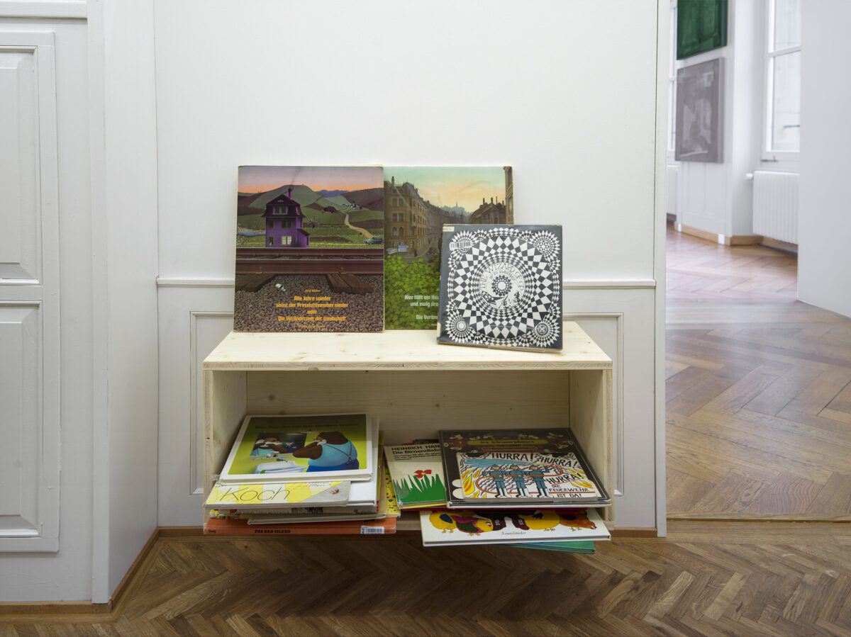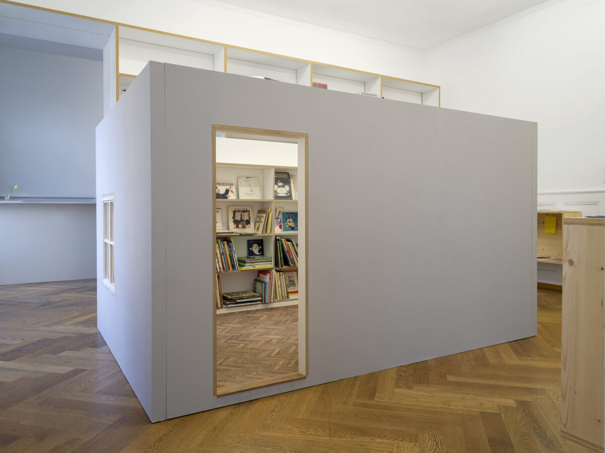 Die Büchersammlung eröffnet im ersten Raum die Ausstellung: In die bestehende Bibliothek der Stadtgalerie, mit ihrer Auswahl von Künstler*innen-Publikationen, platziert Cédric Eisenring einen weiteren Raum als Bibliothek in der Bibliothek. Es ist eine herunterskalierte Kopie desselben Raums, als ein Spiel mit Relationen, wie es in den Kinderbüchern zu finden ist – wo sich psychedelische Fieberträume mit Intertextualität und den Möglichkeiten der drucktechnischen Wiederholung vermengen.