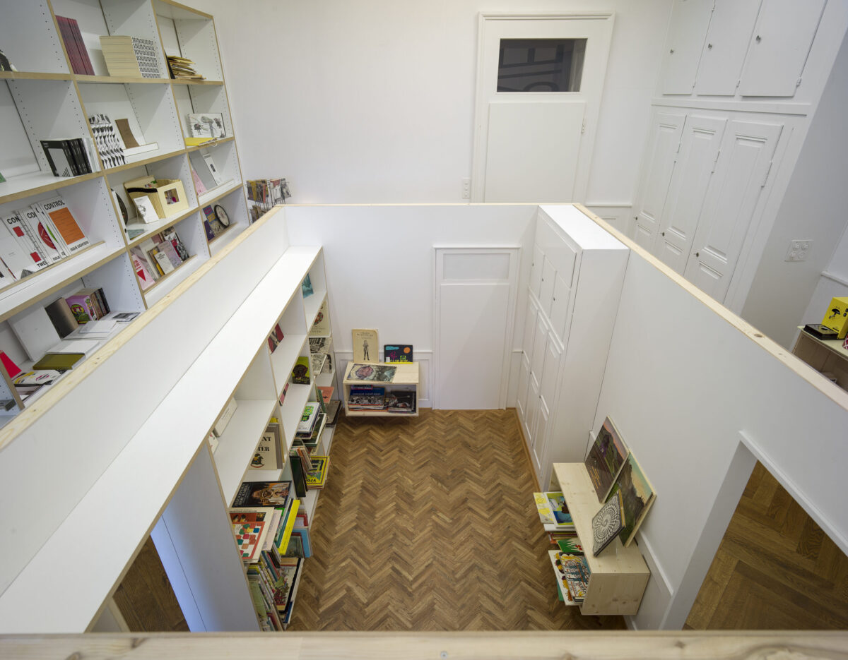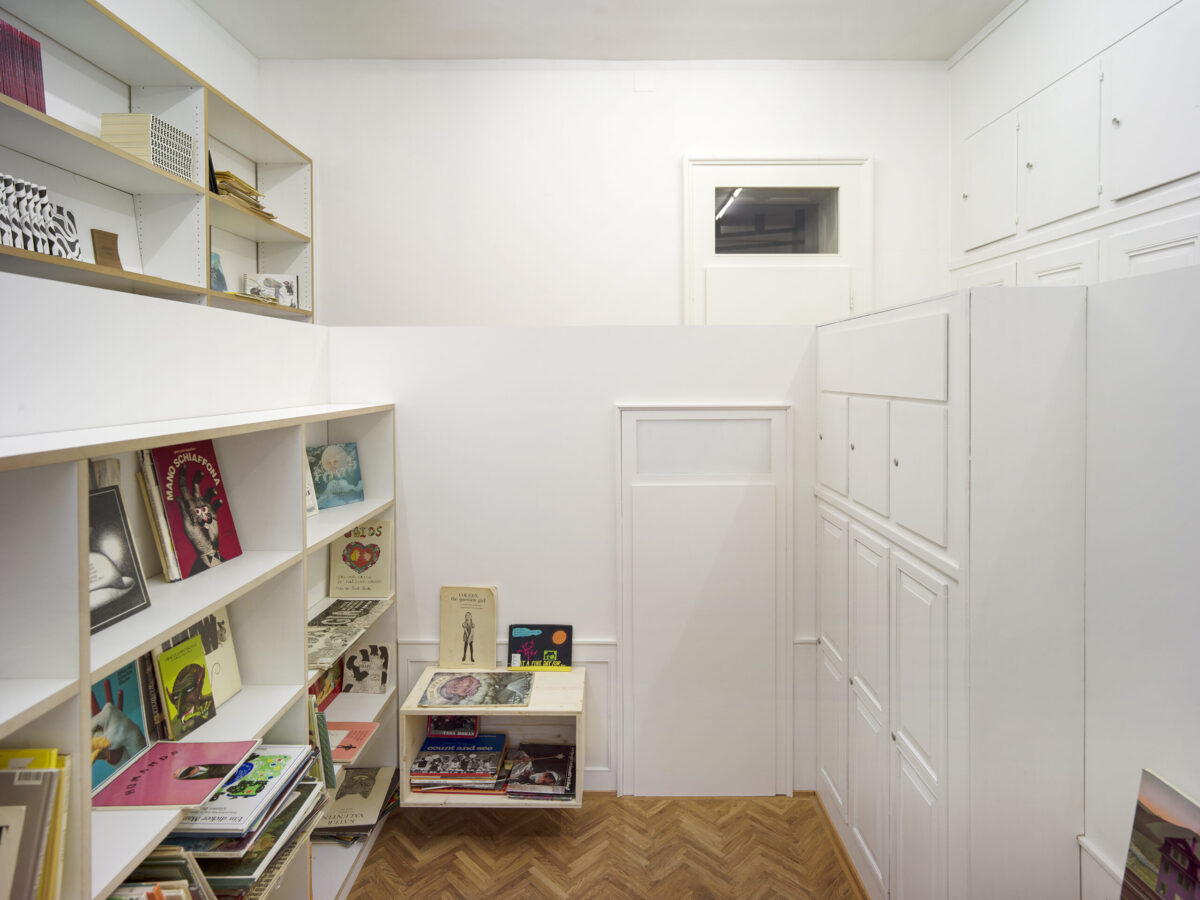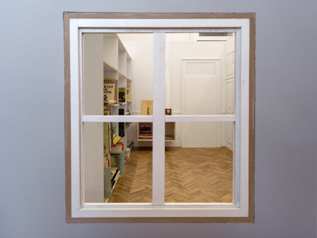 Die Büchersammlung eröffnet im ersten Raum die Ausstellung: In die bestehende Bibliothek der Stadtgalerie, mit ihrer Auswahl von Künstler*innen-Publikationen, platziert Cédric Eisenring einen weiteren Raum als Bibliothek in der Bibliothek. Es ist eine herunterskalierte Kopie desselben Raums, als ein Spiel mit Relationen, wie es in den Kinderbüchern zu finden ist – wo sich psychedelische Fieberträume mit Intertextualität und den Möglichkeiten der drucktechnischen Wiederholung vermengen.