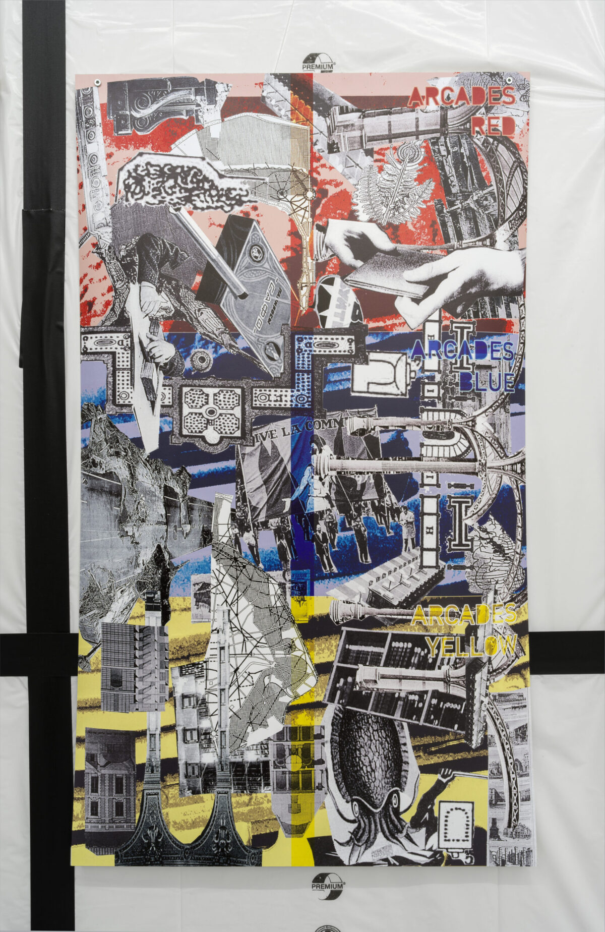 Sophie Carapetian, Refuse to Collaborate, Detailansicht, Arcades (Red, Blue, Yellow) (Illustration mit Lucy Killoran), Stadtgalerie Bern, 2022. Foto: Cedric Mussano