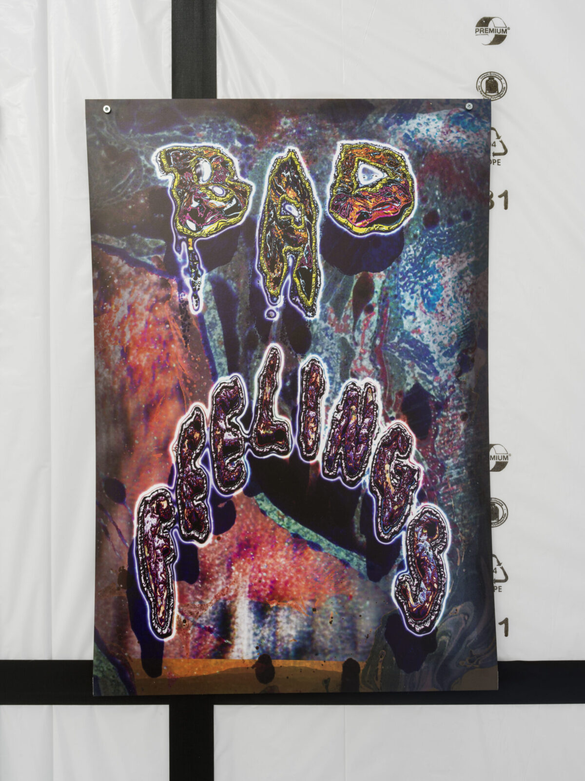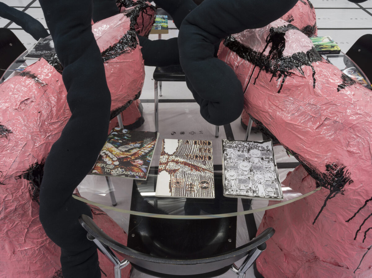 Sophie Carapetian, Refuse to Collaborate, Detailansicht, Bad Feelings - Arts Against Cuts (Illustration mit Lucy Killoran), Stadtgalerie Bern, 2022. Foto: Cedric Mussano