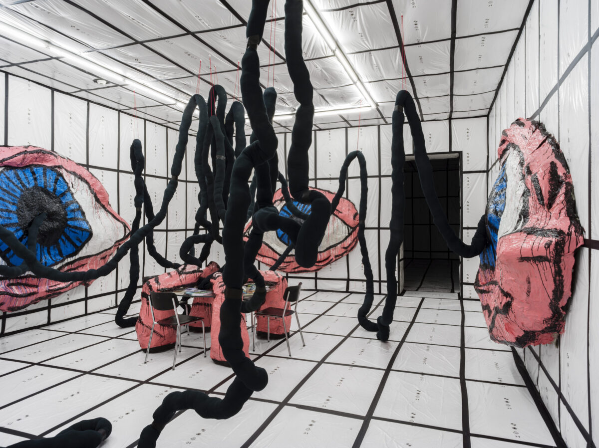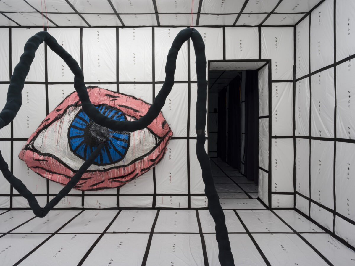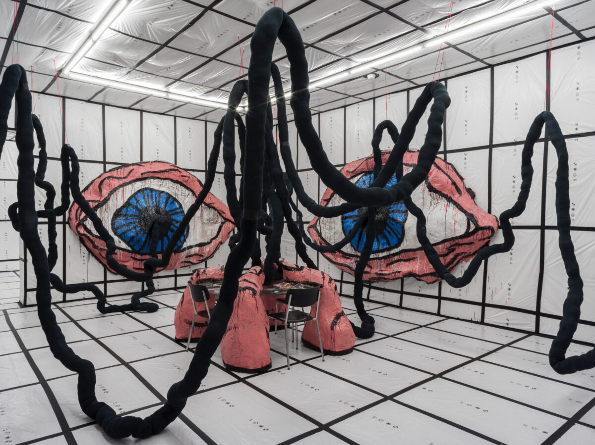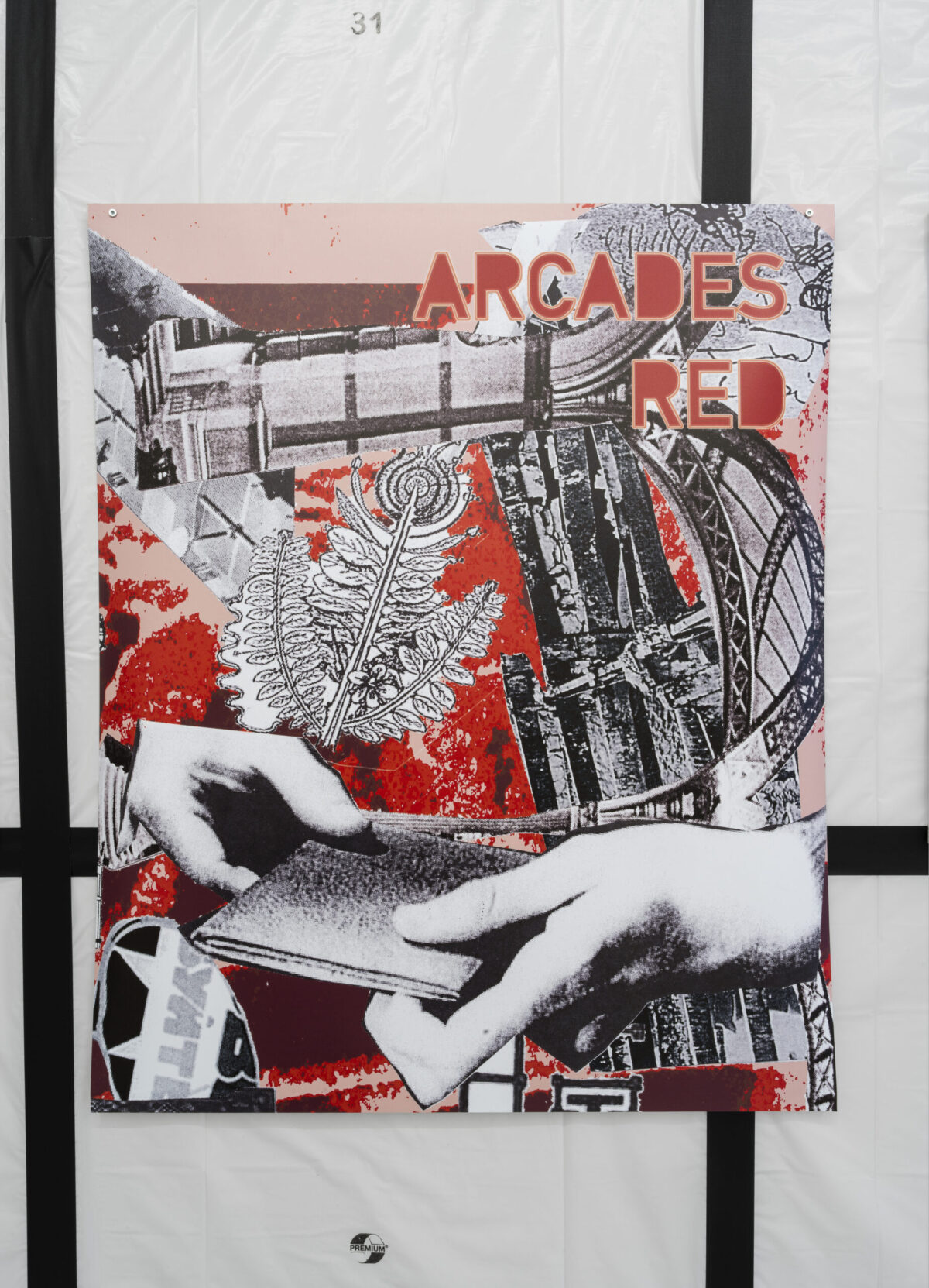 Sophie Carapetian, Refuse to Collaborate, Detailansicht, Arcades (Red, Blue, Red) (Illustration mit Lucy Killoran), Stadtgalerie Bern, 2022. Foto: Cedric Mussano
