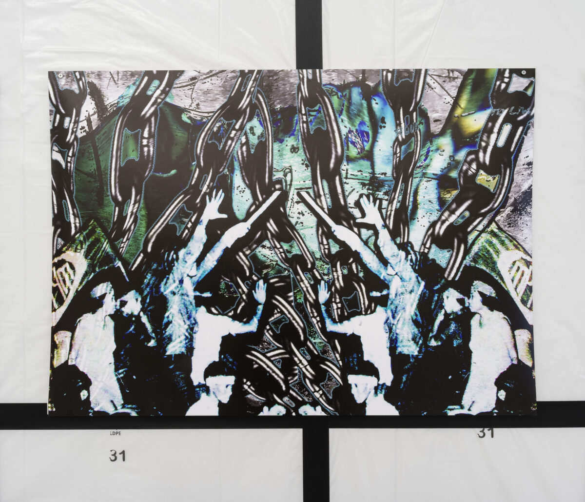 Sophie Carapetian, Refuse to Collaborate, Detailansicht, EPS: Vol. 1, No. 26 (in Zusammenarbeit mit Tom Allen), Stadtgalerie Bern, 2022. Foto: Cedric Mussano