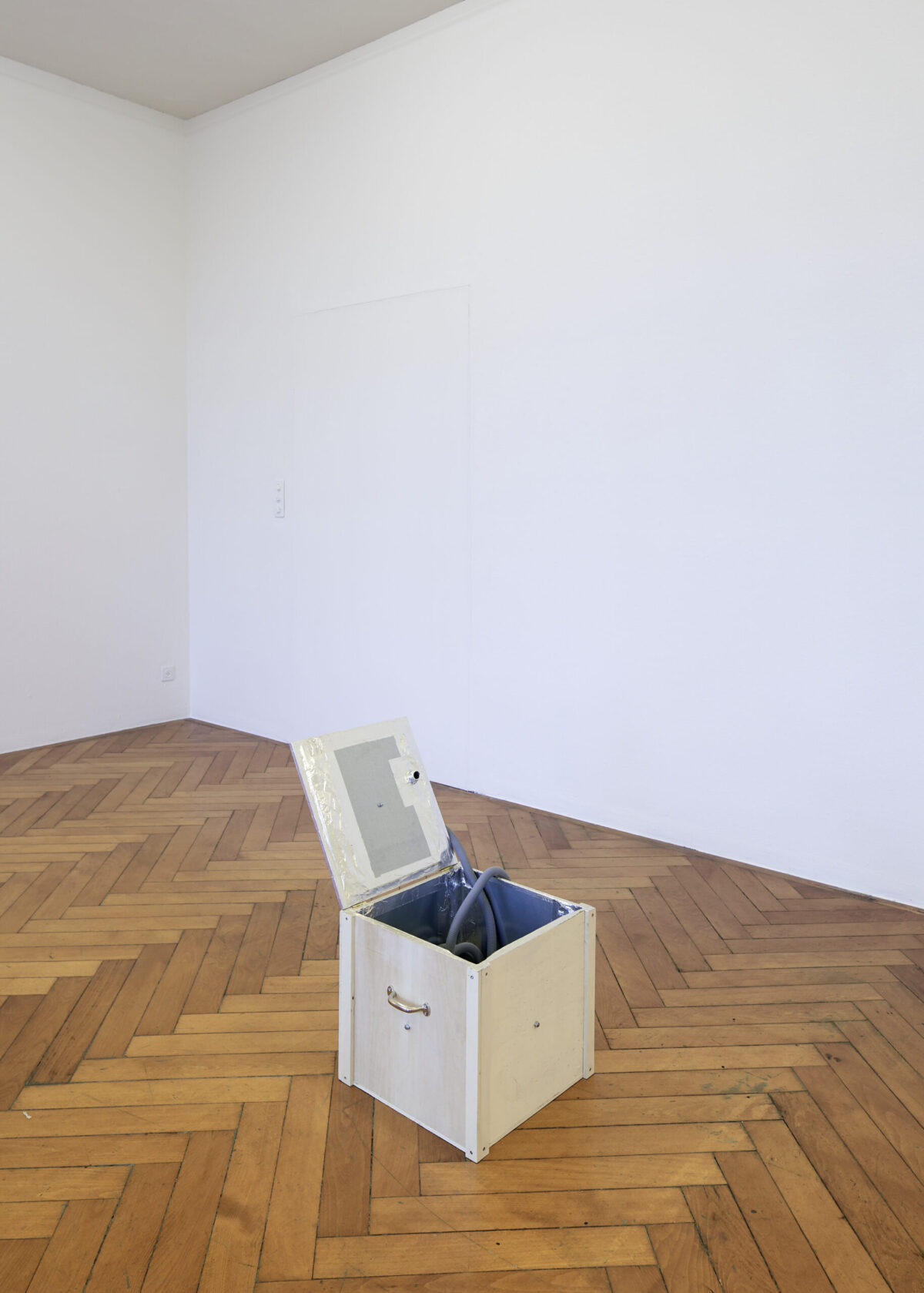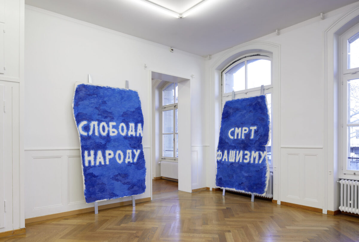 Im ersten Raum erwarten uns die zwei in kyrillischer Schrift gehaltenen Fresken „Smrt fašizmu, sloboda narodu“. Sie tragen die Grussformeln antifaschistischer jugoslawischer Partisanen: «Tod dem Faschismus, Freiheit dem Volk.» Der Blick zurück in eine sozialistische Vergangenheit wird durch aktuelle politische Realitäten geschärft. Die Worte sind im Raum abgestellt – als Fragmente einer Gesellschaftsordnung, die im Laufe der Zeit zur Dystopie wurde.