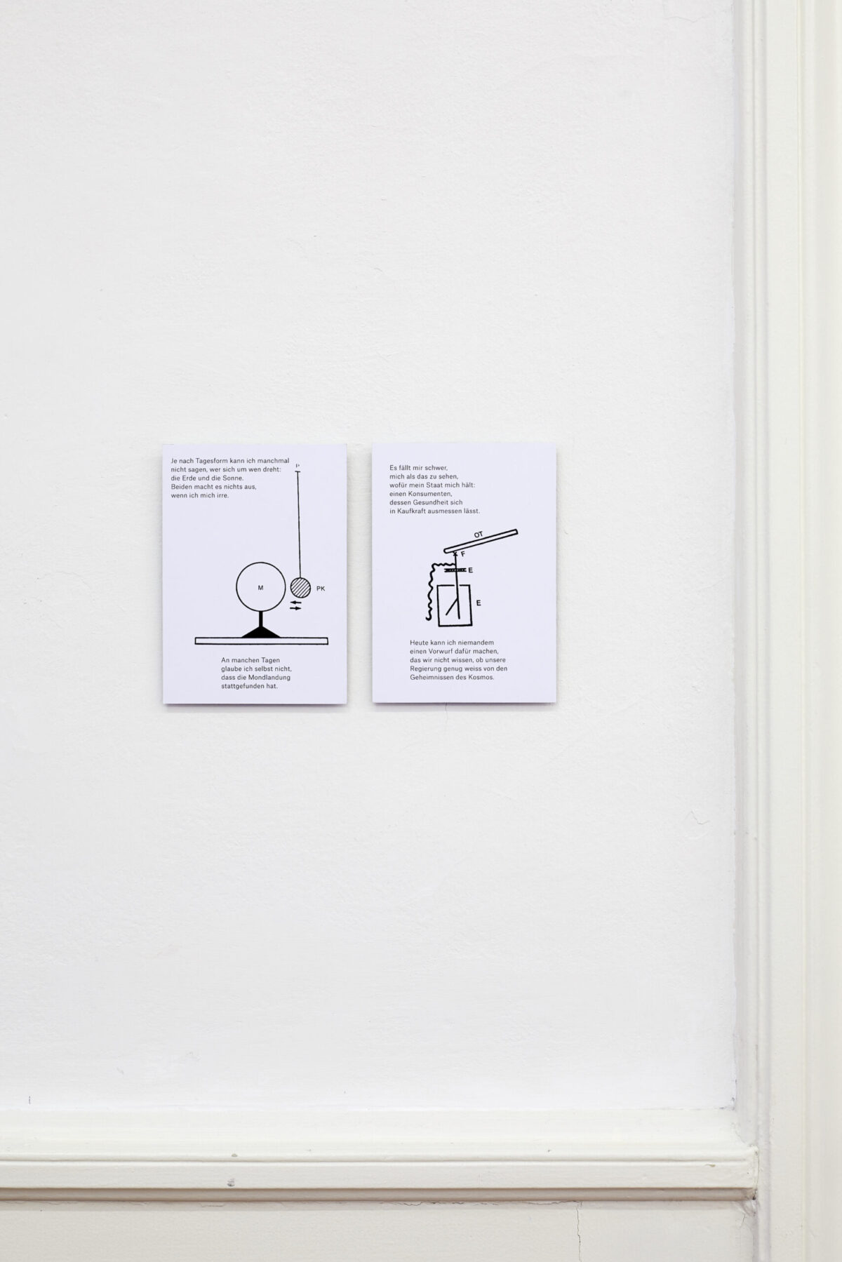 Als eine Art Metatext dient der Beitrag von Tine Melzer (*1978 in Nürnberg, lebt in Zürich und arbeitet in Zürich und Bern). Aus Gesprächen mit Mitrovic und Zeichnungen von Reich hat sie Verbindungen von Text und Bild geschaffen, die gegenüber der Flut an Symbolen und Theorien danach fragen, was das Konstrukt eigentlich vom Individuum will.