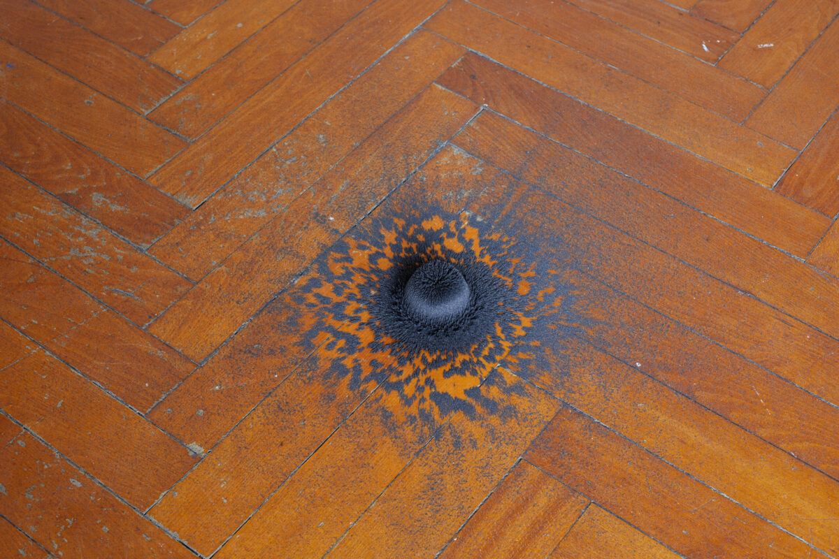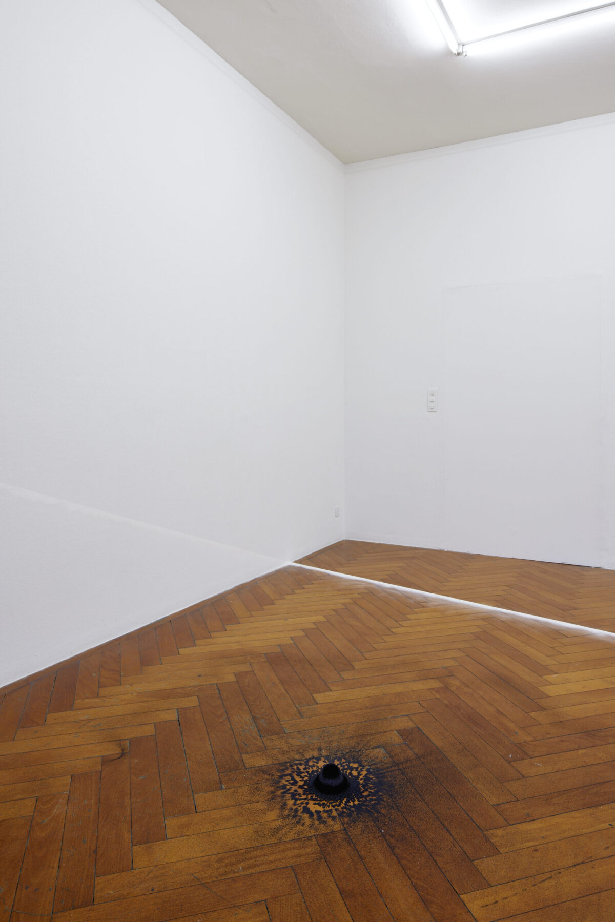Brauns Ohne Titel, eine Kugel aus stark eisenhaltigem Sand, breitet sich durch das zu Boden-Fallen kreisartig aus. Ein im Innern platzierter Magnetkern hält den Sand zusammen, so dass beim Fallen gleichzeitig die Magnetkraft und die Schwerkraft sichtbar werden. Während die durch den Aufprall verursachte Explosion eine Sandwolke um den Ball anordnet, bewirkt der Magnet eine Implosion, welche die Partikel an sich zieht. Durch die Kombination der beiden Materialien entsteht ein beweglicher Zusammenhalt, ein Begriff der sich sinnbildlich auch auf das Zusammenkommen der verschiedenen Positionen innerhalb der Ausstellung anwenden lässt. Auf die Situation der Zusammenarbeit übertragen lassen sich auch die Zeichnungen von KAREN AMANDA MOSER (*1988 in Thun, lebt und arbeitet in Antwerpen und Bern). Die Arbeit Sphere of influence, die in der Ausstellung einmal auf einen der Bürotische und einmal auf einen Raum angewandt wird, besteht aus einer Kombination zweier sich überlappender Zeichnungen. Deren Linien leiten sich von den Wandlängen ab, welche die Künstlerin auf der Fläche auslegt. Die entstehende und von beiden Zeichnungen beanspruchte Zone markiert den Moment der gegenseitigen Beeinflussung.