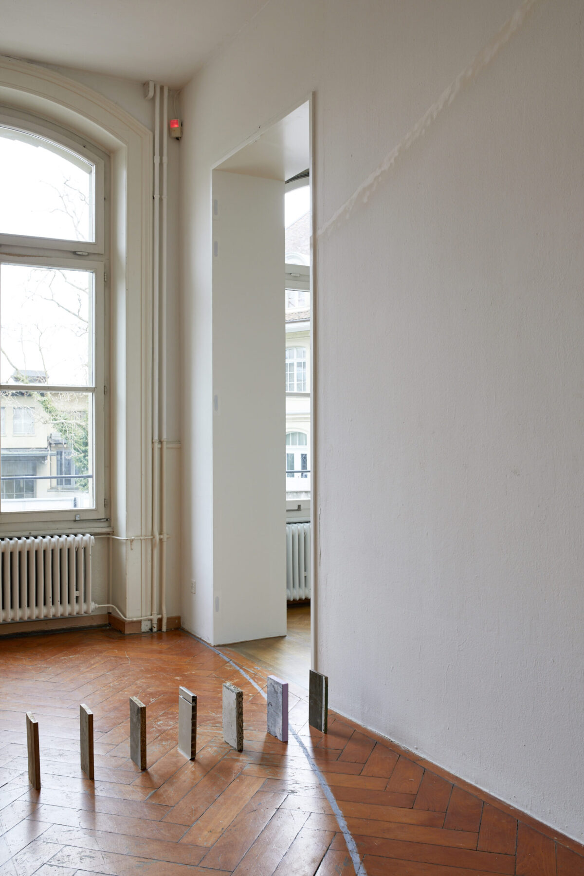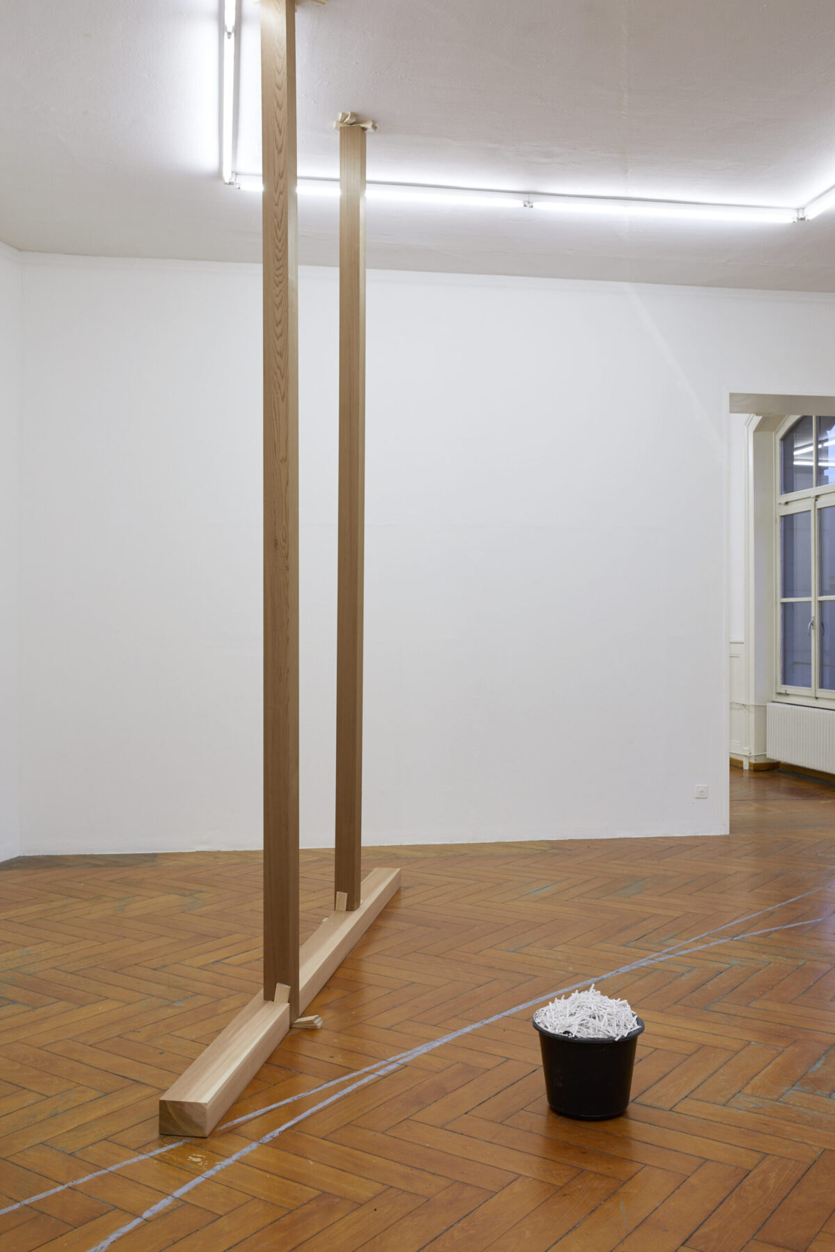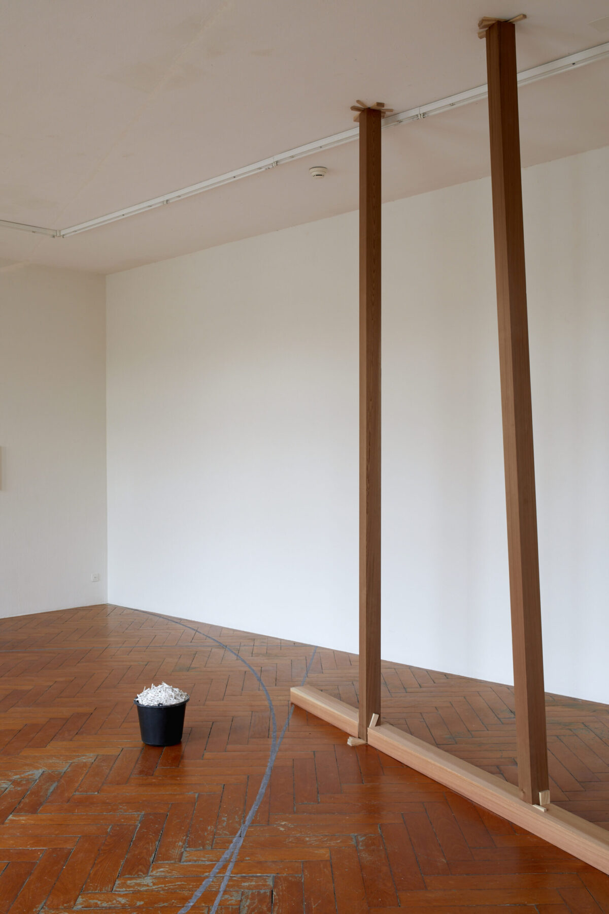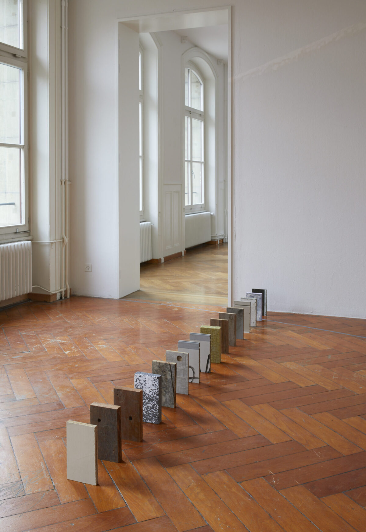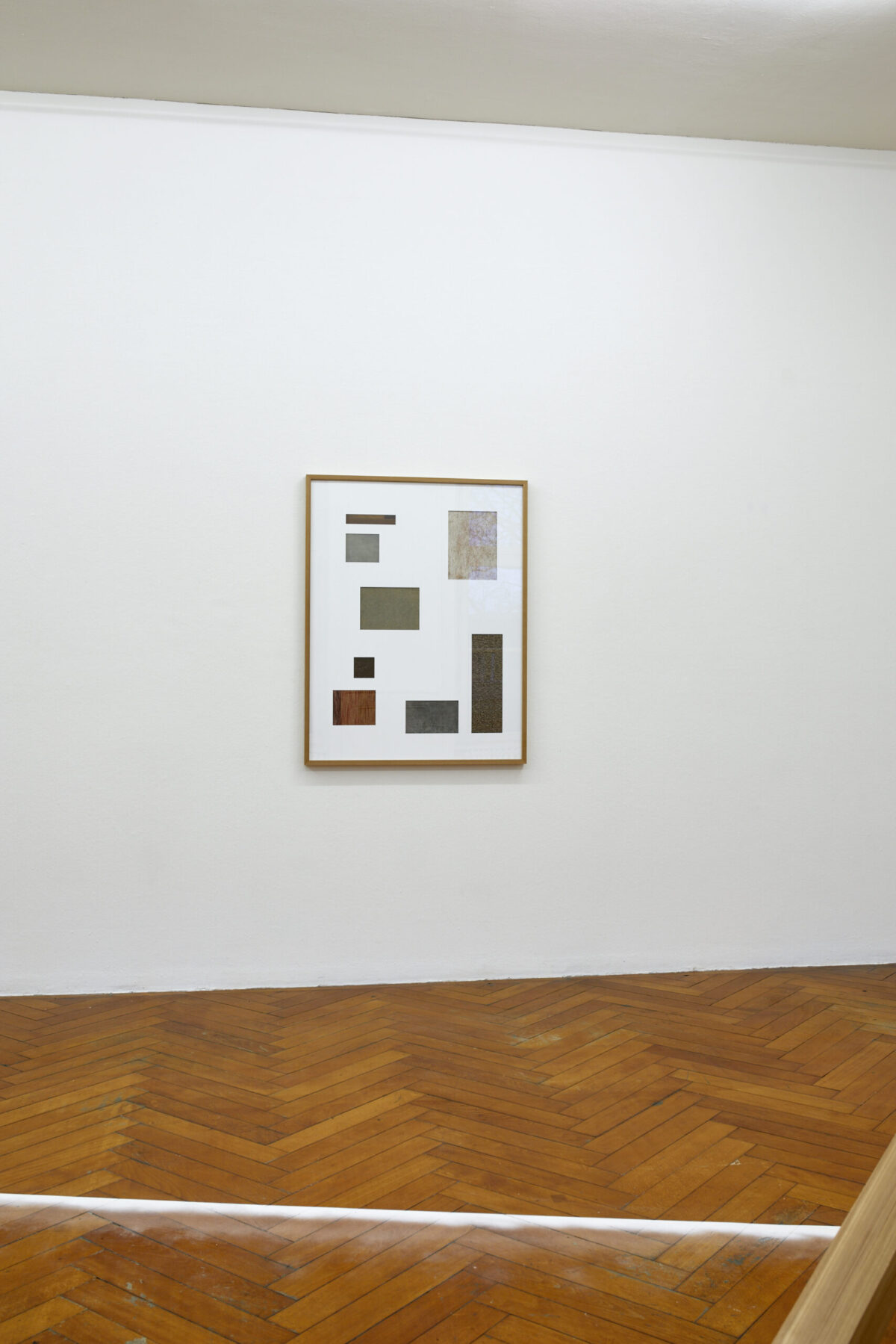 In Video ordnet LIVIA DI GIOVANNA (*1984 in Bern, lebt und arbeitet in Bern) auf das Filmformat 16:9 zugeschnittenes Fundmaterial in einer Reihe an, wobei im Gegensatz zum Film die Künstlerin die Bilder vertikal anordnet. Jeden Tag wird das hinterste Element an das vordere Ende der Reihe gesetzt. Das Werk bewegt sich dabei während der Ausstellungsdauer ähnlich eines manuell abgespielten Films durch den Raum, wobei das Bild – obwohl die meiste Zeit stillstehend – konstant auf die Bewegung verweist. Ausgehend von einer grossen Sammlung gefundenem, natürlichem und weiterverarbeitetem Material fügt MARIA TACKMANN (*1982 in Wattenwil, lebt und arbeitet in Karlsruhe) Elemente zu Kompositionen zusammen. In Composition (paramètres agiles) reduziert die Künstlerin den Raum für die Komposition auf ein Bild. Dieses definiert sich durch einen Bildrahmen, der aus dem Restholz von Kühnis Arbeit entstand und der sich in seinem Format auf das Seitenverhältnis eines Raumes in der Ausstellung bezieht. In ihrer variablen Komposition greift Tackmann fragmentarisch Materialien der Ausstellung wieder auf und stellt sie in einen neuen Zusammenhang.