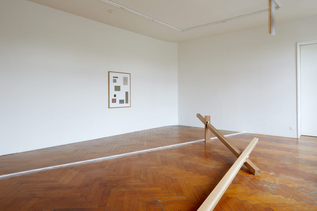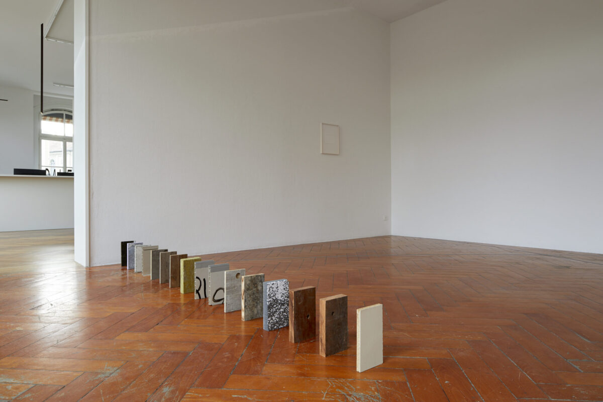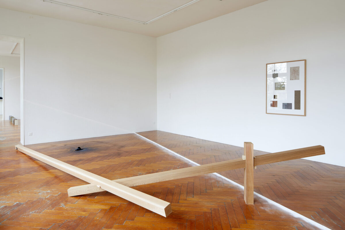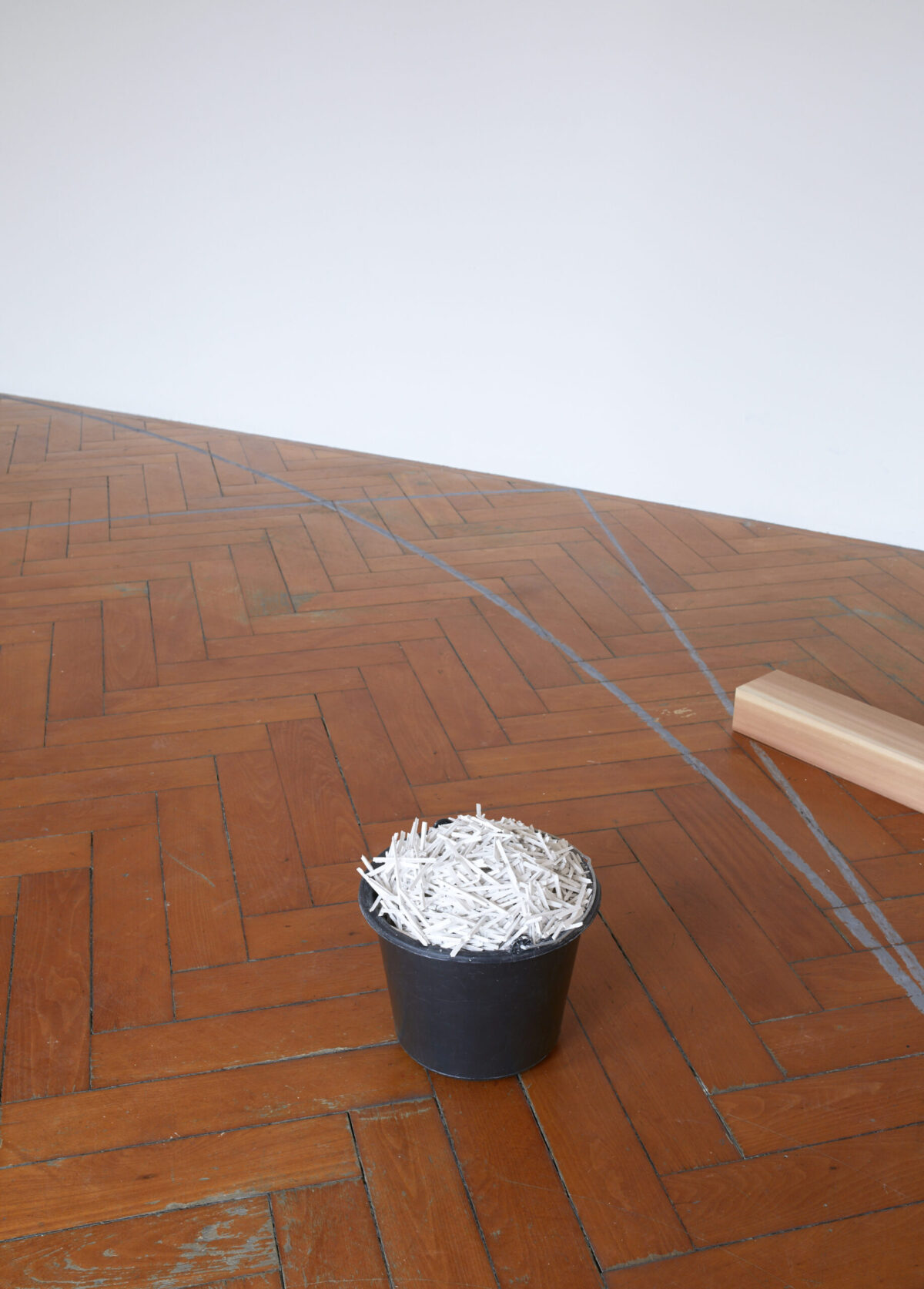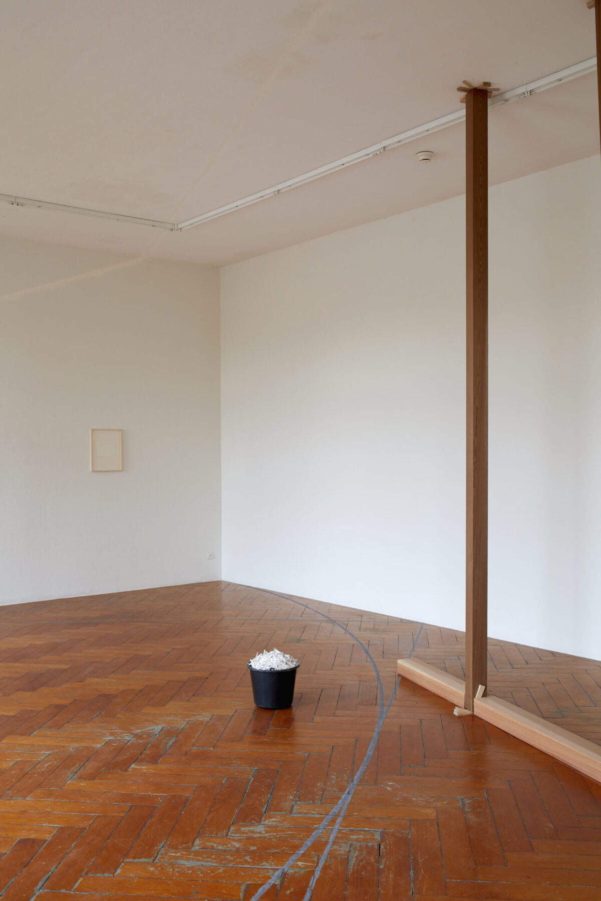 In Video ordnet LIVIA DI GIOVANNA (*1984 in Bern, lebt und arbeitet in Bern) auf das Filmformat 16:9 zugeschnittenes Fundmaterial in einer Reihe an, wobei im Gegensatz zum Film die Künstlerin die Bilder vertikal anordnet. Jeden Tag wird das hinterste Element an das vordere Ende der Reihe gesetzt. Das Werk bewegt sich dabei während der Ausstellungsdauer ähnlich eines manuell abgespielten Films durch den Raum, wobei das Bild – obwohl die meiste Zeit stillstehend – konstant auf die Bewegung verweist. Ausgehend von einer grossen Sammlung gefundenem, natürlichem und weiterverarbeitetem Material fügt MARIA TACKMANN (*1982 in Wattenwil, lebt und arbeitet in Karlsruhe) Elemente zu Kompositionen zusammen. In Composition (paramètres agiles) reduziert die Künstlerin den Raum für die Komposition auf ein Bild. Dieses definiert sich durch einen Bildrahmen, der aus dem Restholz von Kühnis Arbeit entstand und der sich in seinem Format auf das Seitenverhältnis eines Raumes in der Ausstellung bezieht. In ihrer variablen Komposition greift Tackmann fragmentarisch Materialien der Ausstellung wieder auf und stellt sie in einen neuen Zusammenhang.